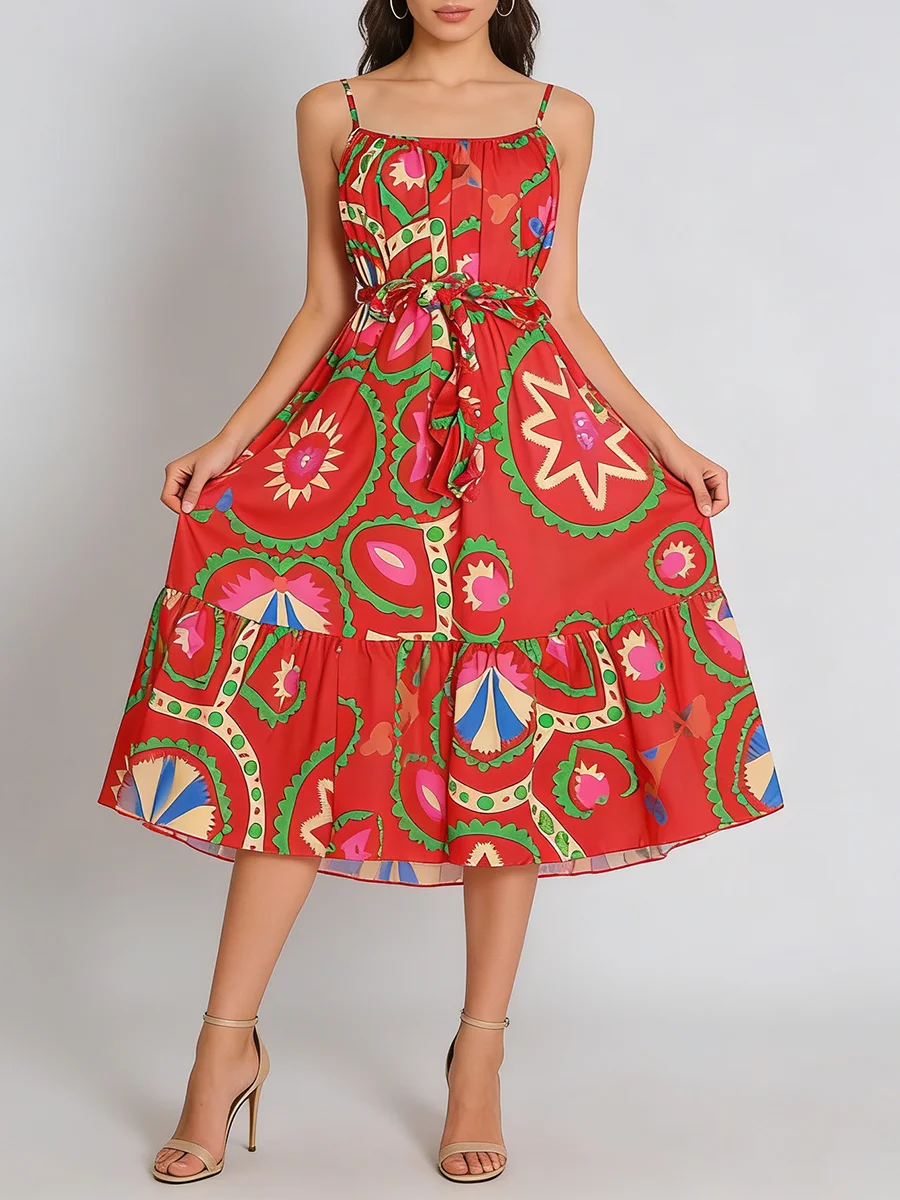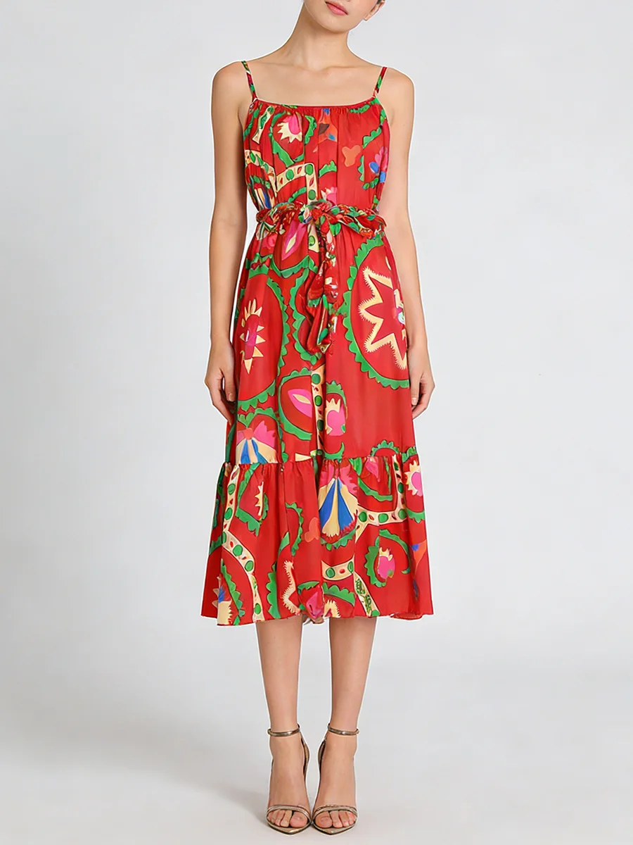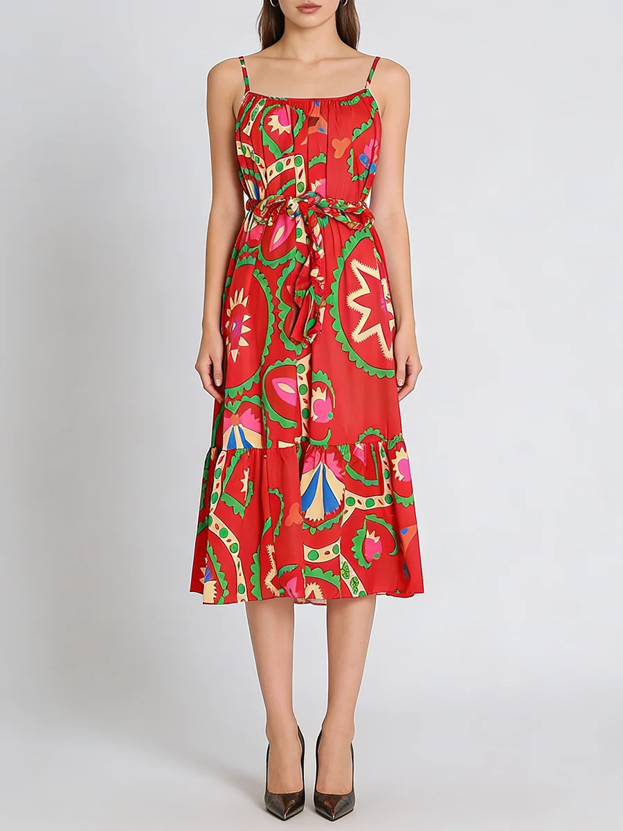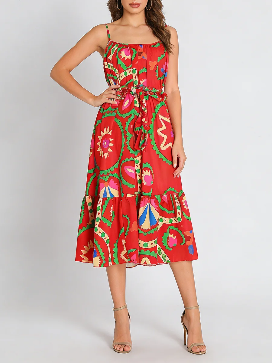 TWOTWINSTYLE Fashion Printing Spliced Ruched Long Dress for Women Square Neck Sleeveless Patchwork Lace Up Casual Dress Female