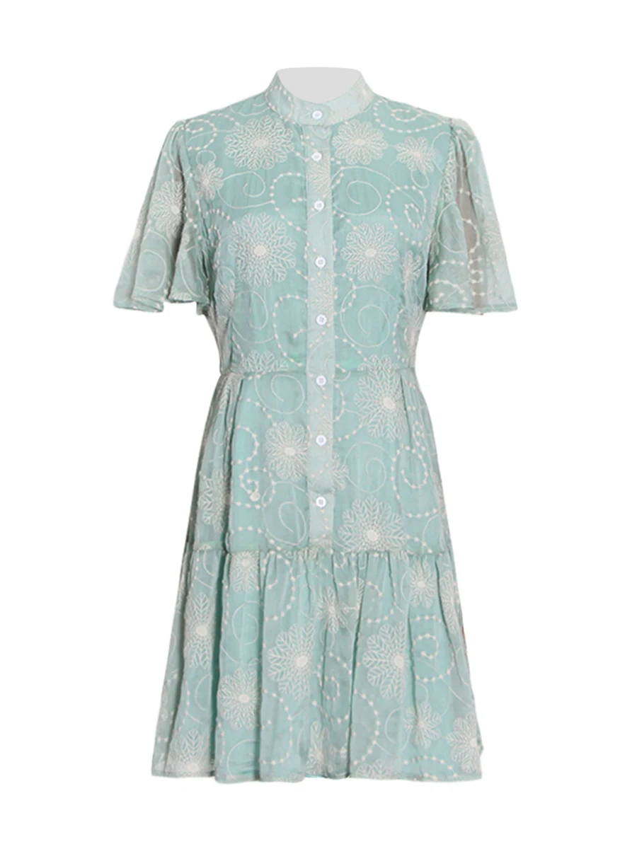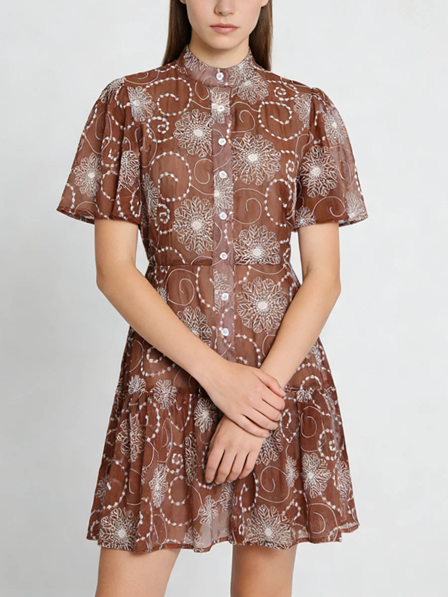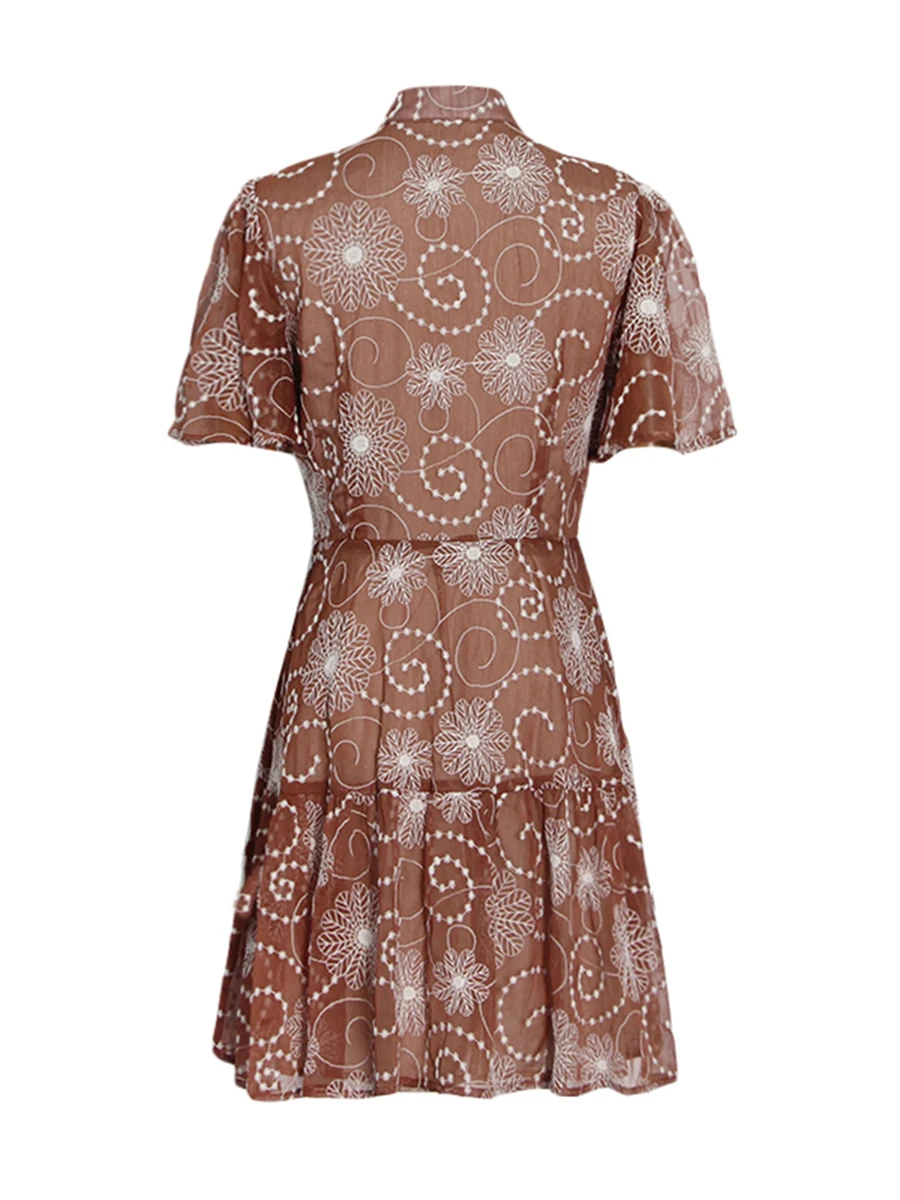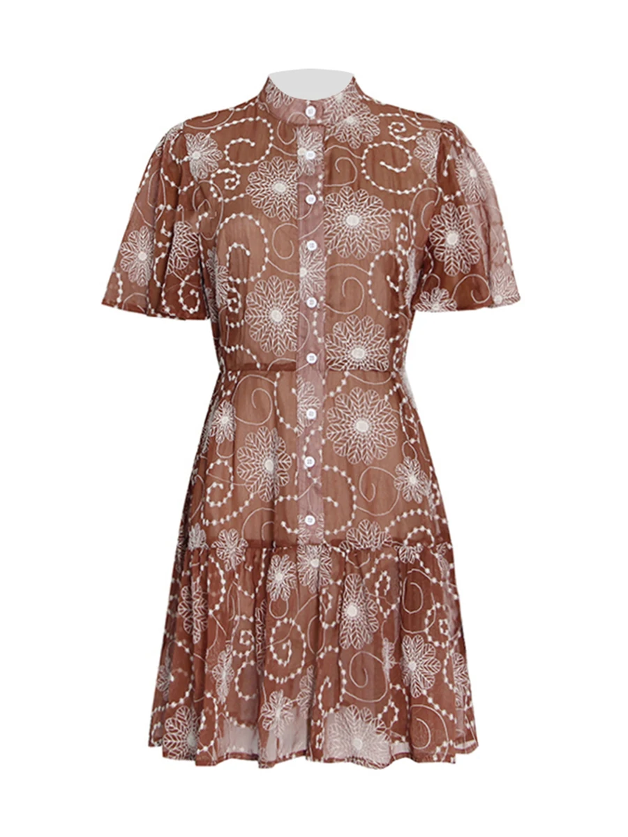 TWOTWINSTYLE Fashion Sheer Spliced Buttons Vintage Dress for Women O Neck Short Sleeves Tunic Patchwork Ruched Dresses Female