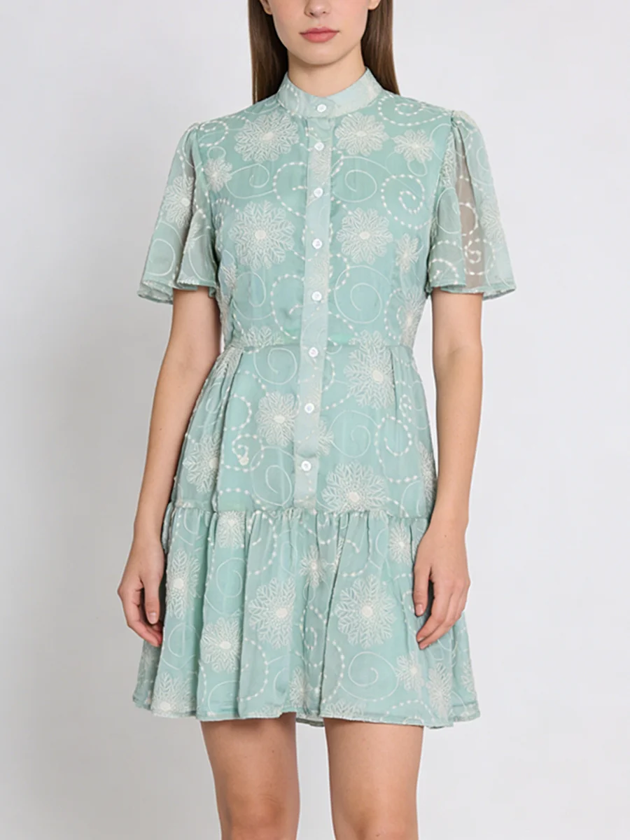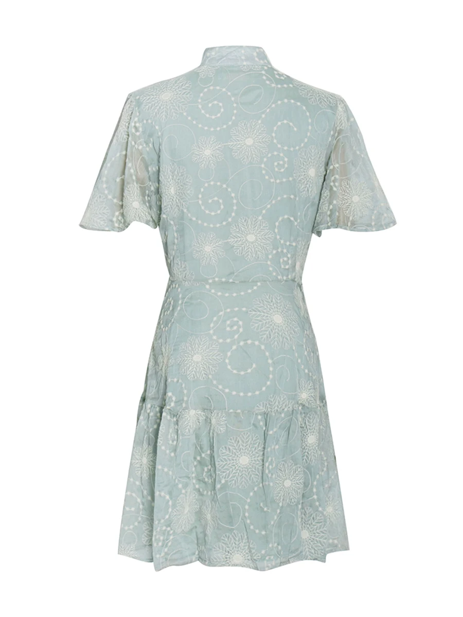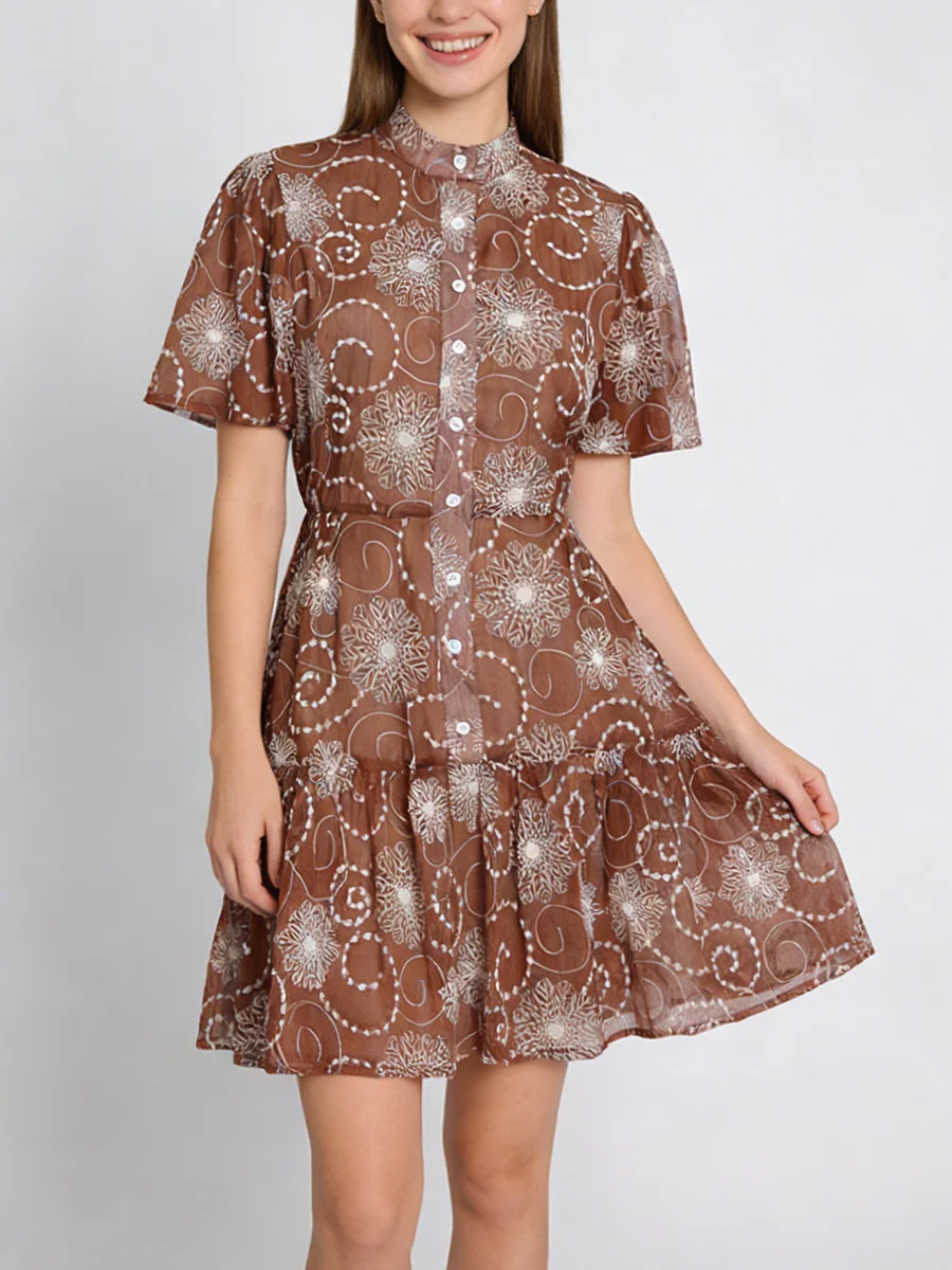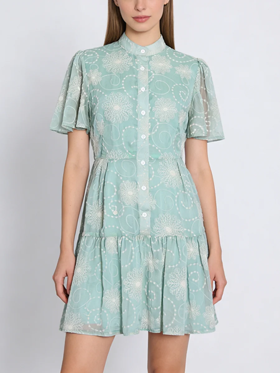 TWOTWINSTYLE Fashion Sheer Spliced Buttons Vintage Dress for Women O Neck Short Sleeves Tunic Patchwork Ruched Dresses Female