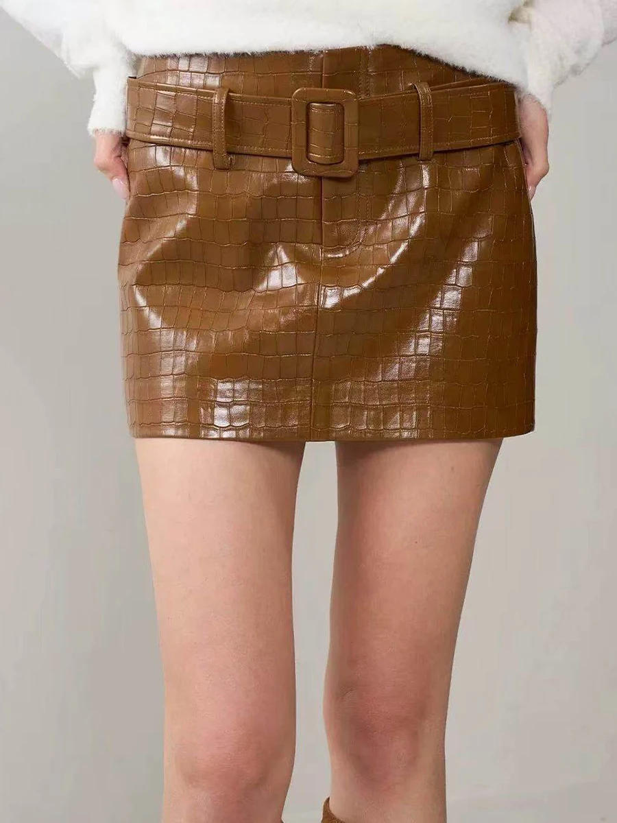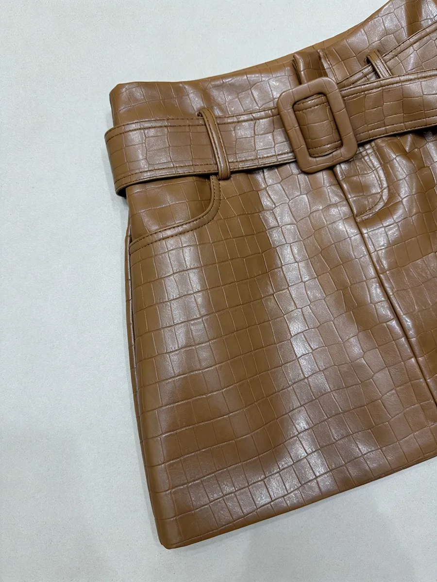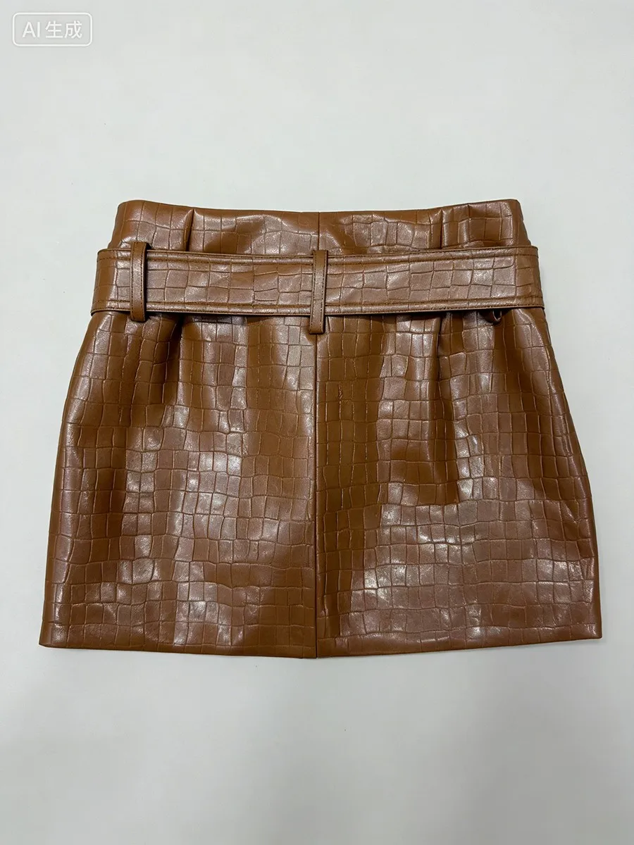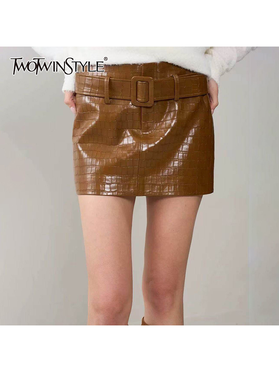 TWOTWINSTYLE Fashion Slimming Spliced Belt Leather Skirts for Women High Waist Patchwork Pockets Temperament Mini Skirt Female