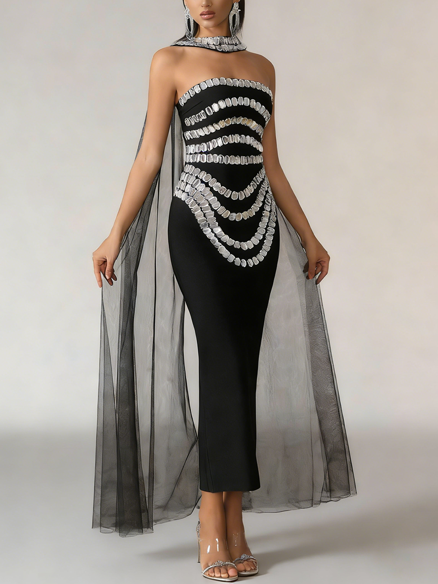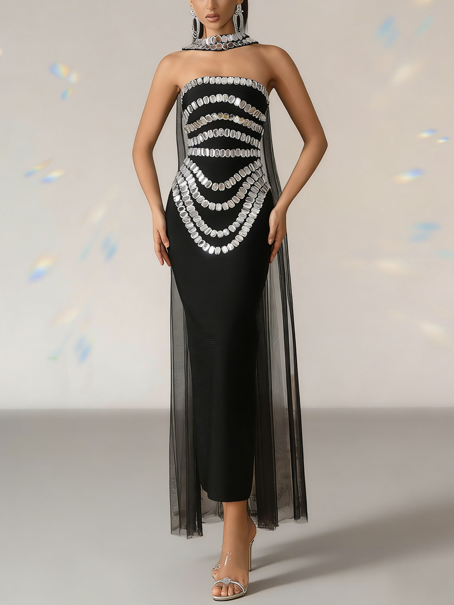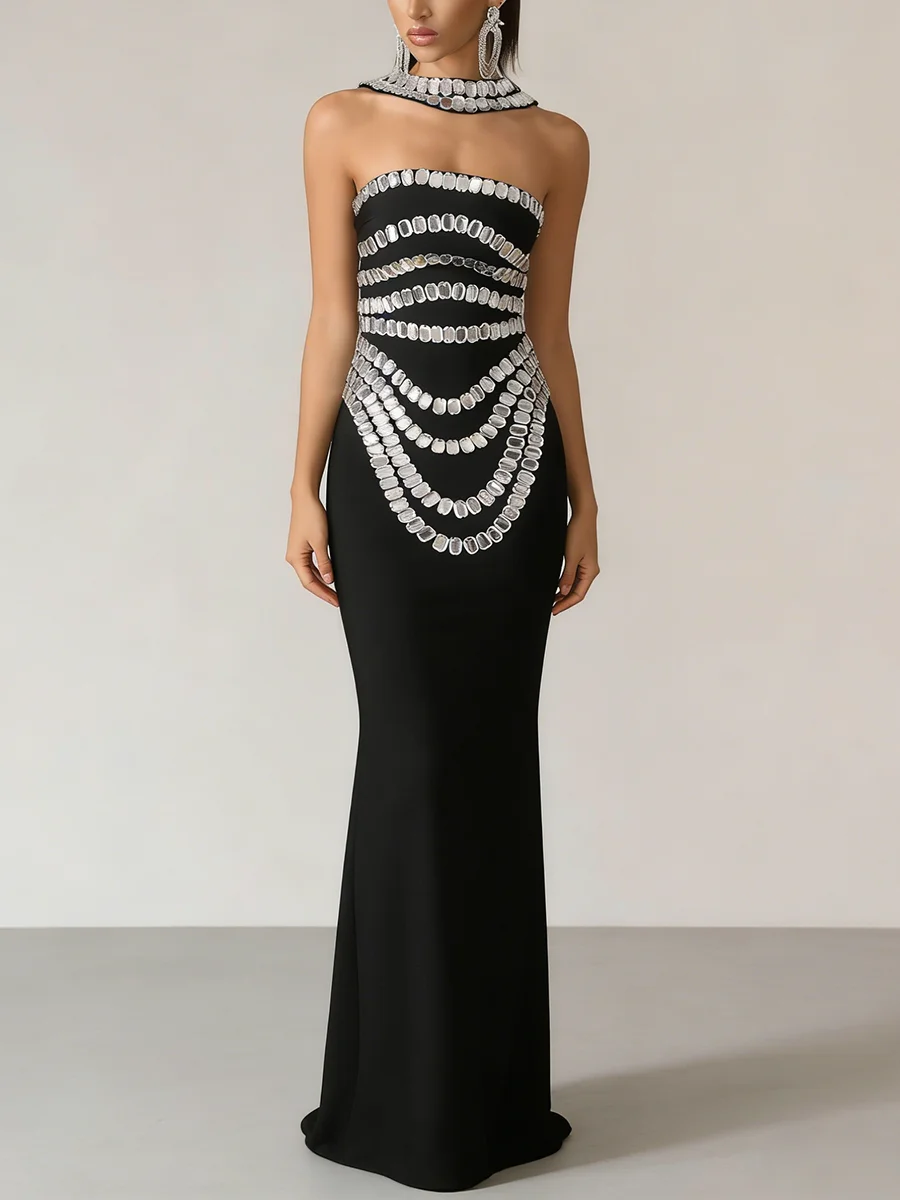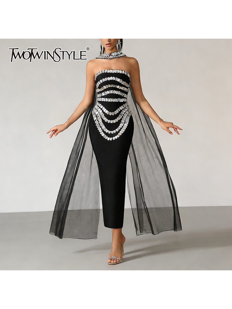 TWOTWINSTYLE Fashion Spliced Bead Luxurious Long Dresses for Women Strapless Sleeveless High Waist Patchwork Ribbon Dress Female