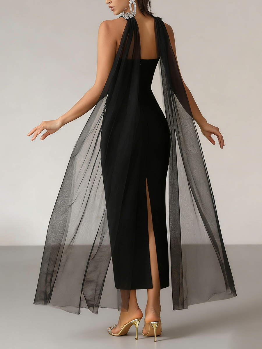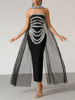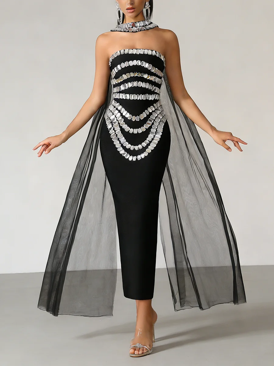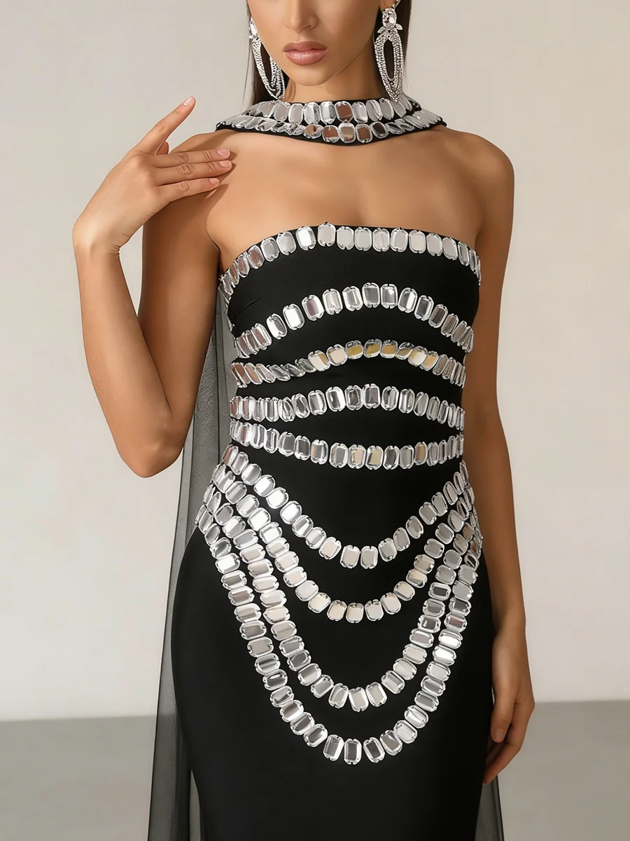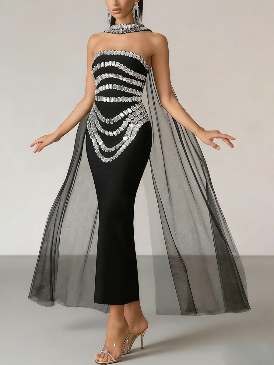 TWOTWINSTYLE Fashion Spliced Bead Luxurious Long Dresses for Women Strapless Sleeveless High Waist Patchwork Ribbon Dress Female