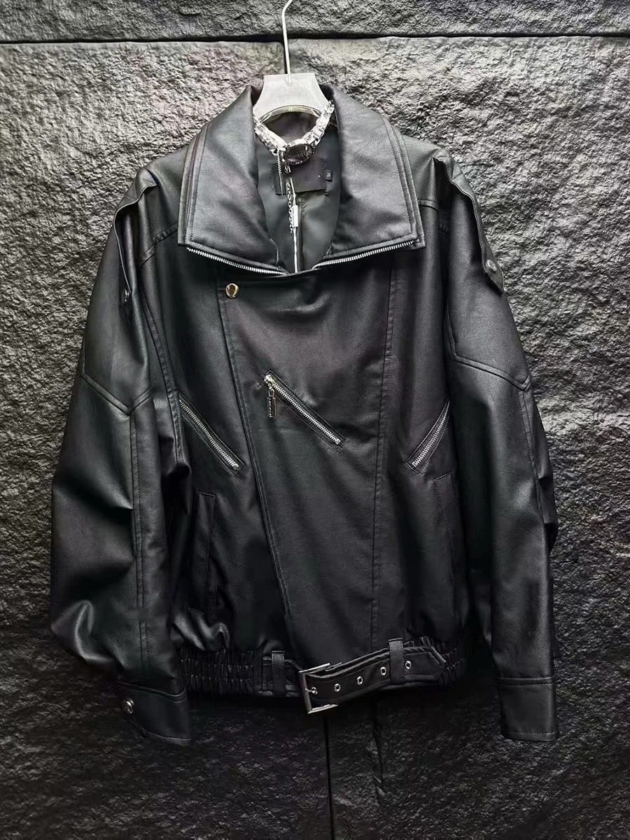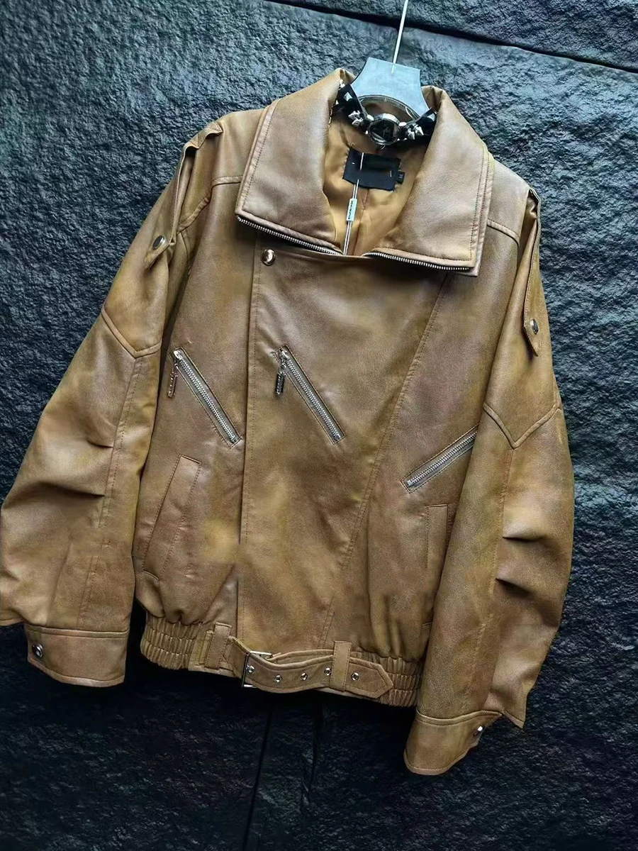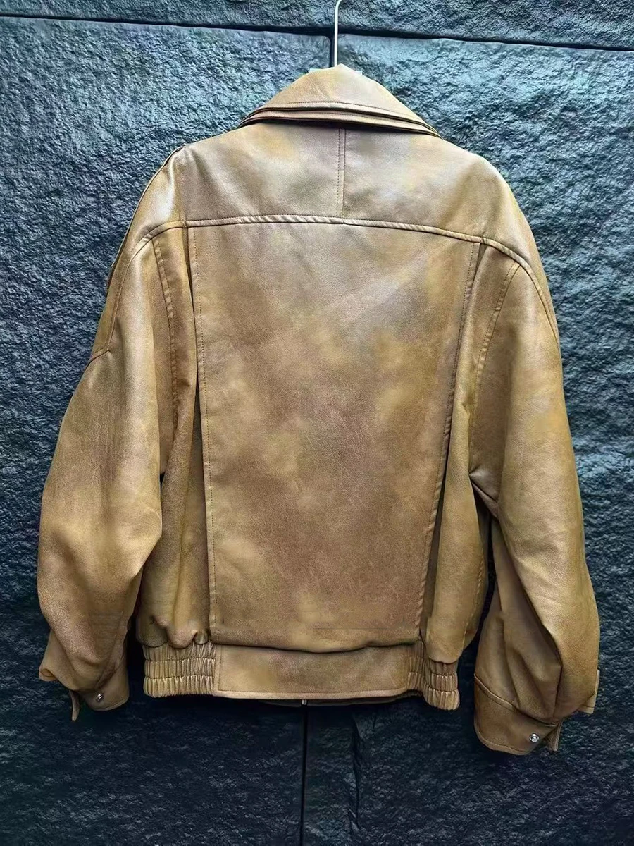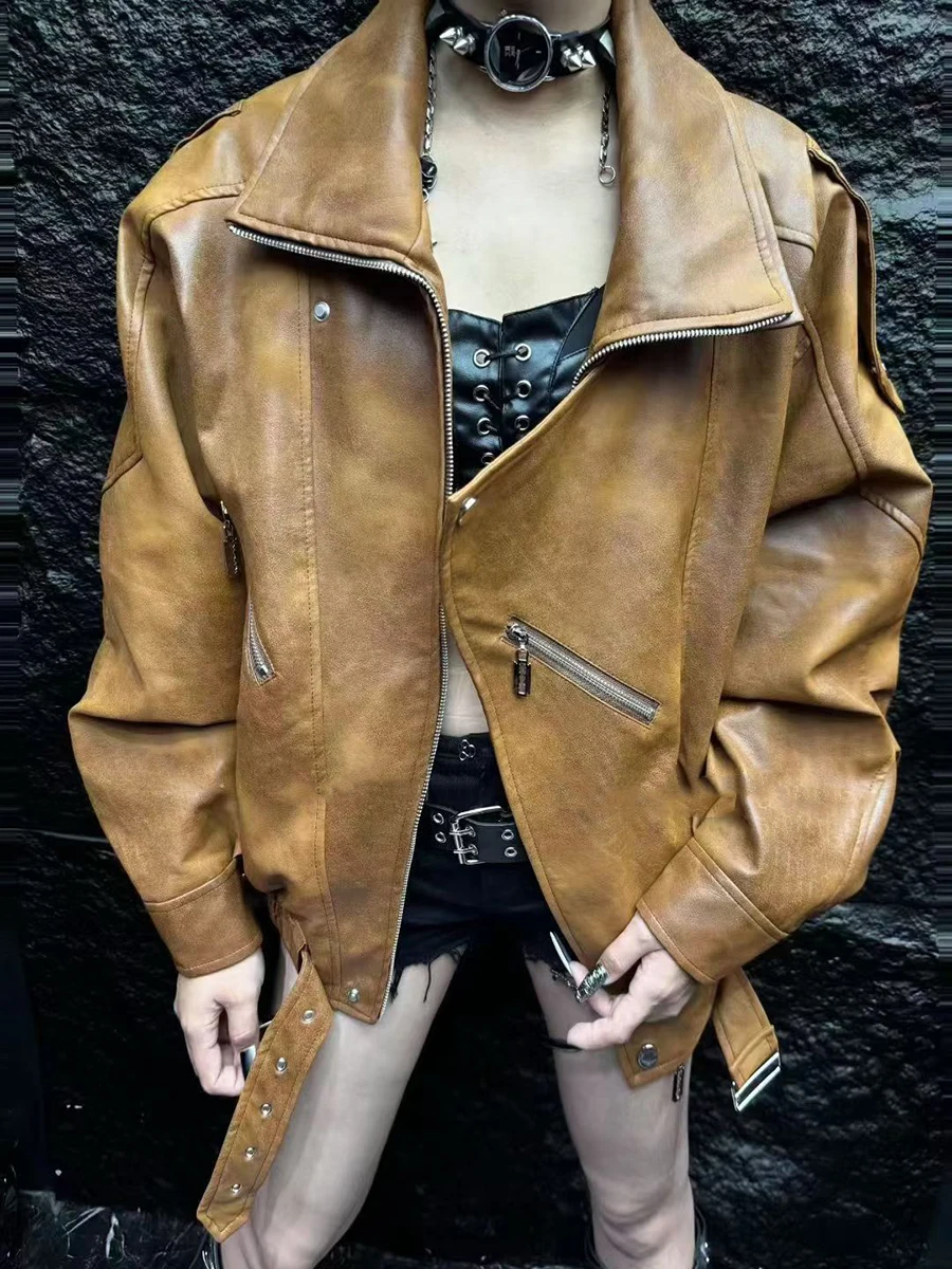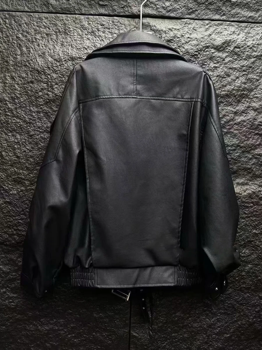 TWOTWINSTYLE Fashion Spliced Zippers Leather Jackets for Women Lapel Long Sleeves Patchwork Elastic Waist Jacket Female Clothing