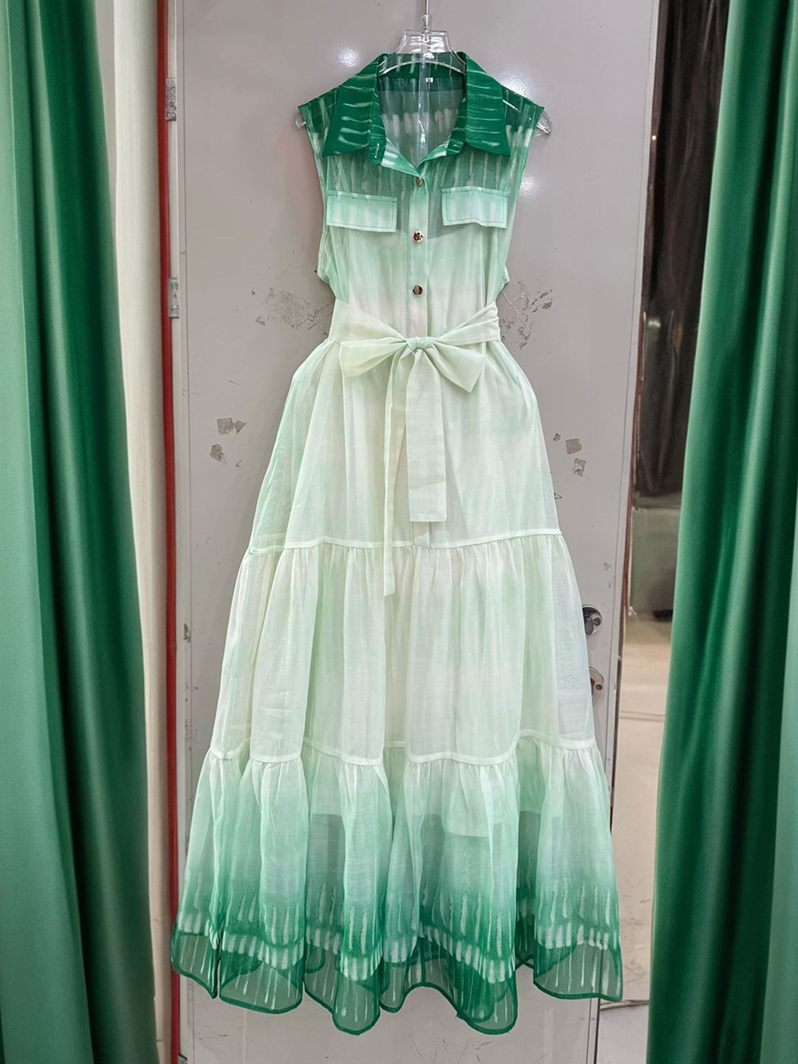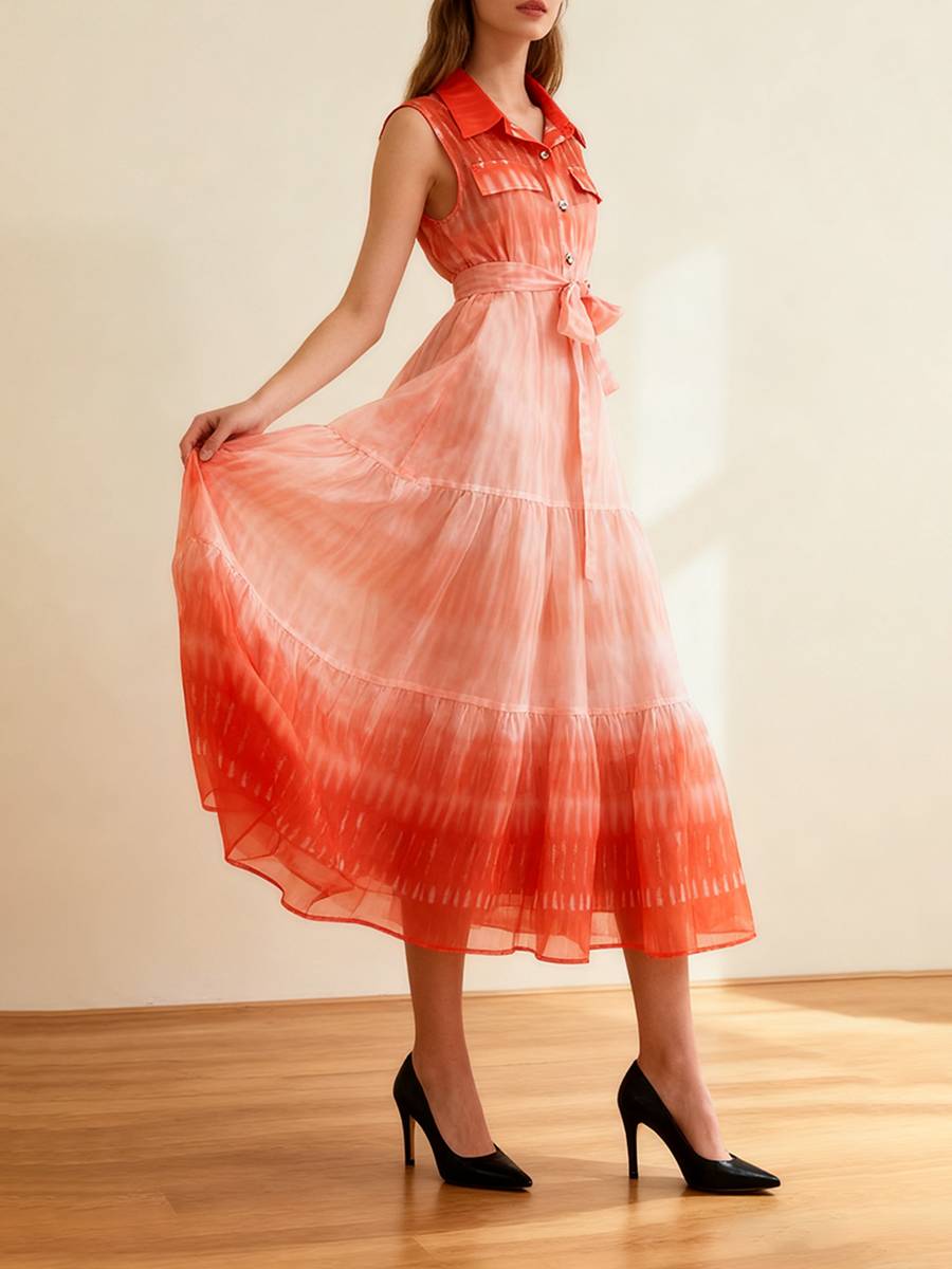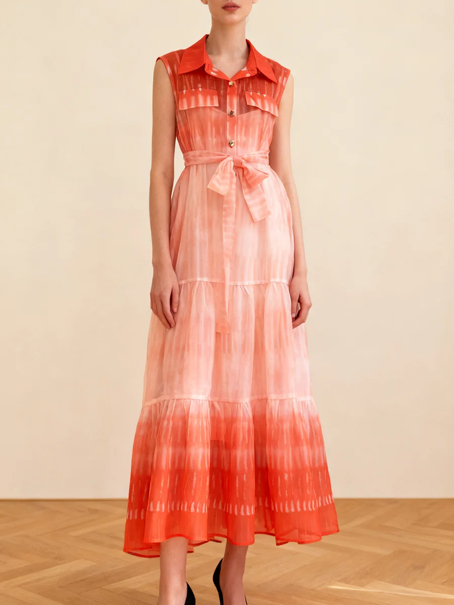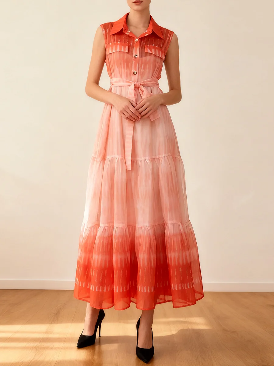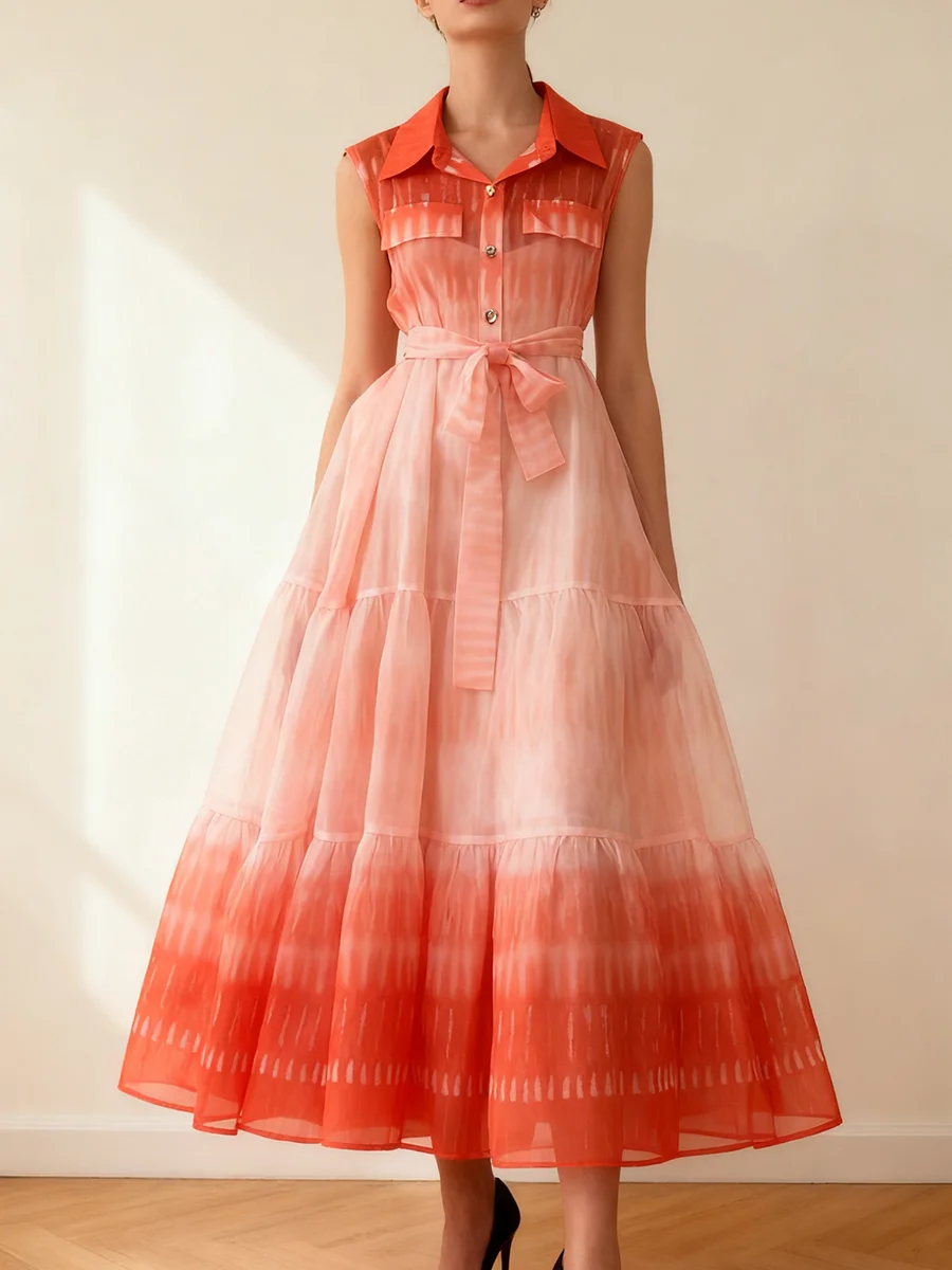 TWOTWINSTYLE Gradient Spliced Lace Up Fashion Dresses for Women Lapel Sleeveless Patchwork Buttons Casual Dress Female Clothing