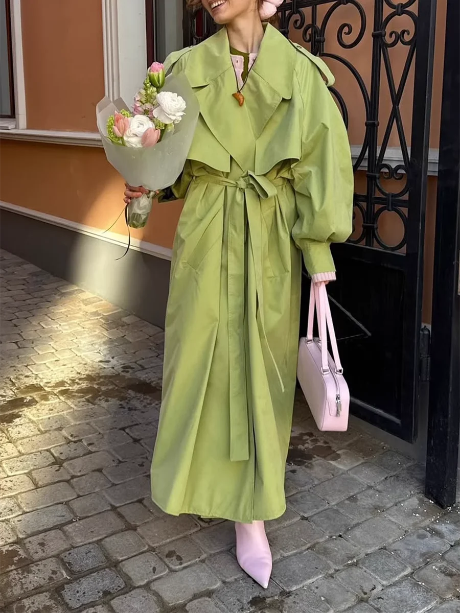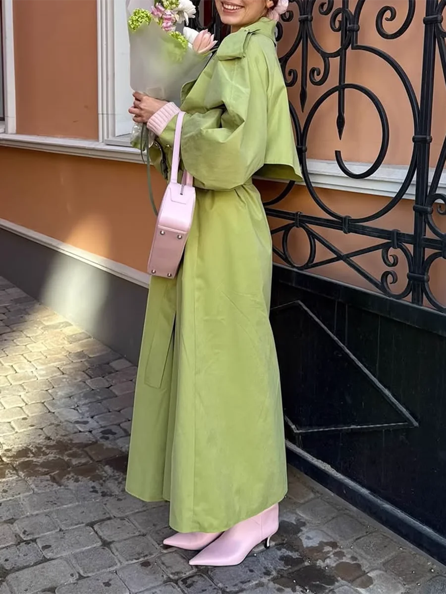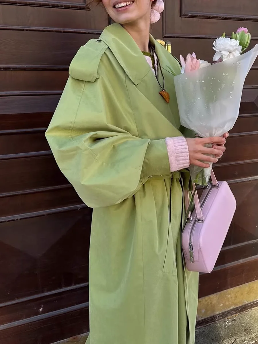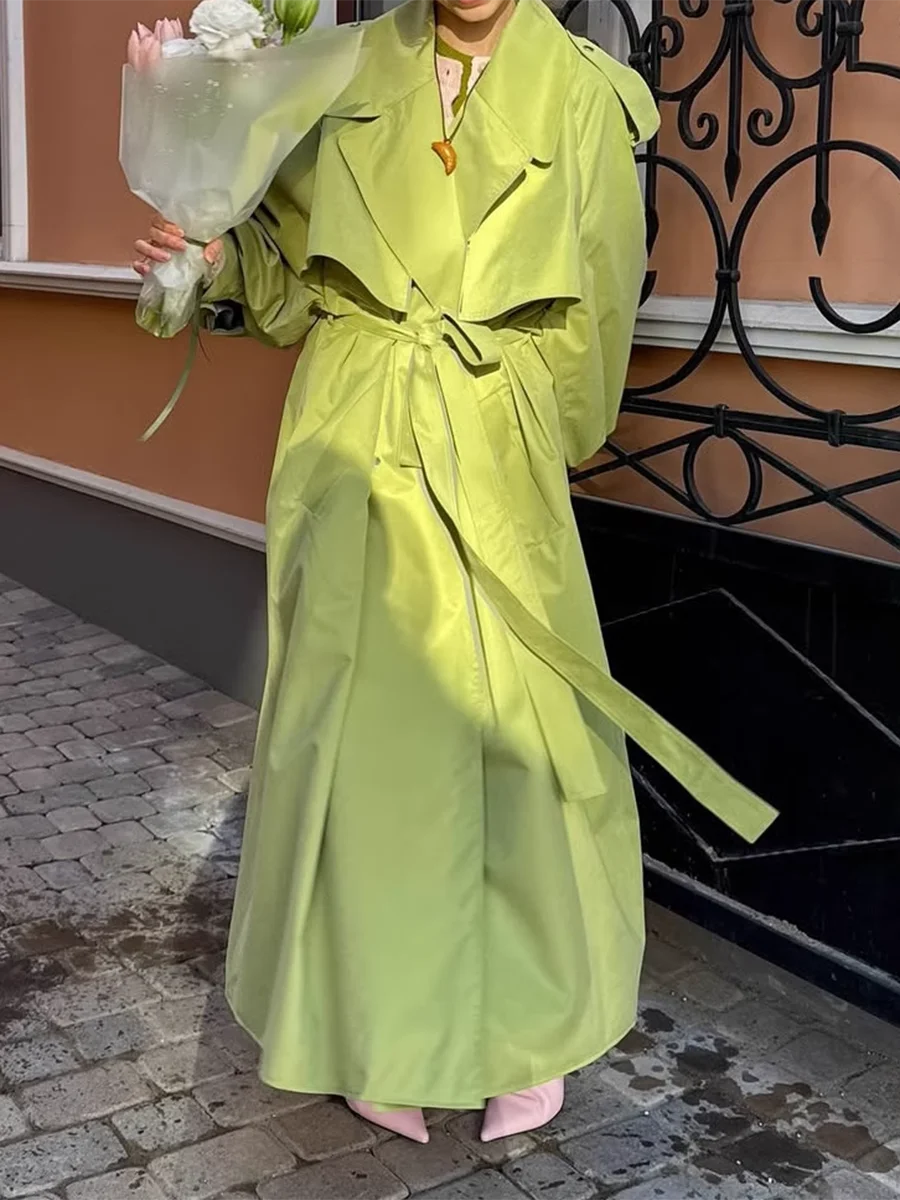 TWOTWINSTYLE Green Loose Spliced Lace Up Minimalist Trenchs for Women Lapel Long Sleeves Temperament Trench Female Clothing New
