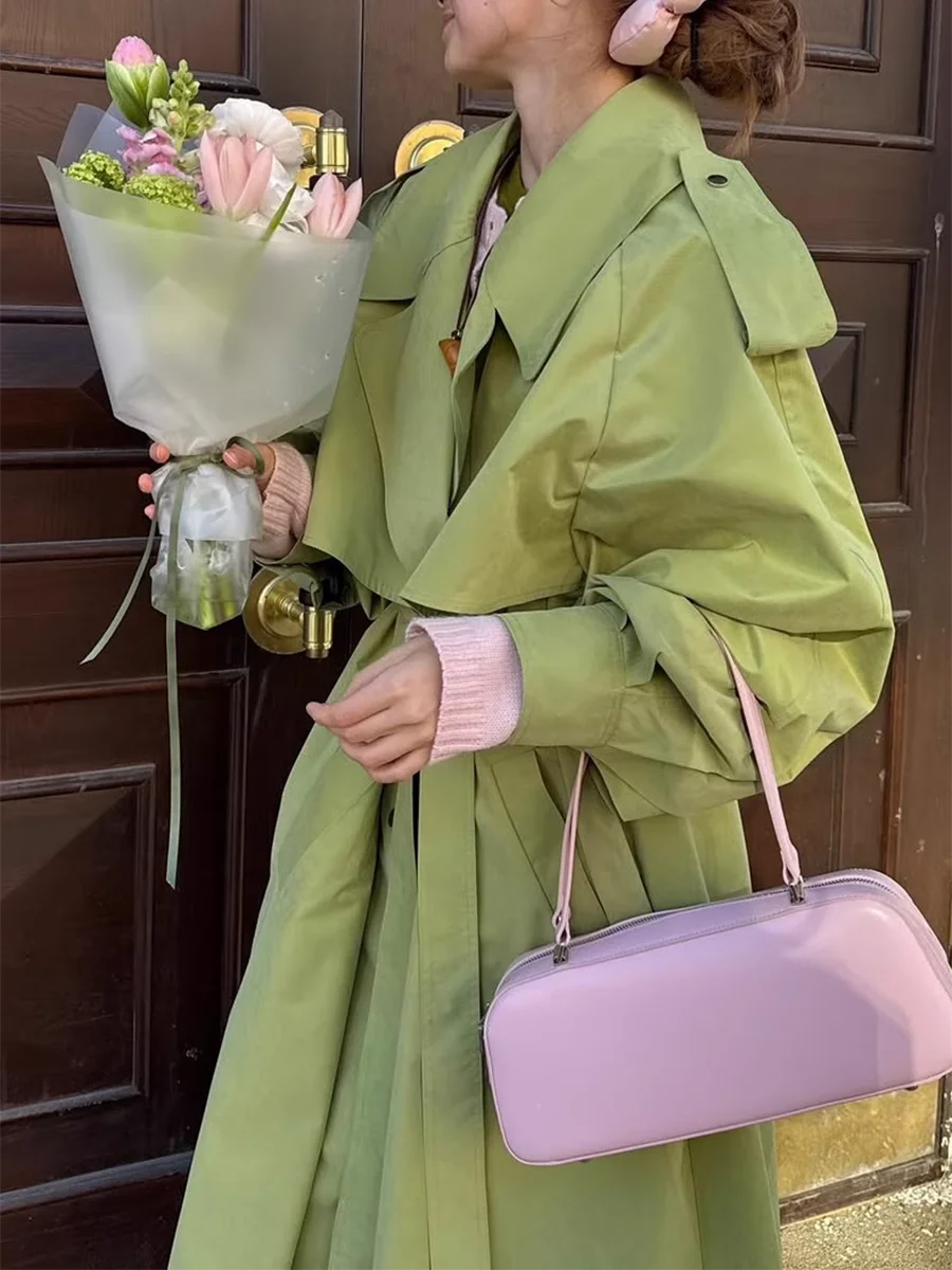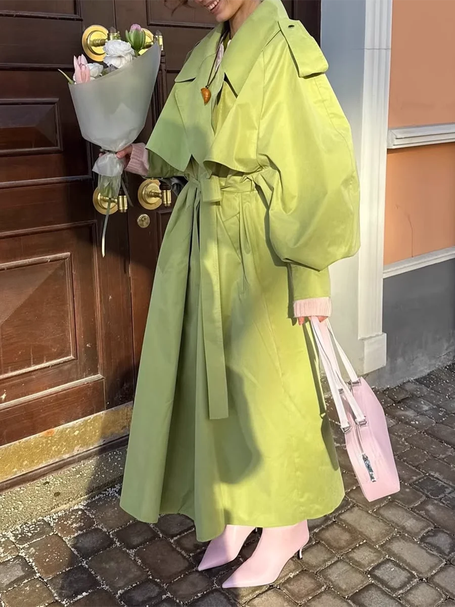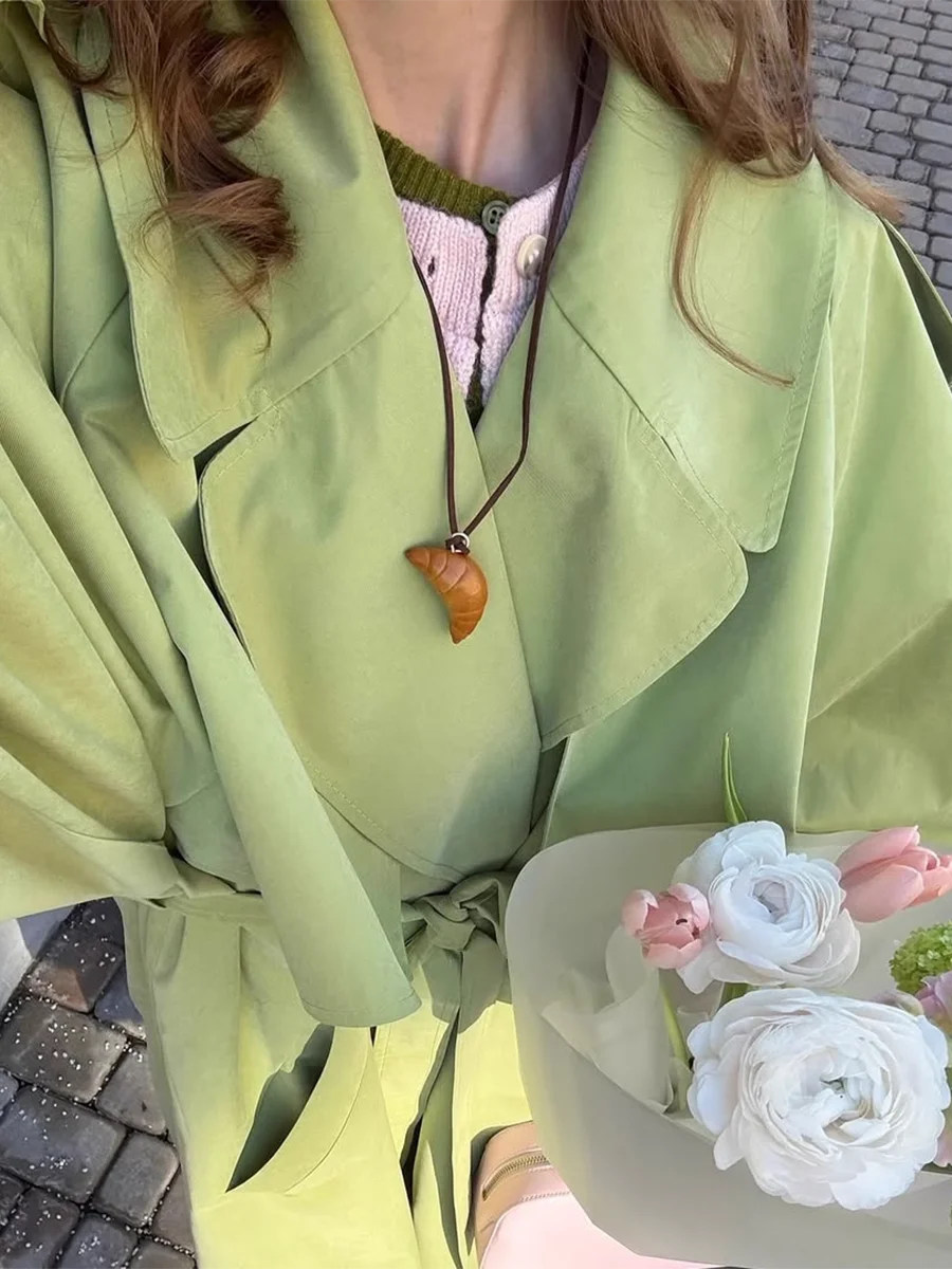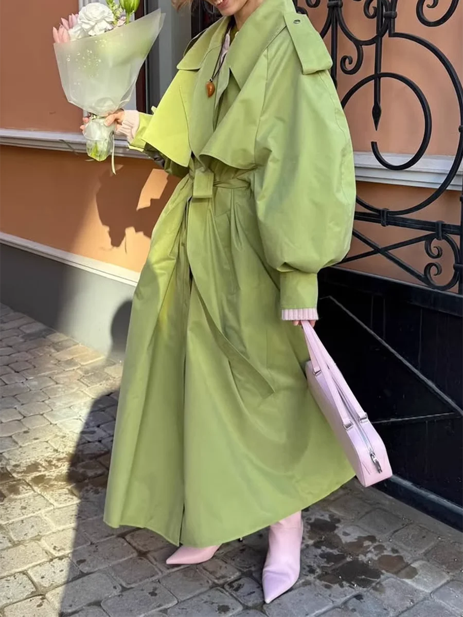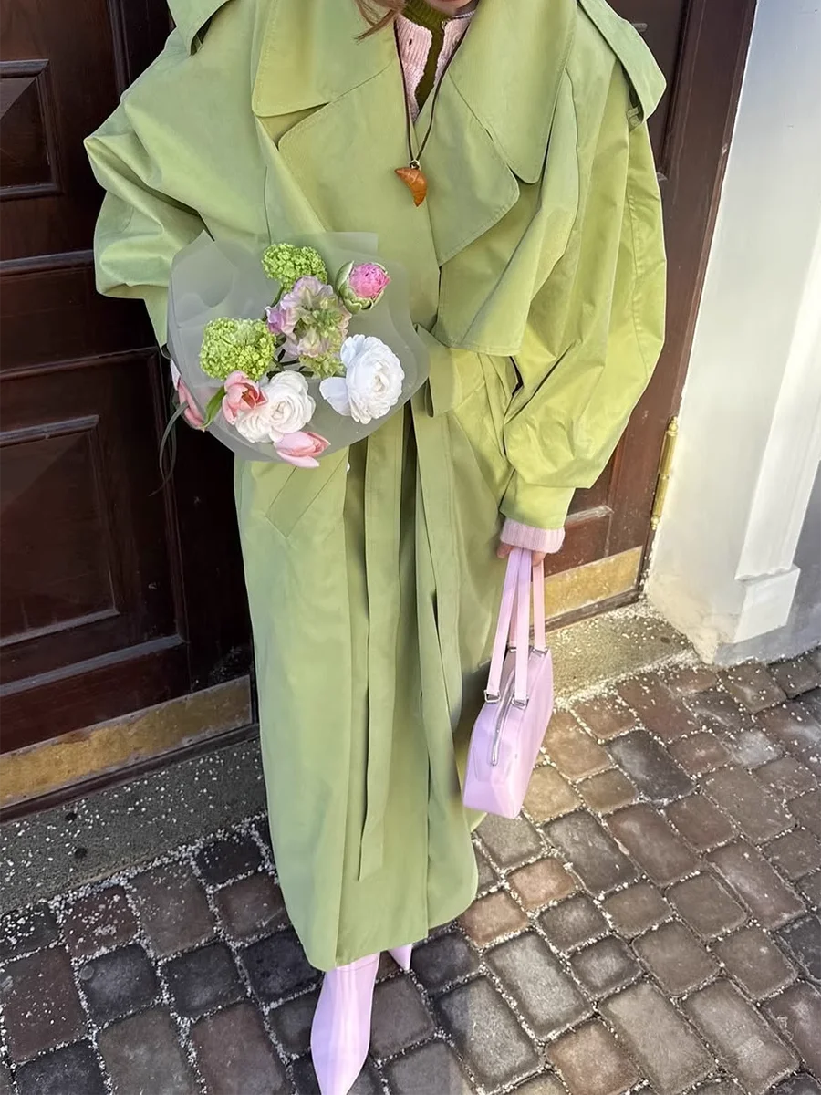 TWOTWINSTYLE Green Loose Spliced Lace Up Minimalist Trenchs for Women Lapel Long Sleeves Temperament Trench Female Clothing New
