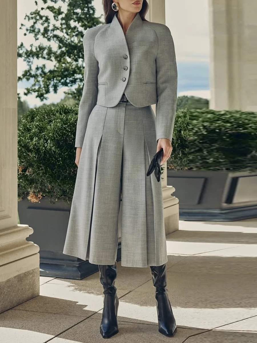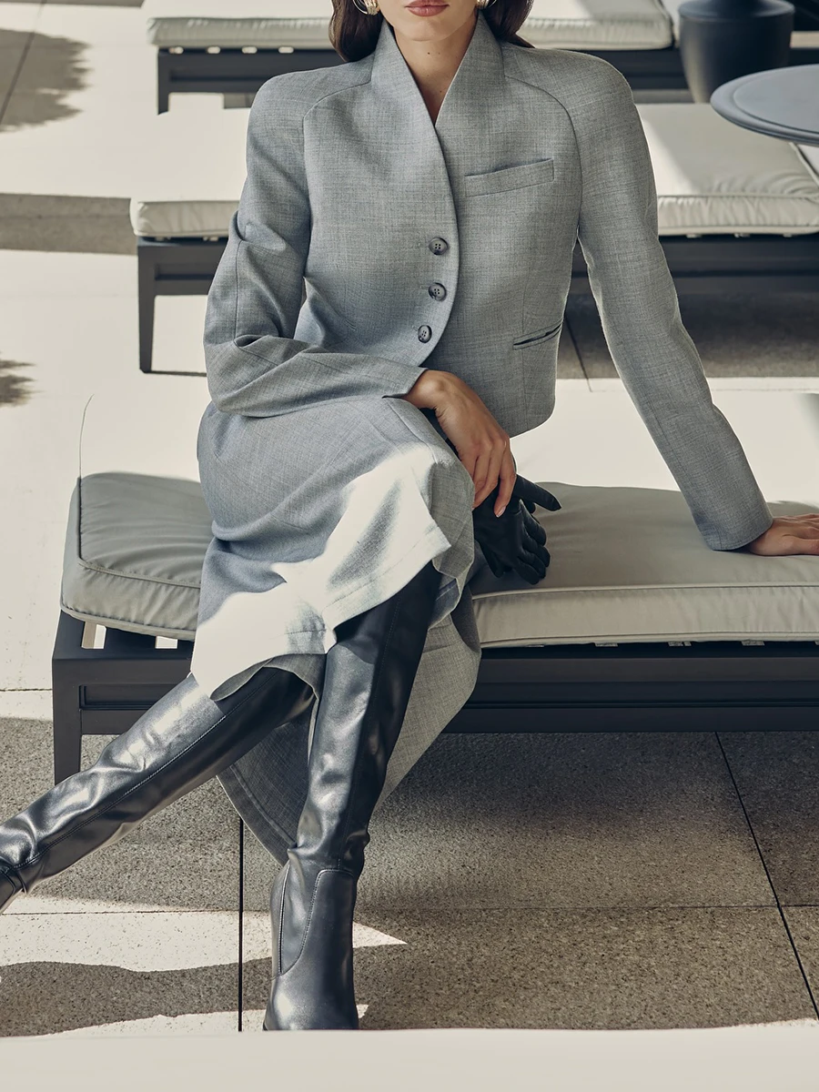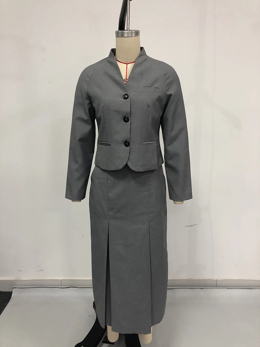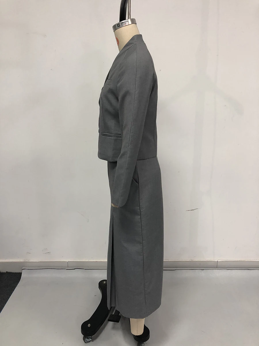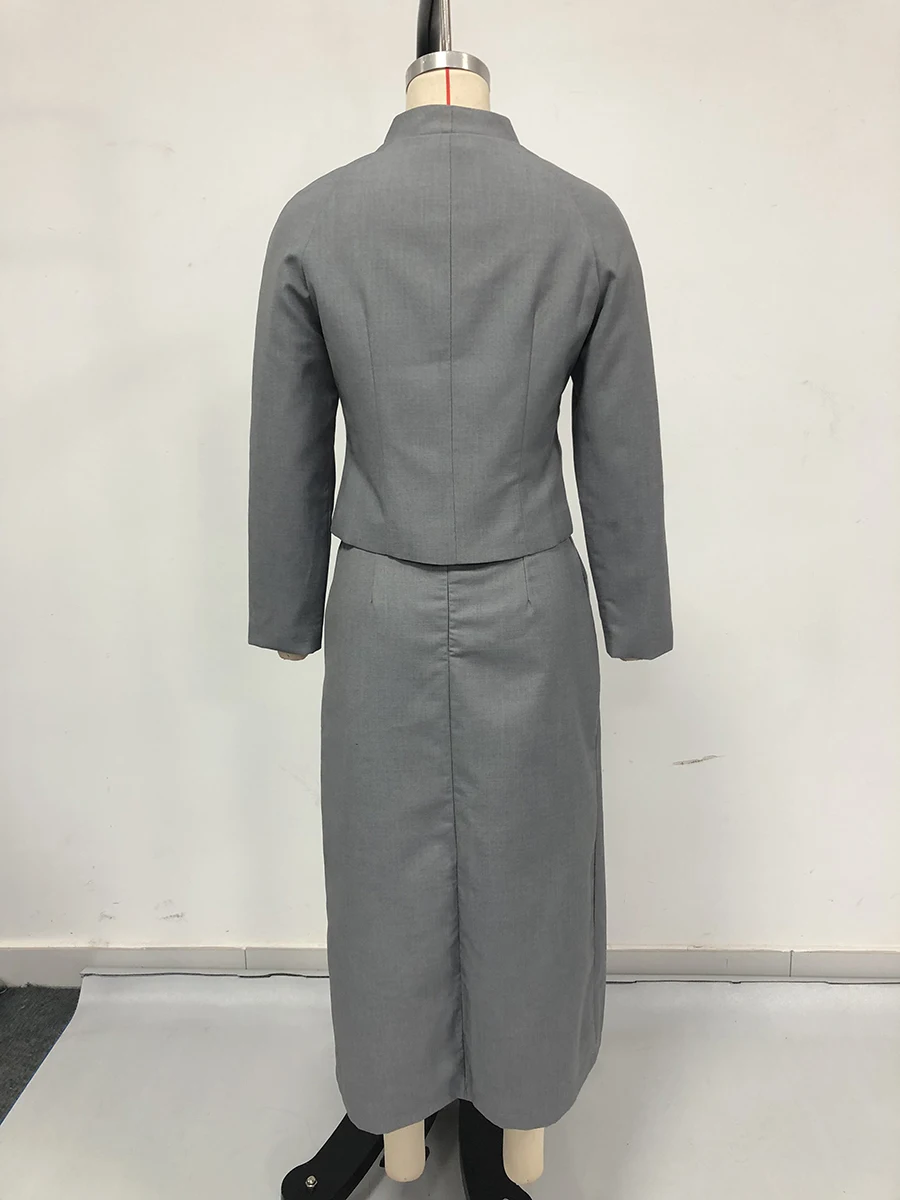 TWOTWINSTYLE High End Gray Two Piece Set for Women Stand Collar Long Sleeve Short Top High Waist Midi Skirt Office Suit Female