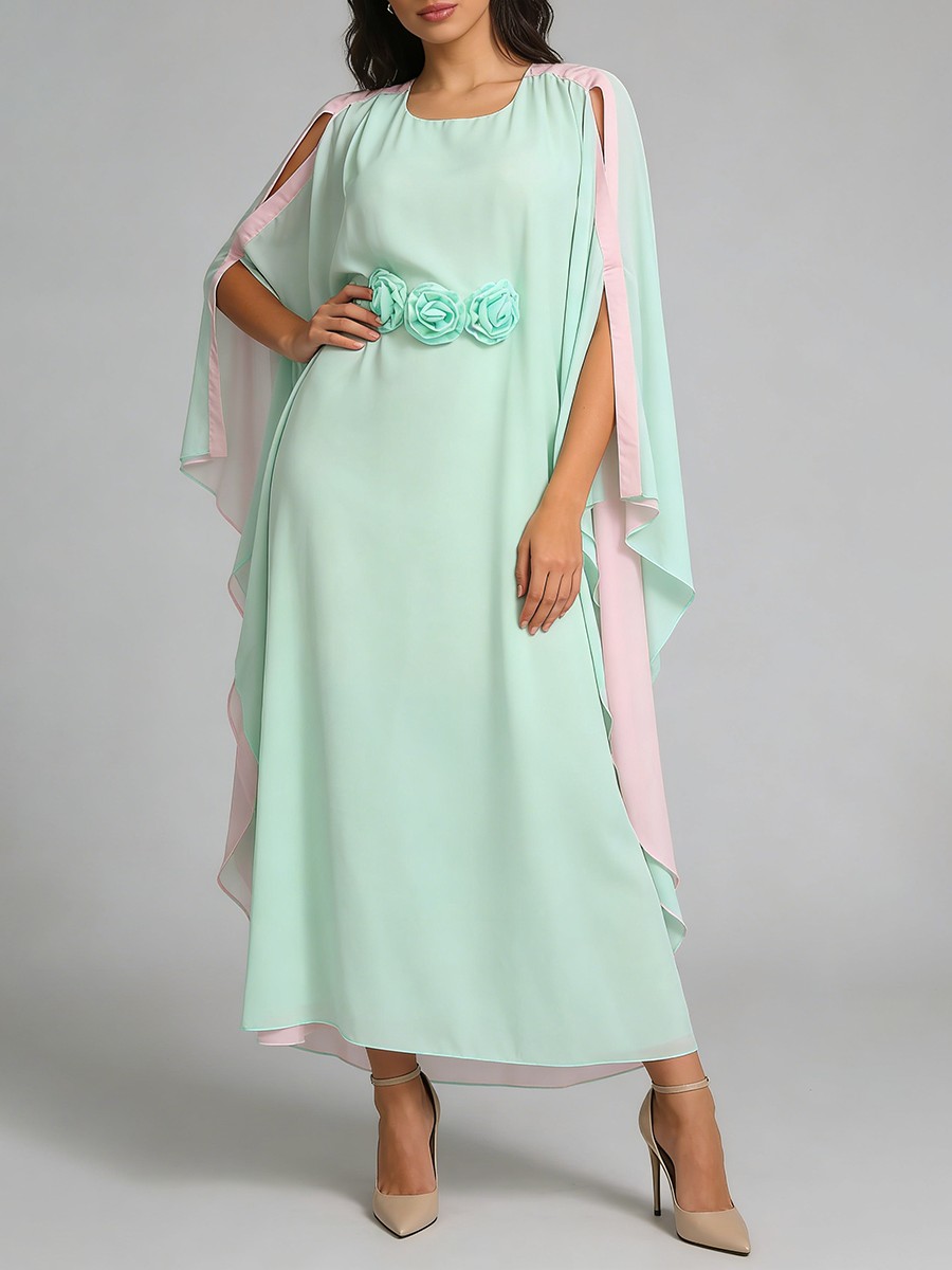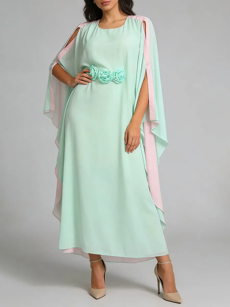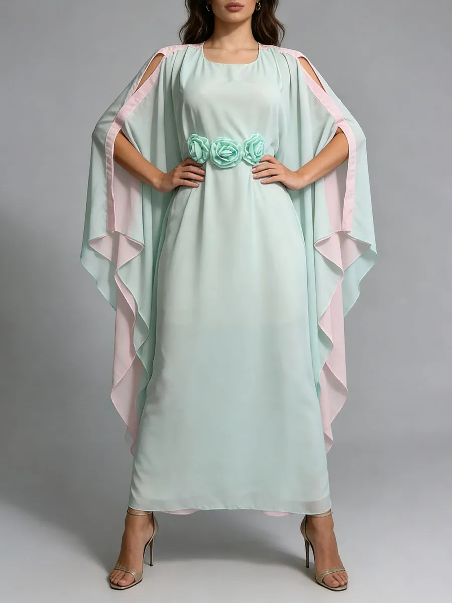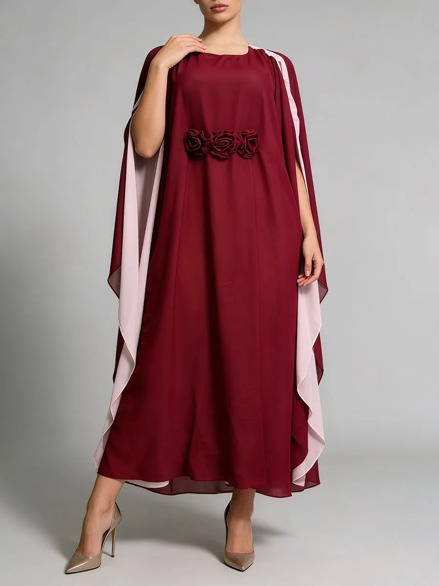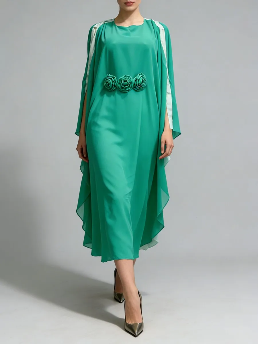TWOTWINSTYLE Hit Color Loose Spliced 3D Flower Casual Dress for Women Round Neck Batwing Sleeves High Waist Long Dresses Female