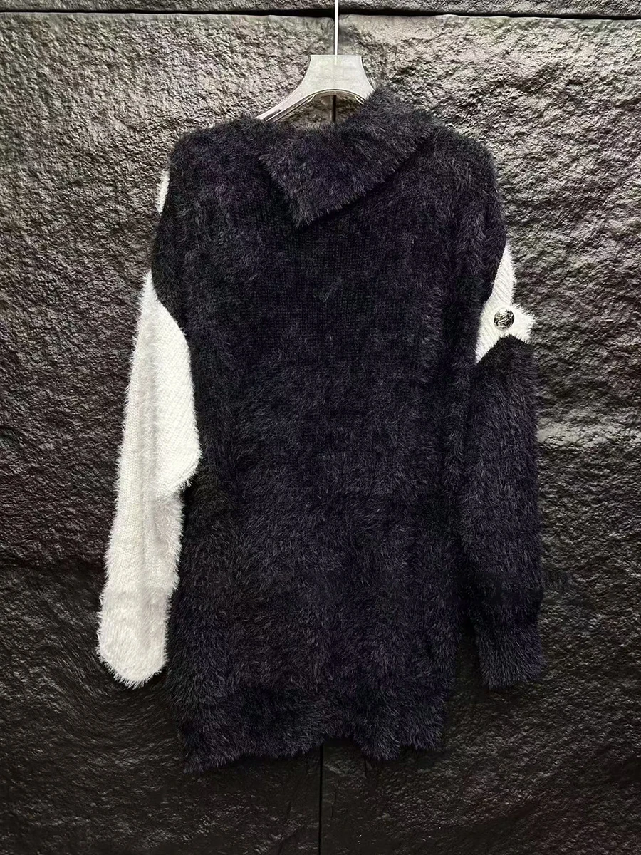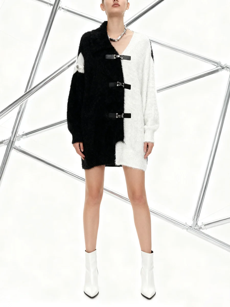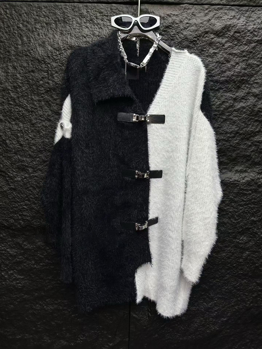 TWOTWINSTYLE Hit Color Loose Spliced Leather Buttons Fashion Coats for Women V Neck Long Sleeves Casual Coat Female Clothing New