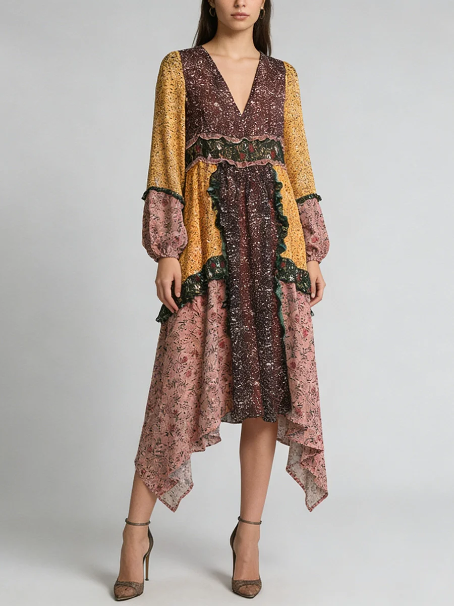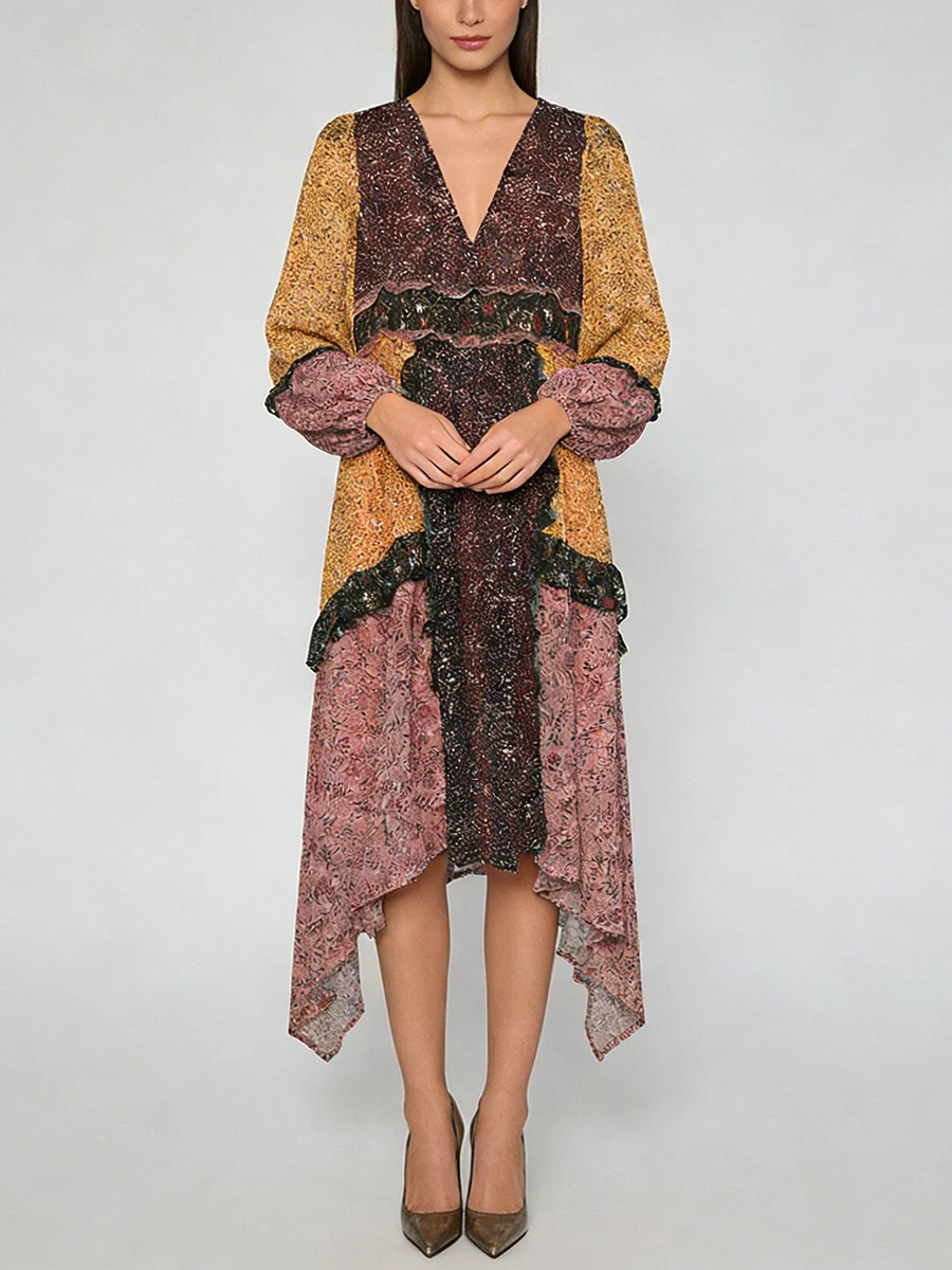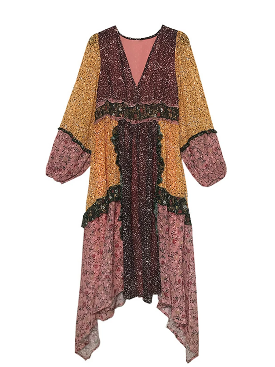 TWOTWINSTYLE Hit Color Printing Spliced Fungus Casual Dresses for Women V Neck Long Sleeves High Waist Loose Dress Female New