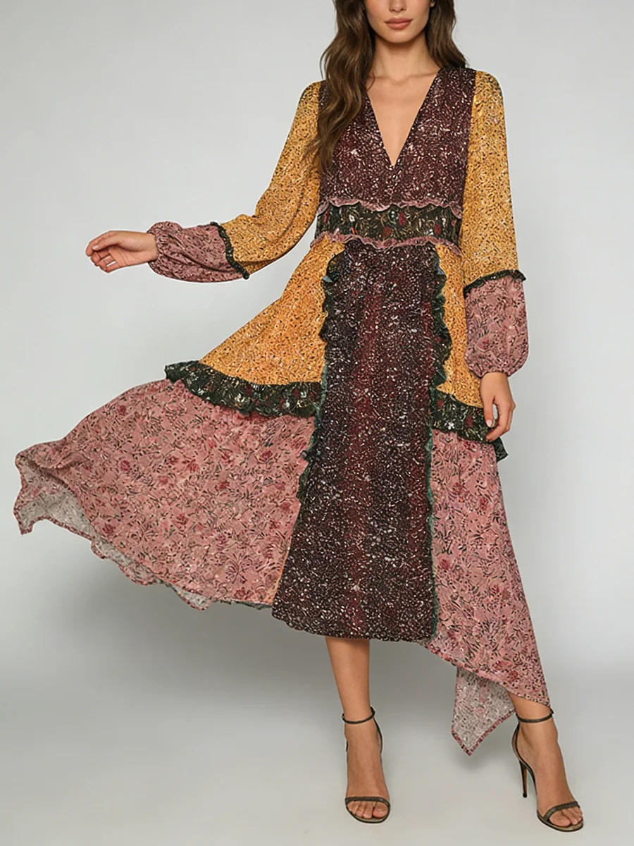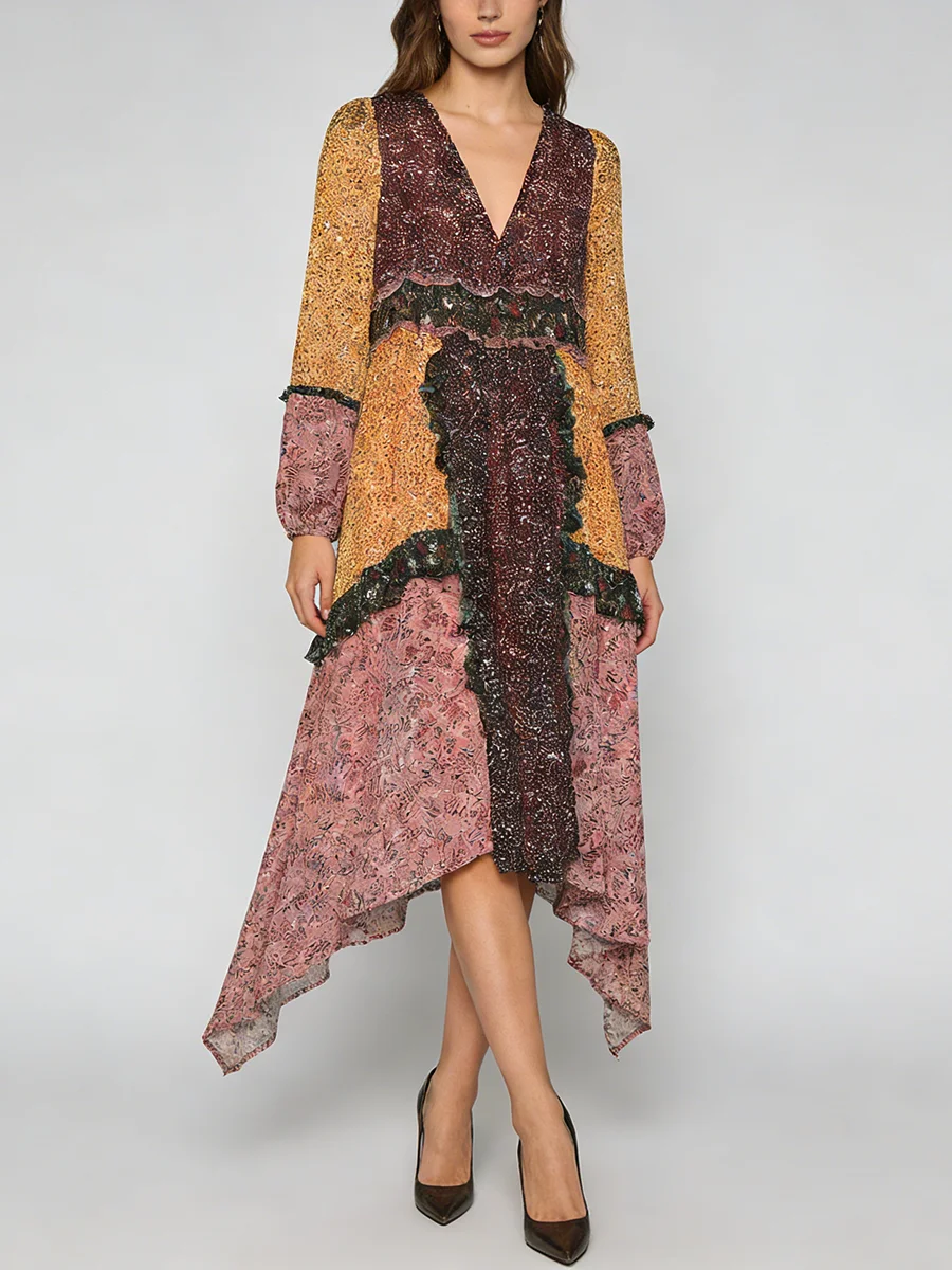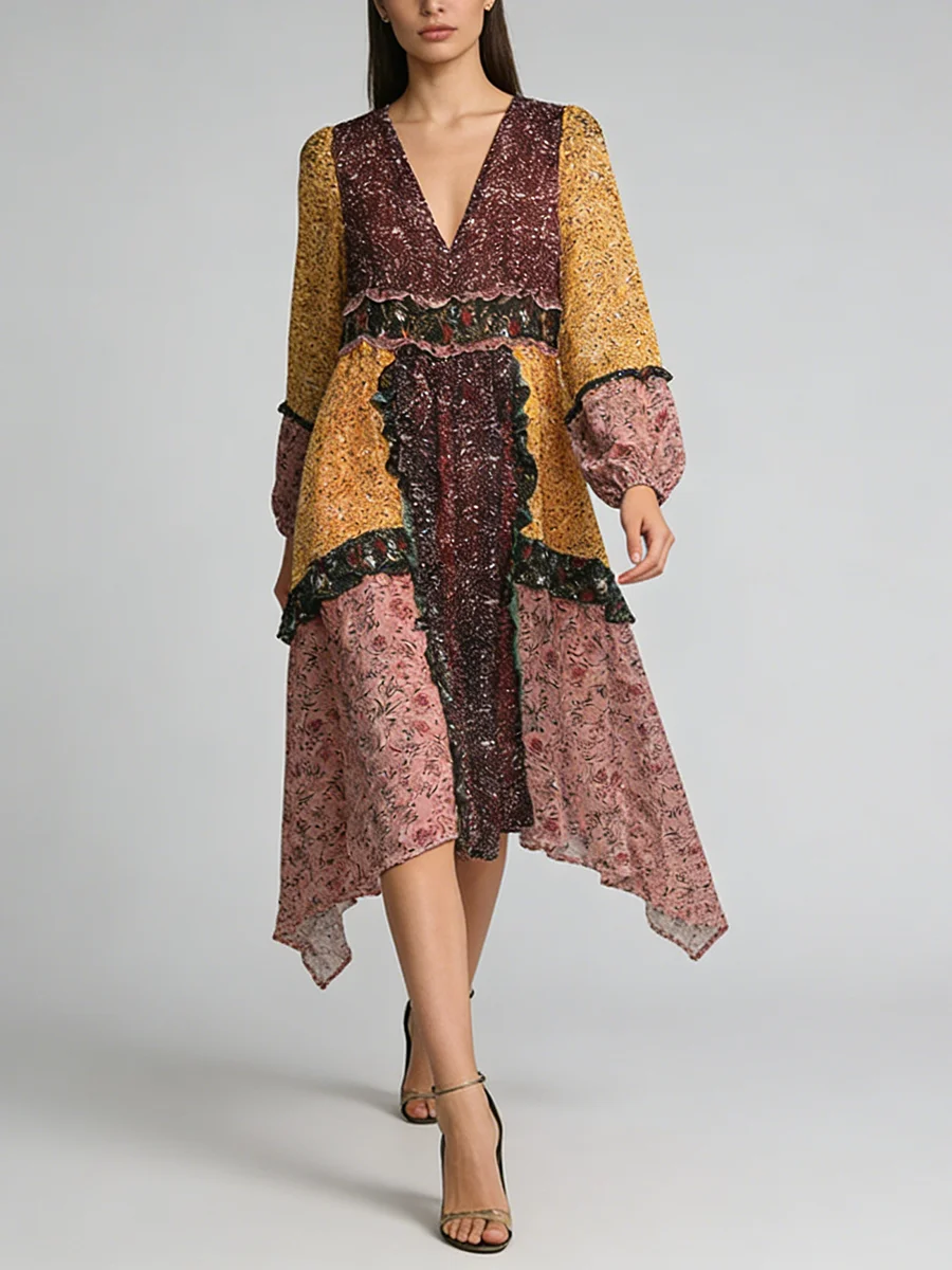 TWOTWINSTYLE Hit Color Printing Spliced Fungus Casual Dresses for Women V Neck Long Sleeves High Waist Loose Dress Female New