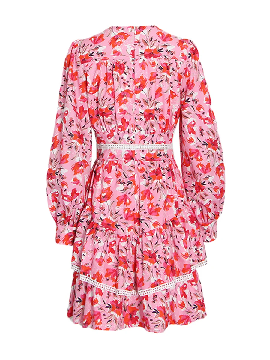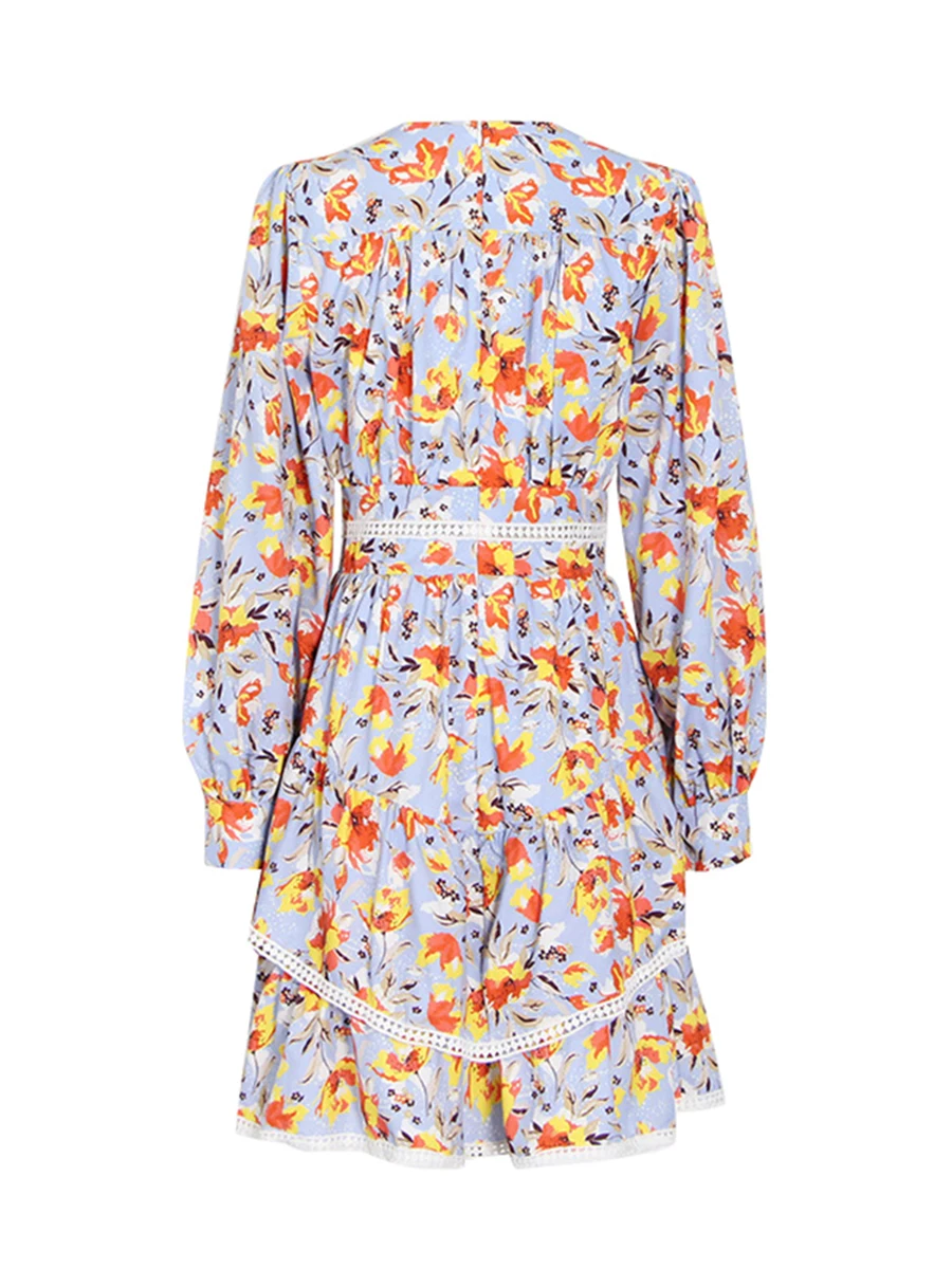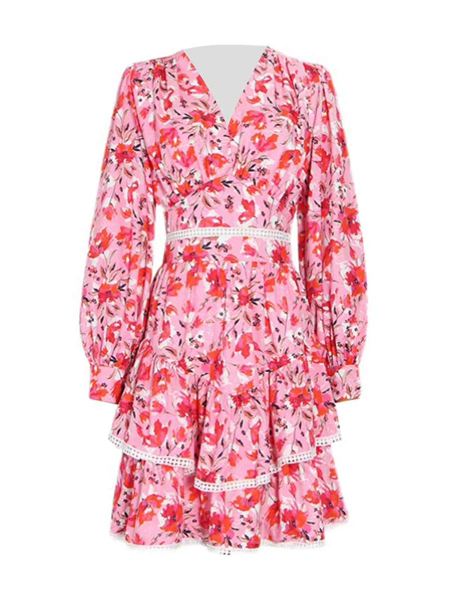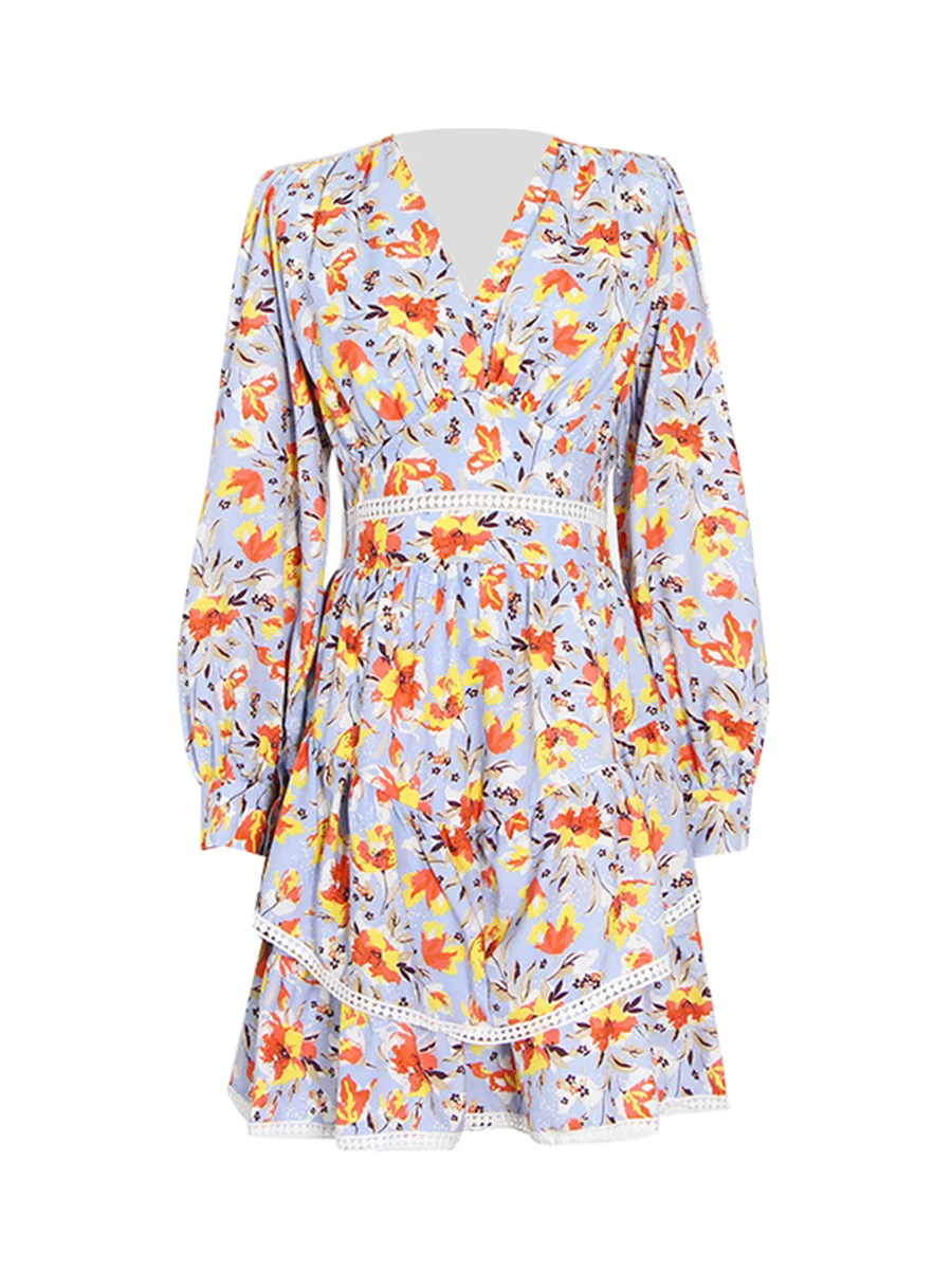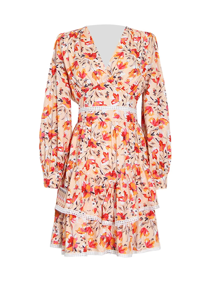TWOTWINSTYLE Hit Color Printing Spliced Shirring Casual Dress for Women V Neck Long Sleeves Patchwork Ruffles Dresses Female New