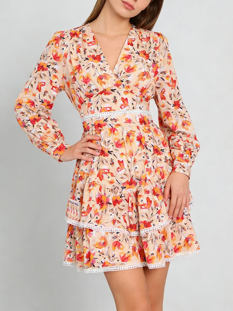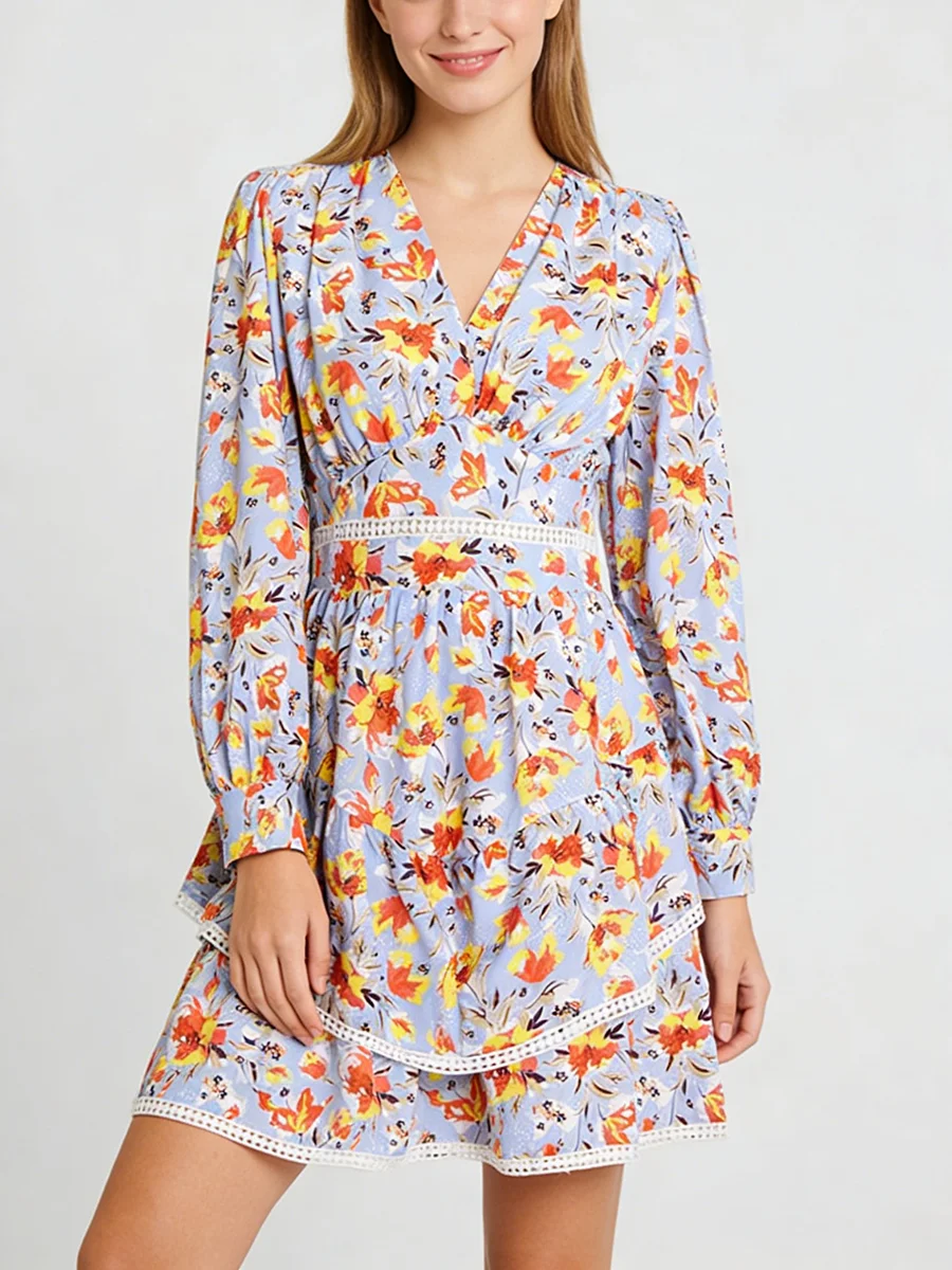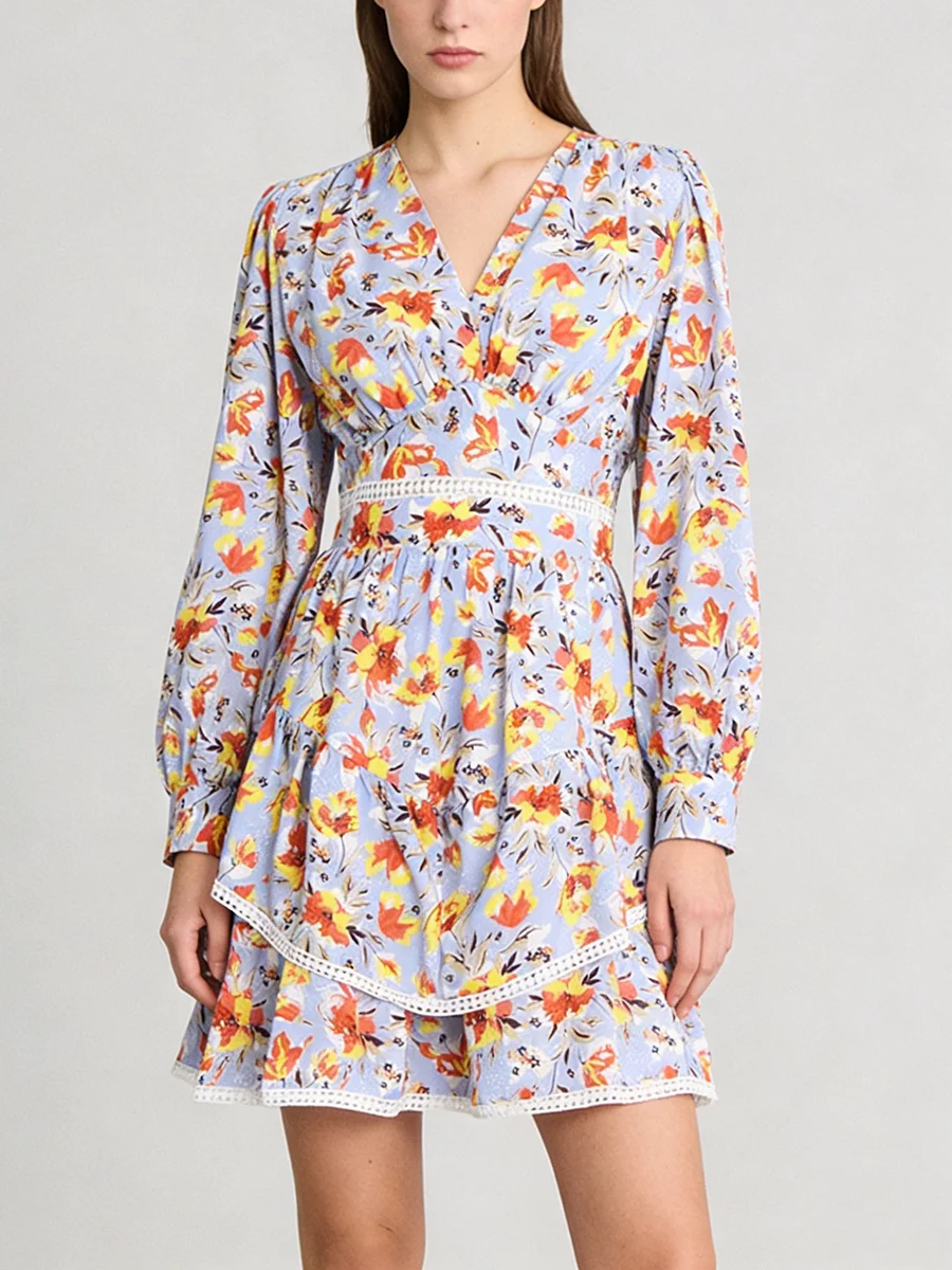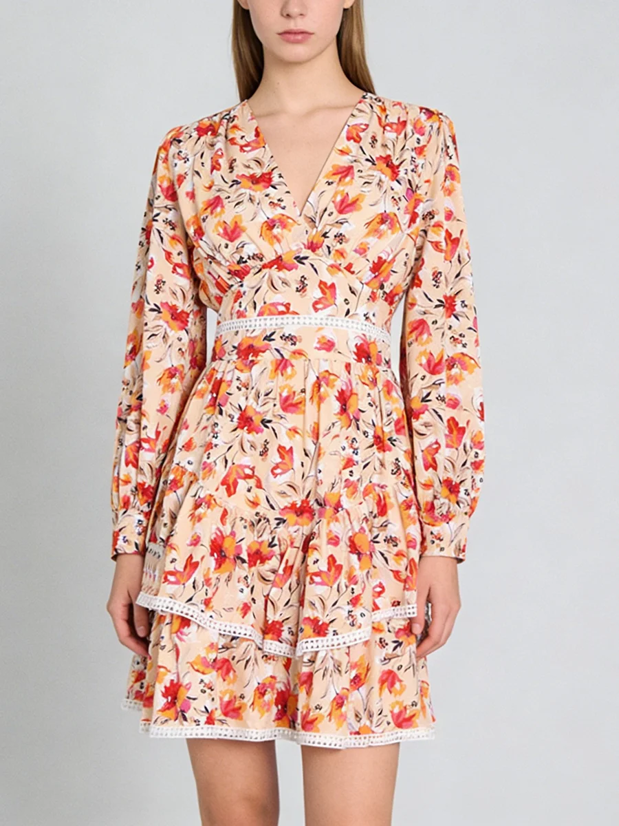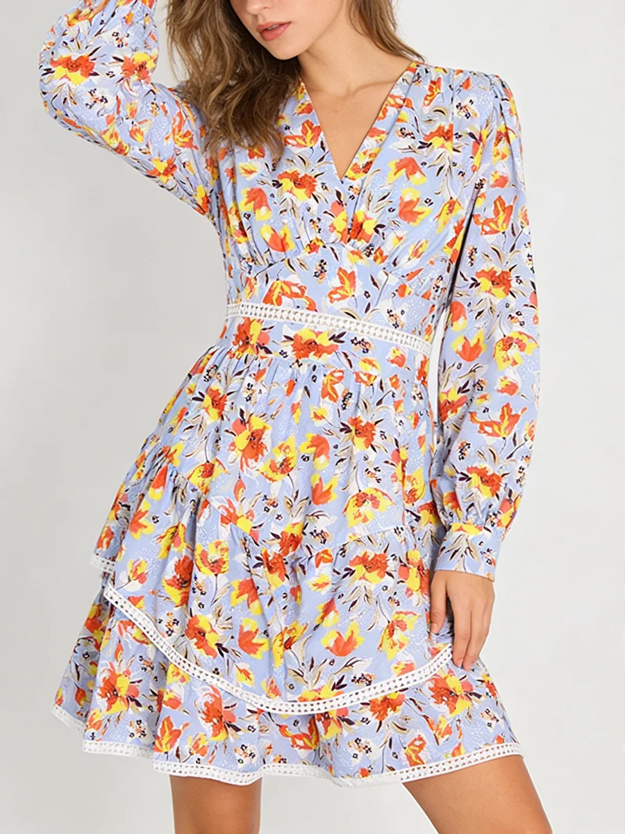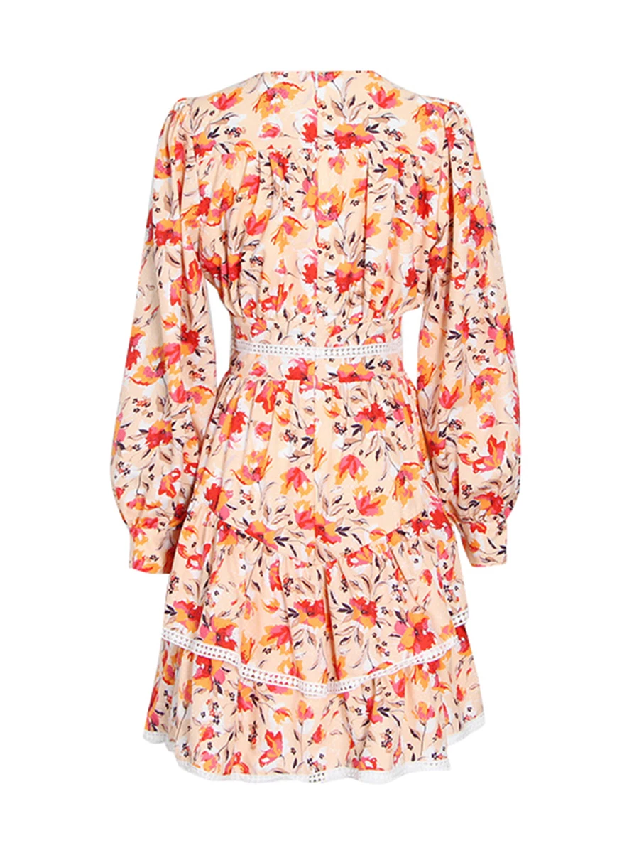 TWOTWINSTYLE Hit Color Printing Spliced Shirring Casual Dress for Women V Neck Long Sleeves Patchwork Ruffles Dresses Female New