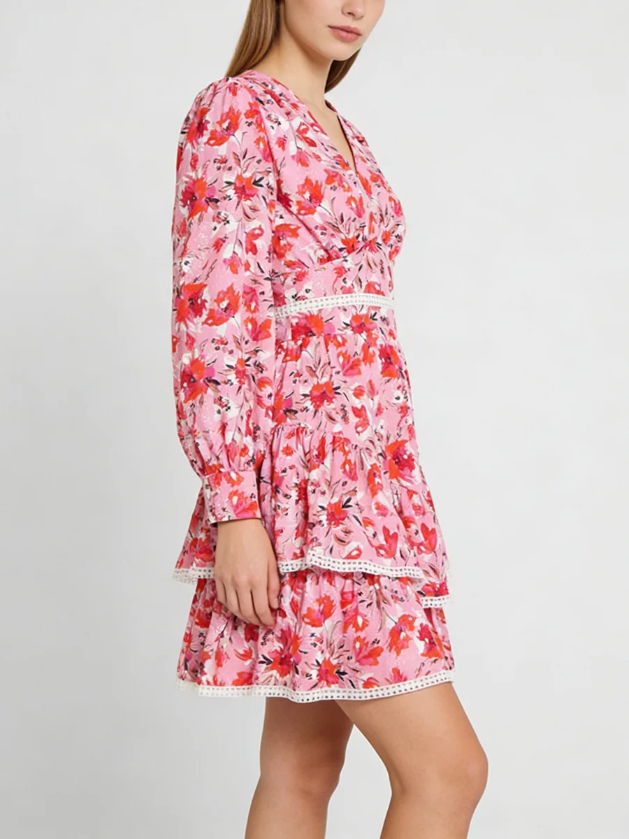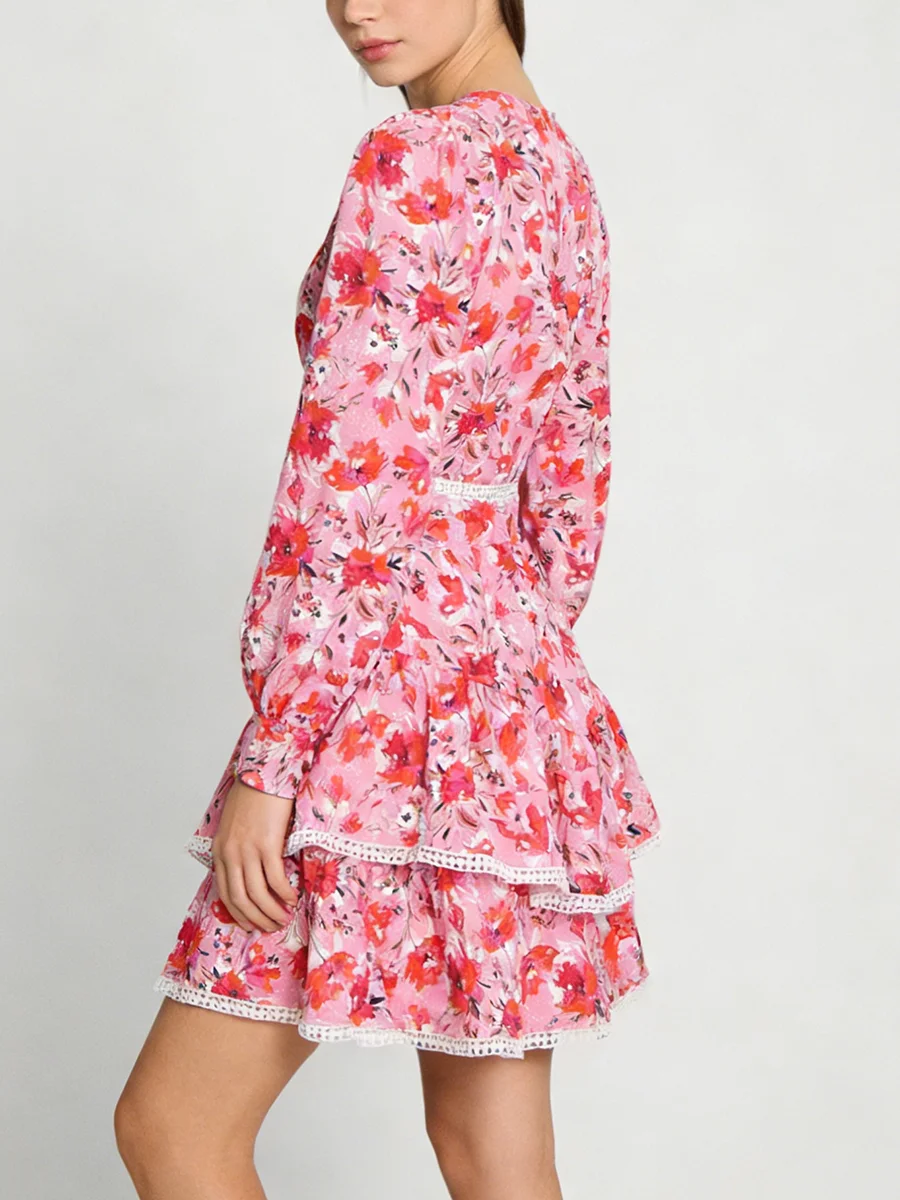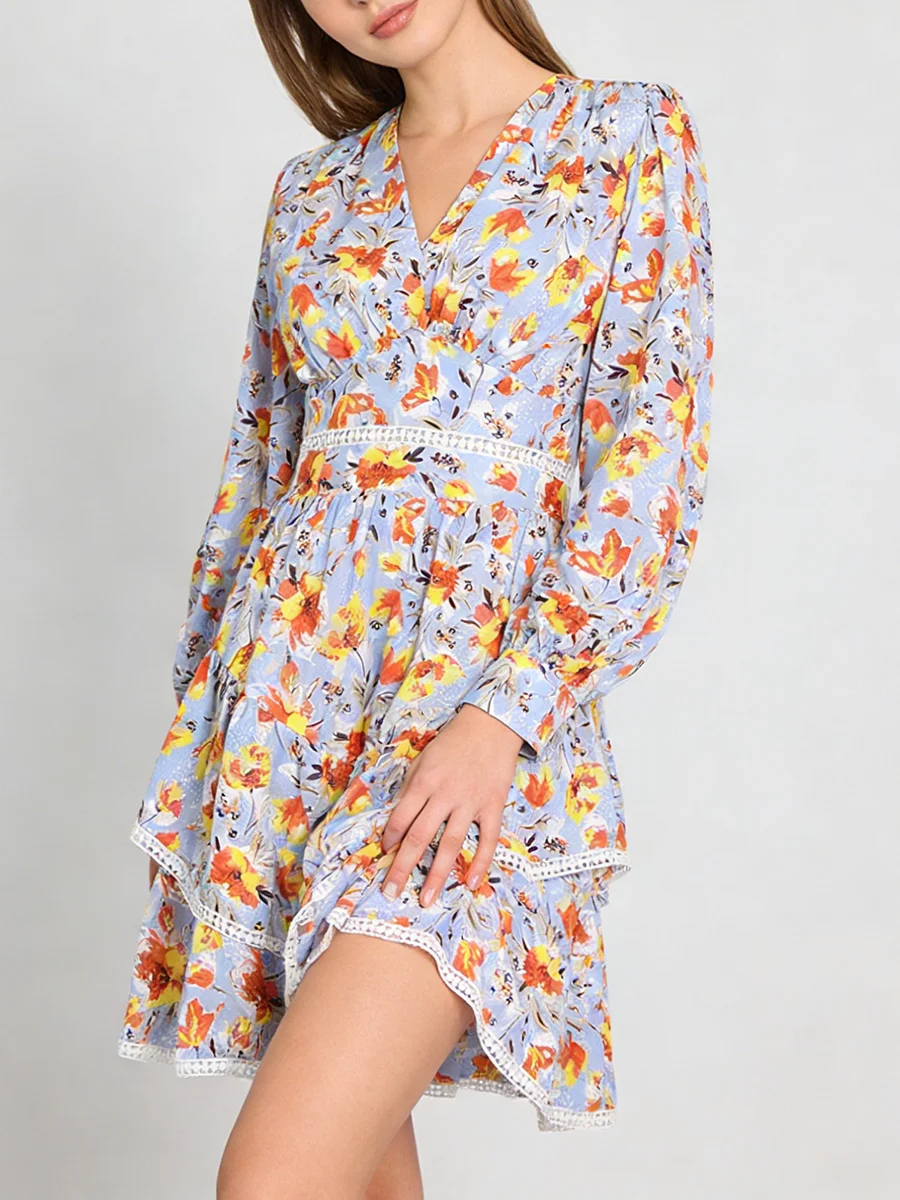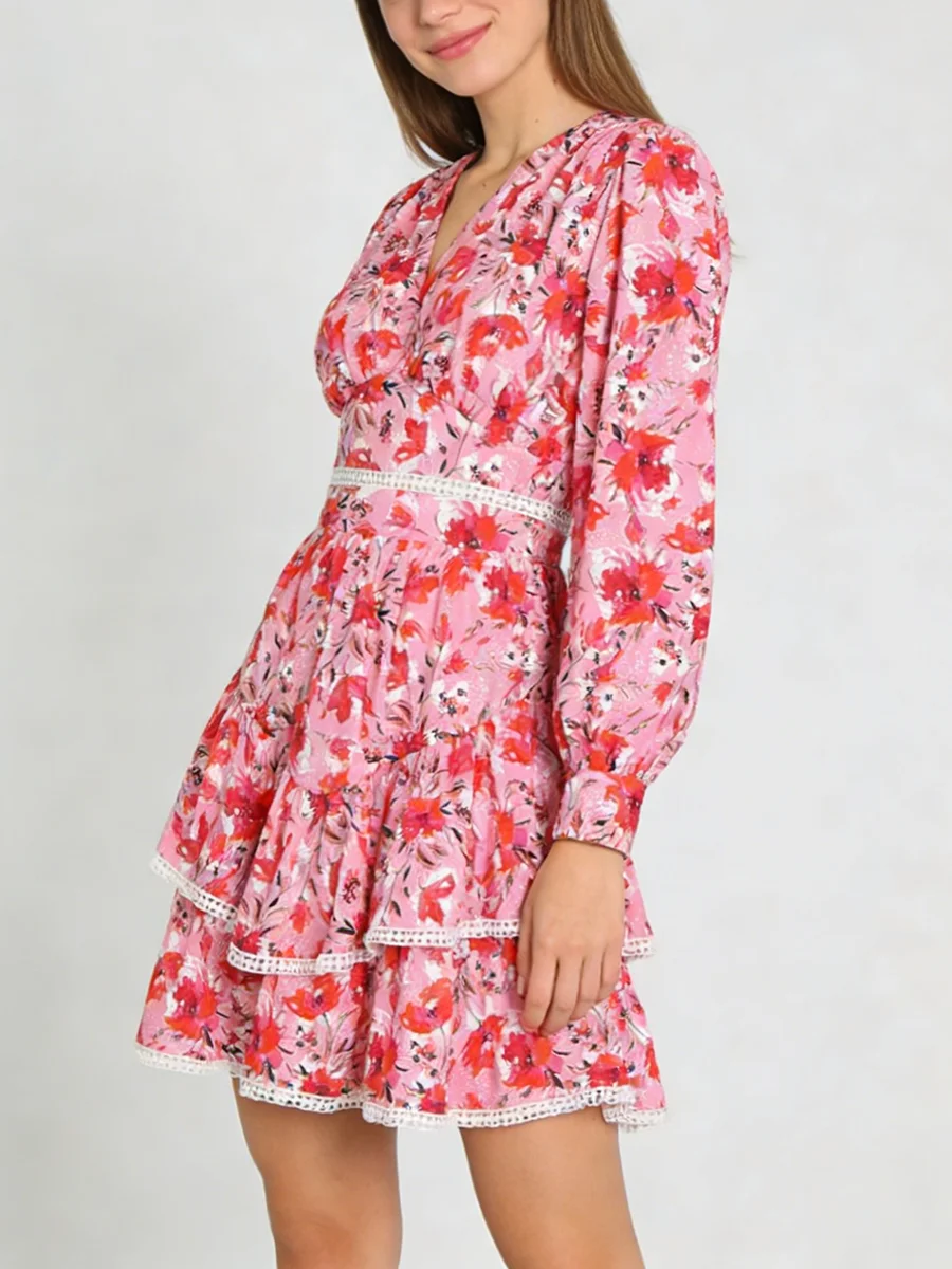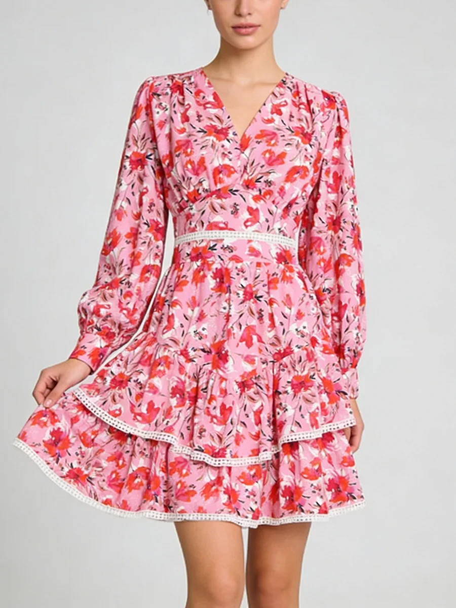 TWOTWINSTYLE Hit Color Printing Spliced Shirring Casual Dress for Women V Neck Long Sleeves Patchwork Ruffles Dresses Female New