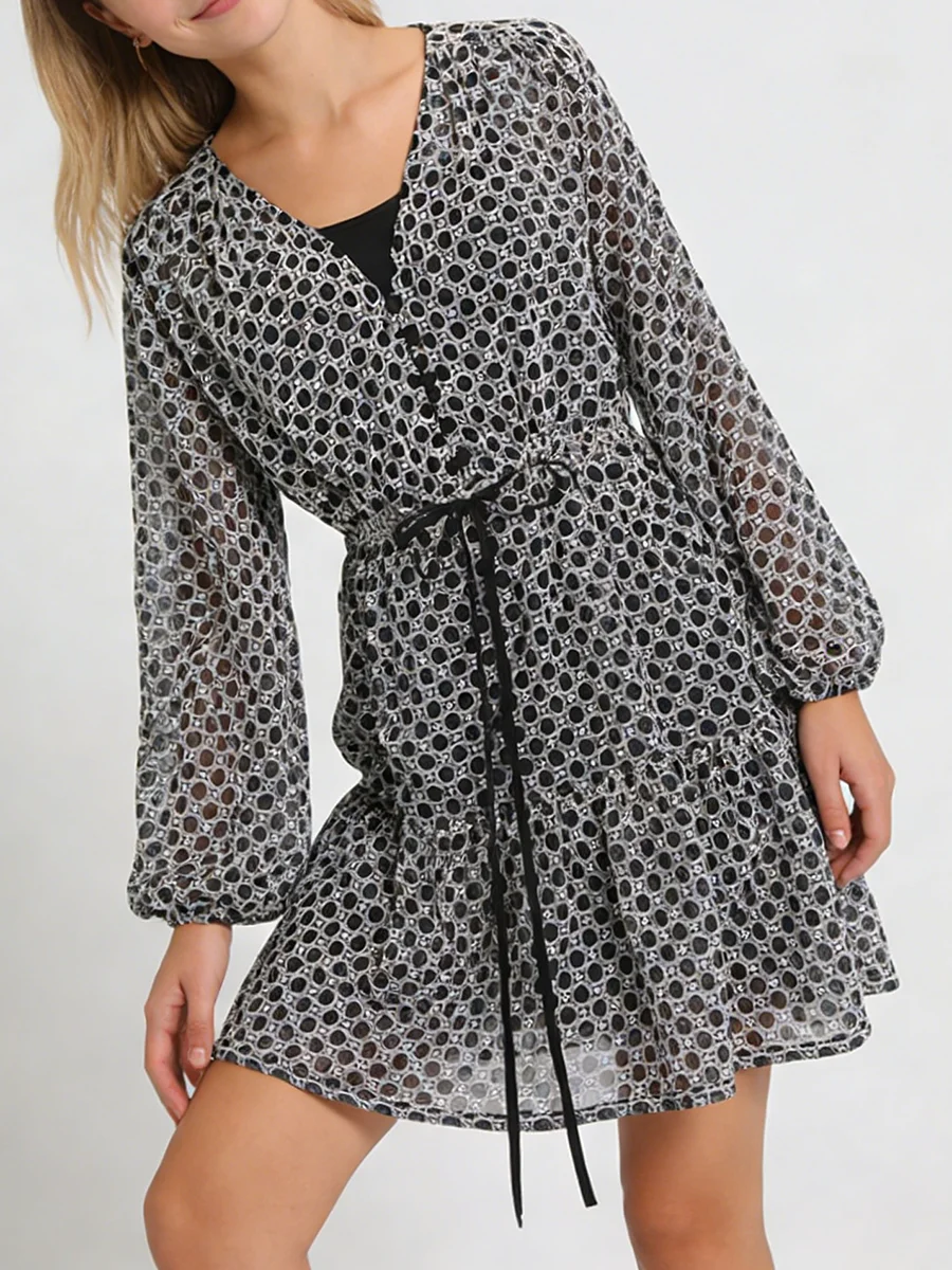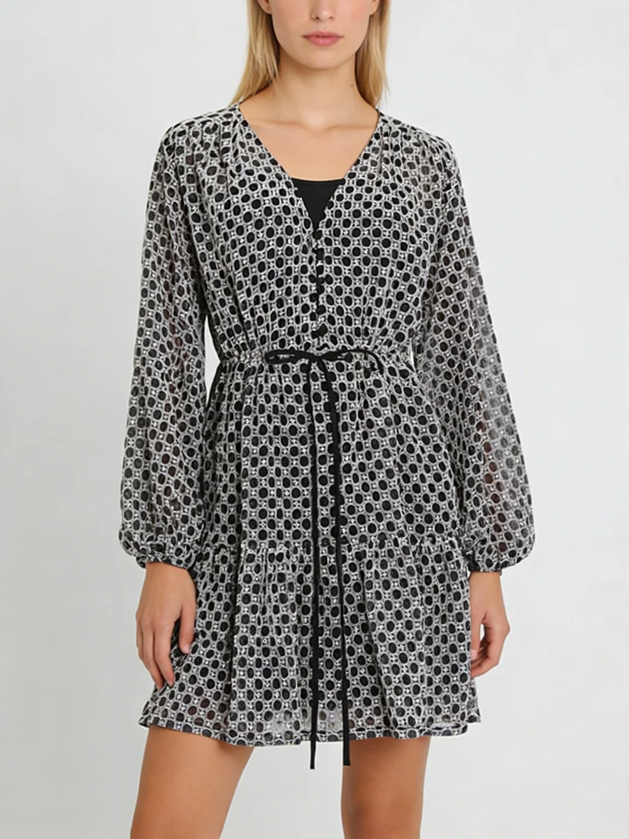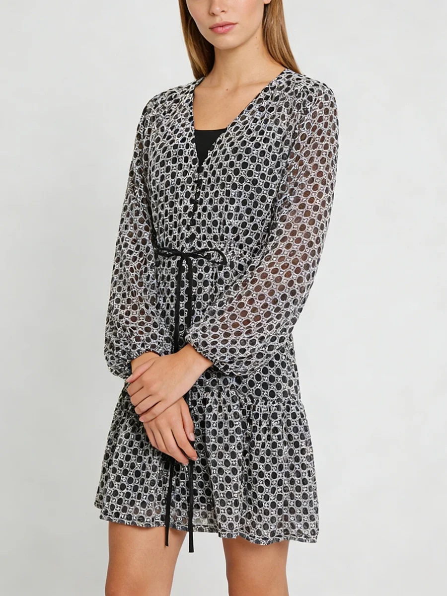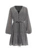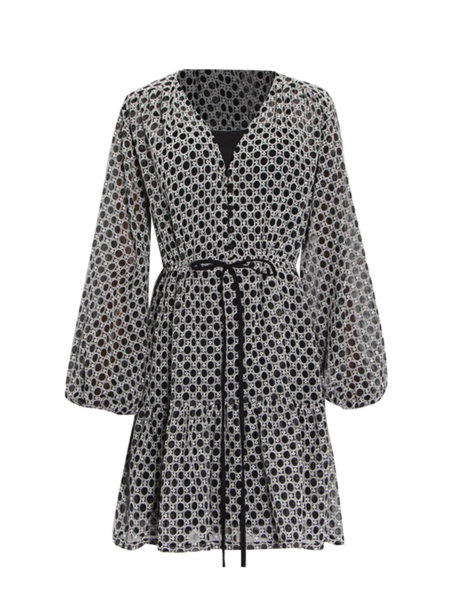 TWOTWINSTYLE Hit Color Sheer Spliced Wave Point Casual Dress for Women V Neck Long Sleeves Tunic Patchwork Bow Dresses Female