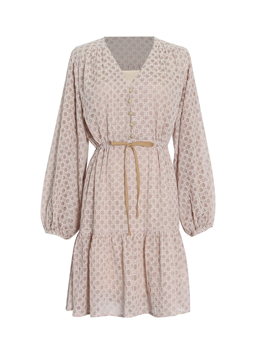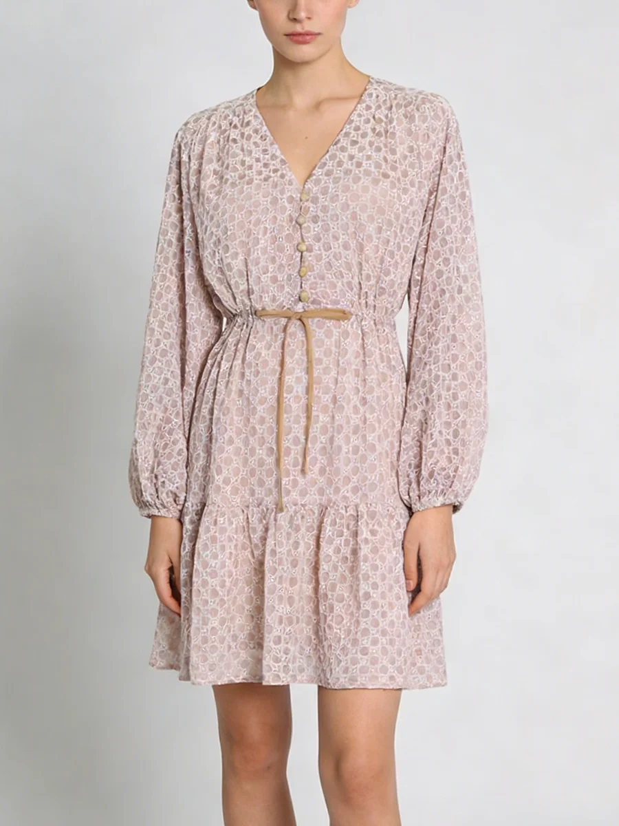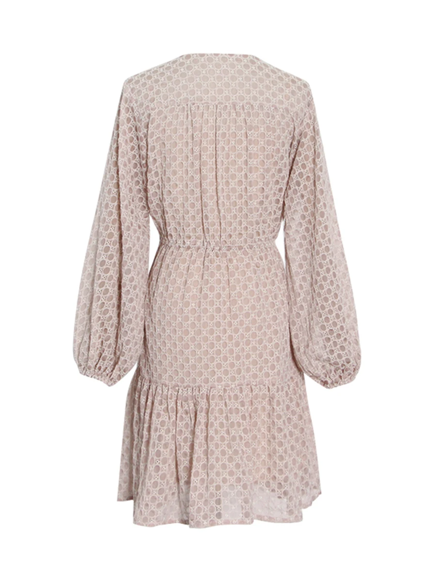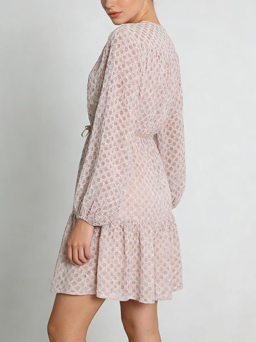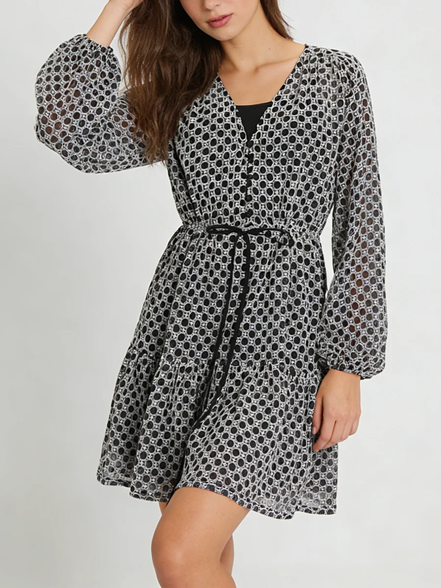 TWOTWINSTYLE Hit Color Sheer Spliced Wave Point Casual Dress for Women V Neck Long Sleeves Tunic Patchwork Bow Dresses Female