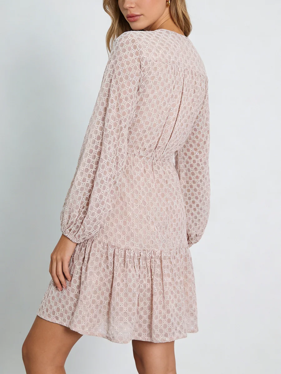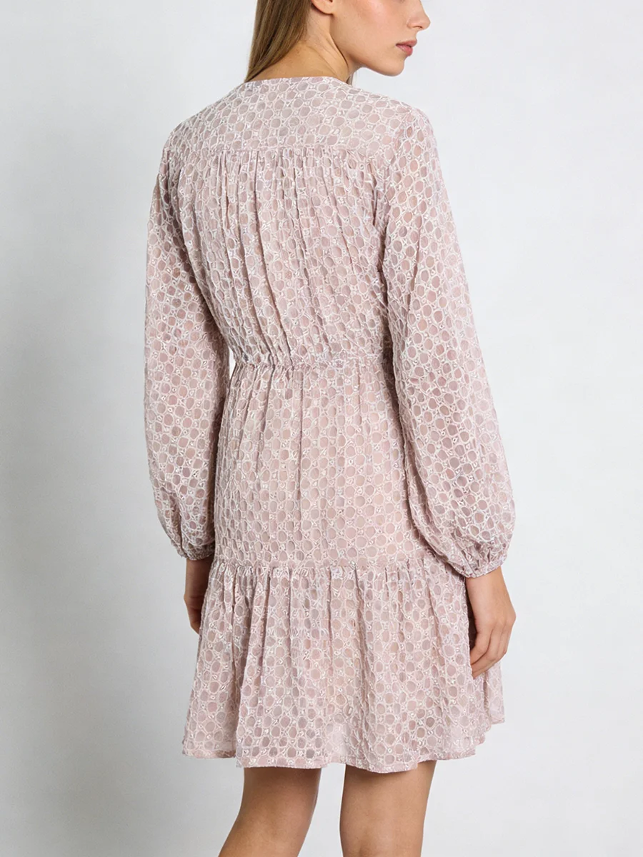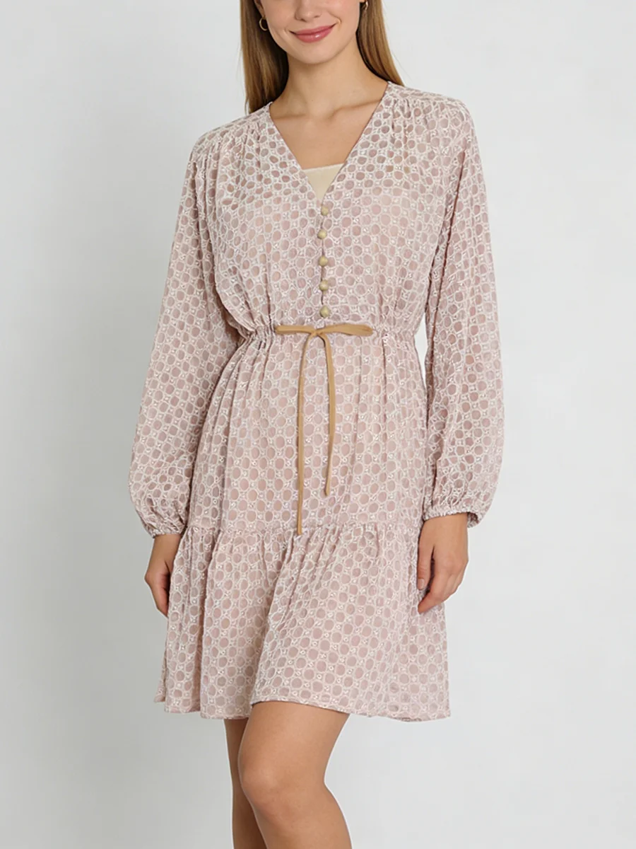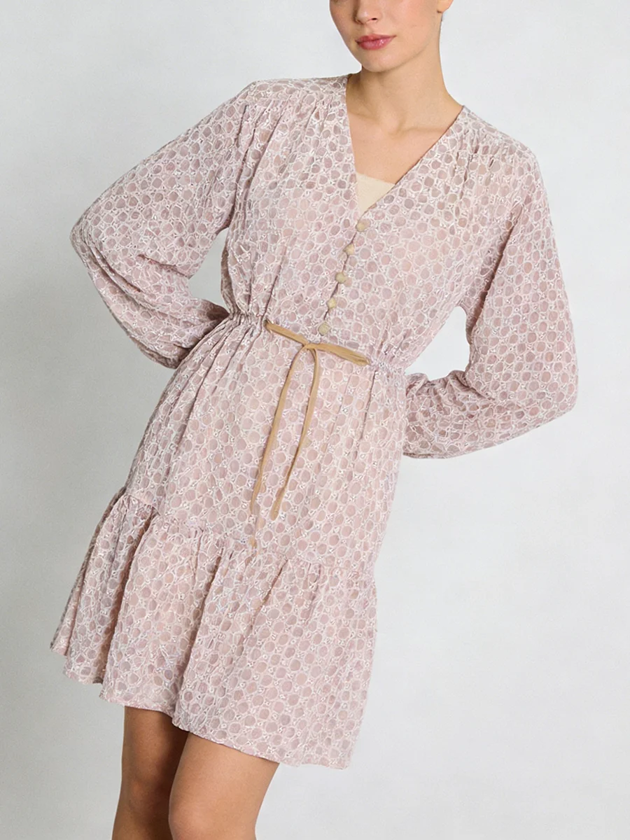 TWOTWINSTYLE Hit Color Sheer Spliced Wave Point Casual Dress for Women V Neck Long Sleeves Tunic Patchwork Bow Dresses Female