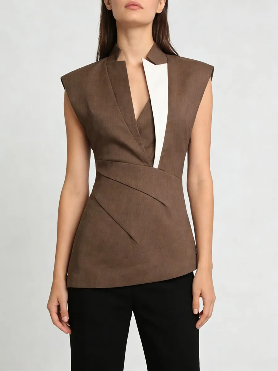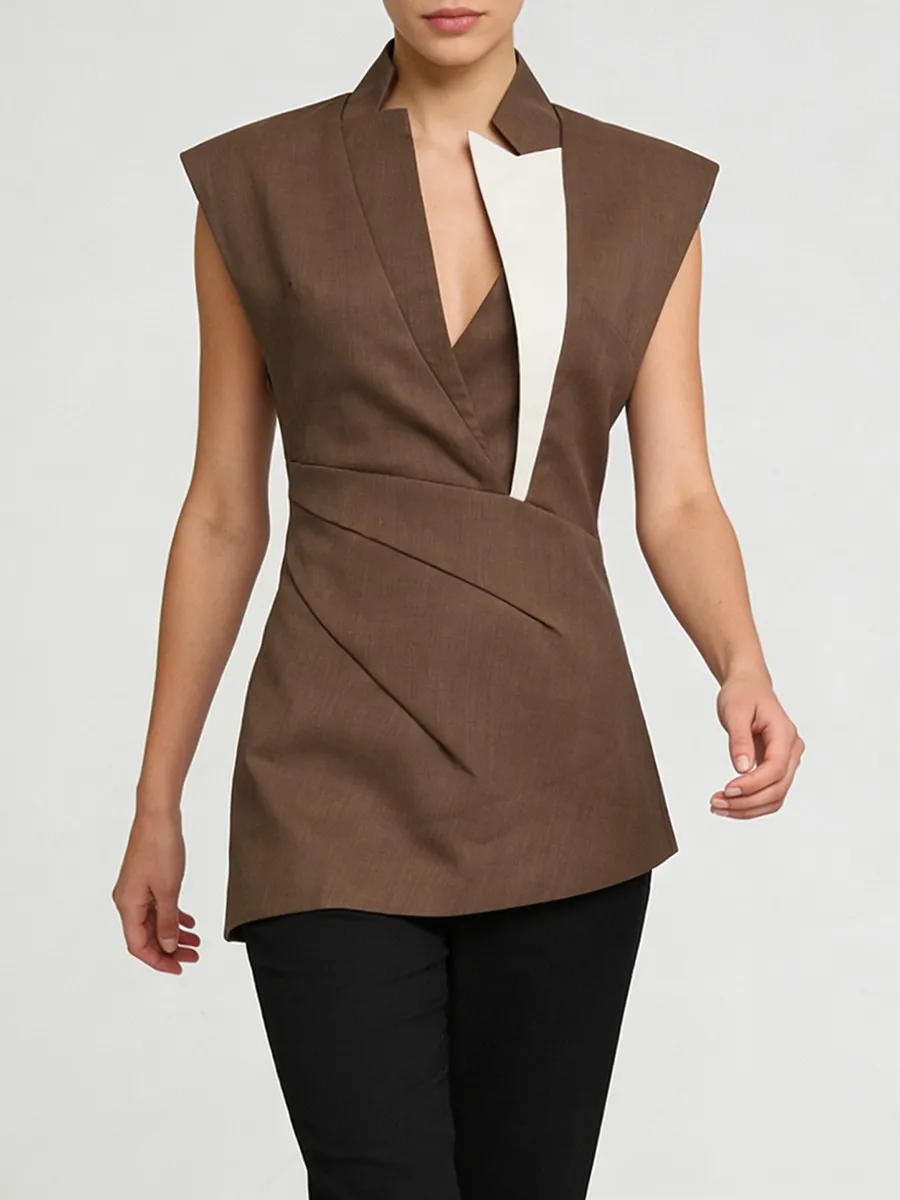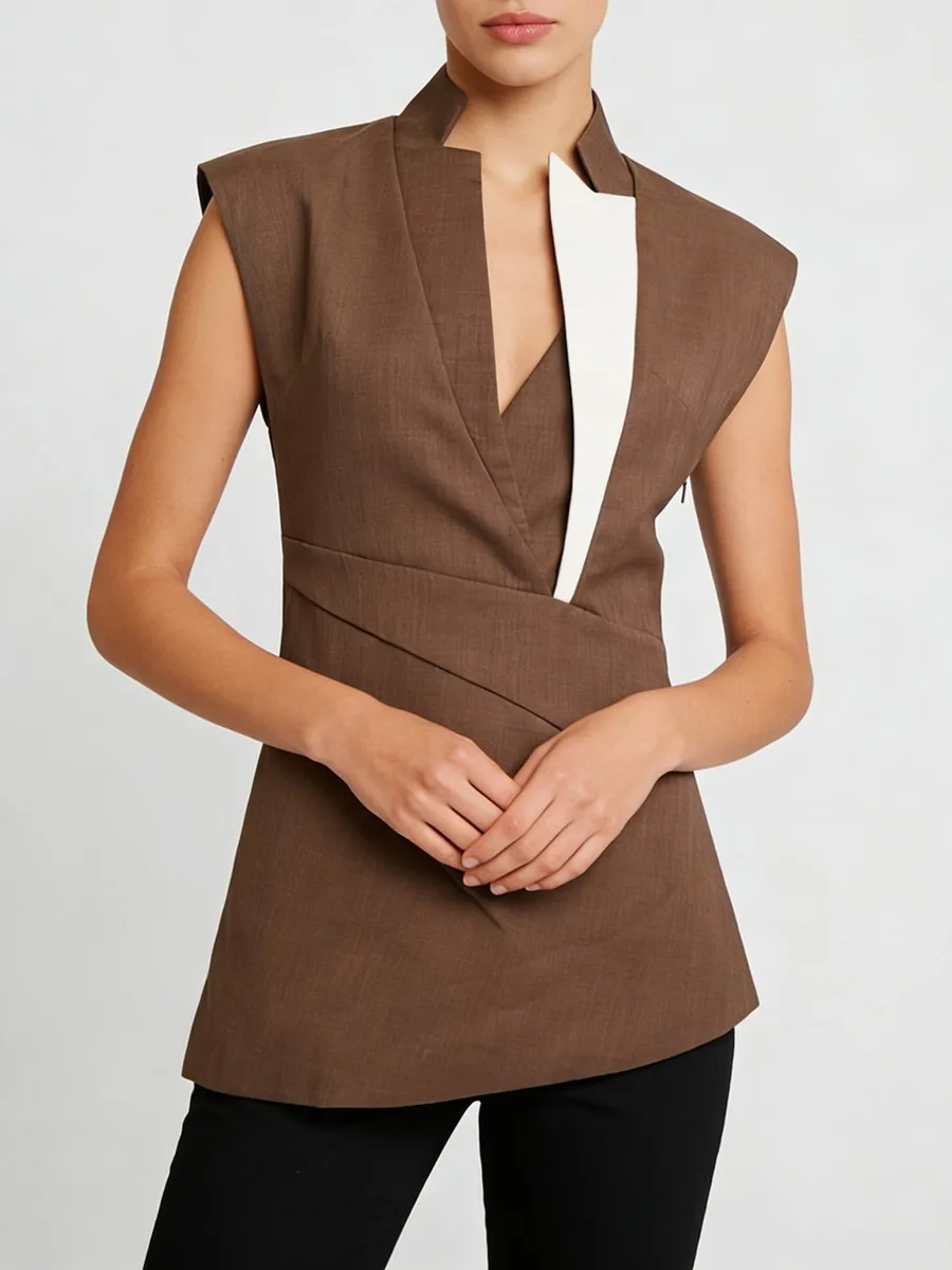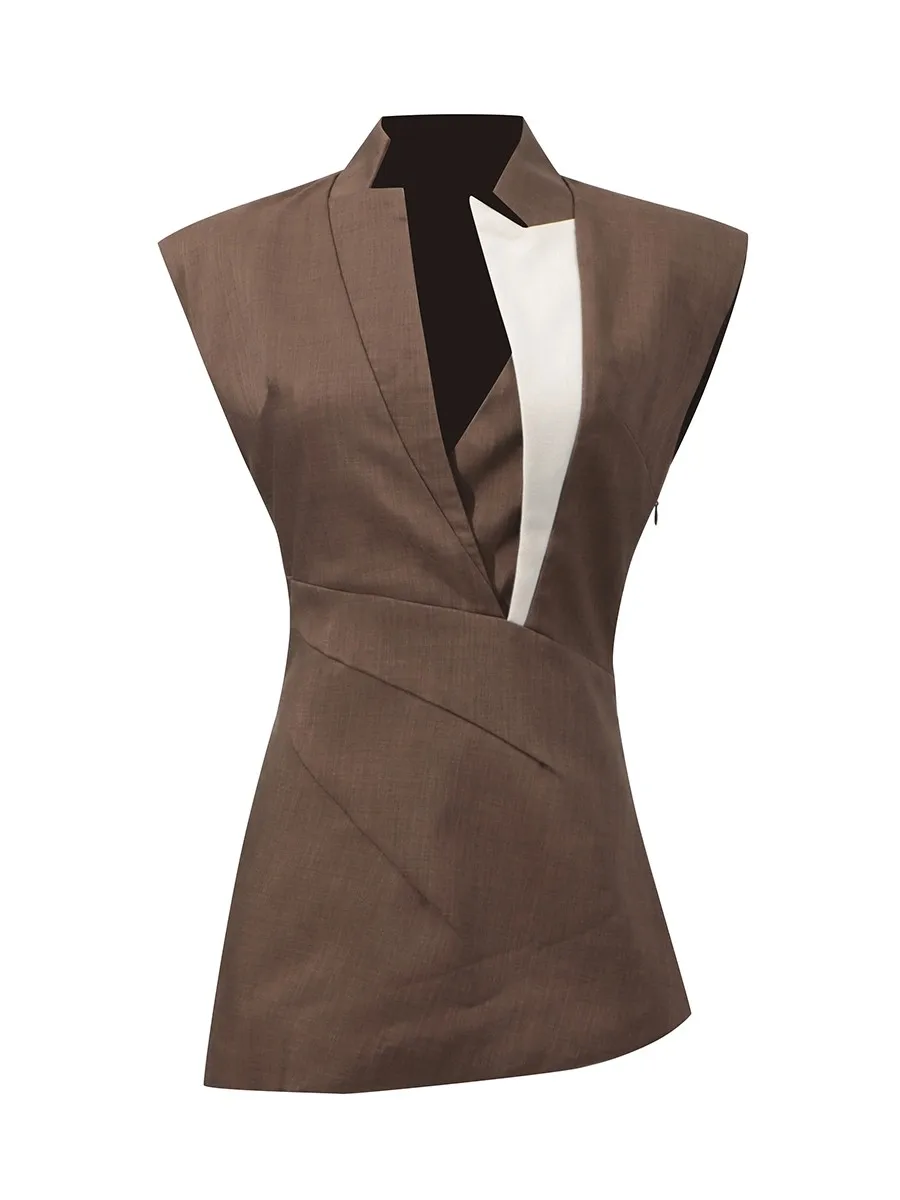 TWOTWINSTYLE Hit Color Slimming Spliced Folds Design Sense Blazer for Women Stand Neck Sleeveless Temperament Blazers Female New