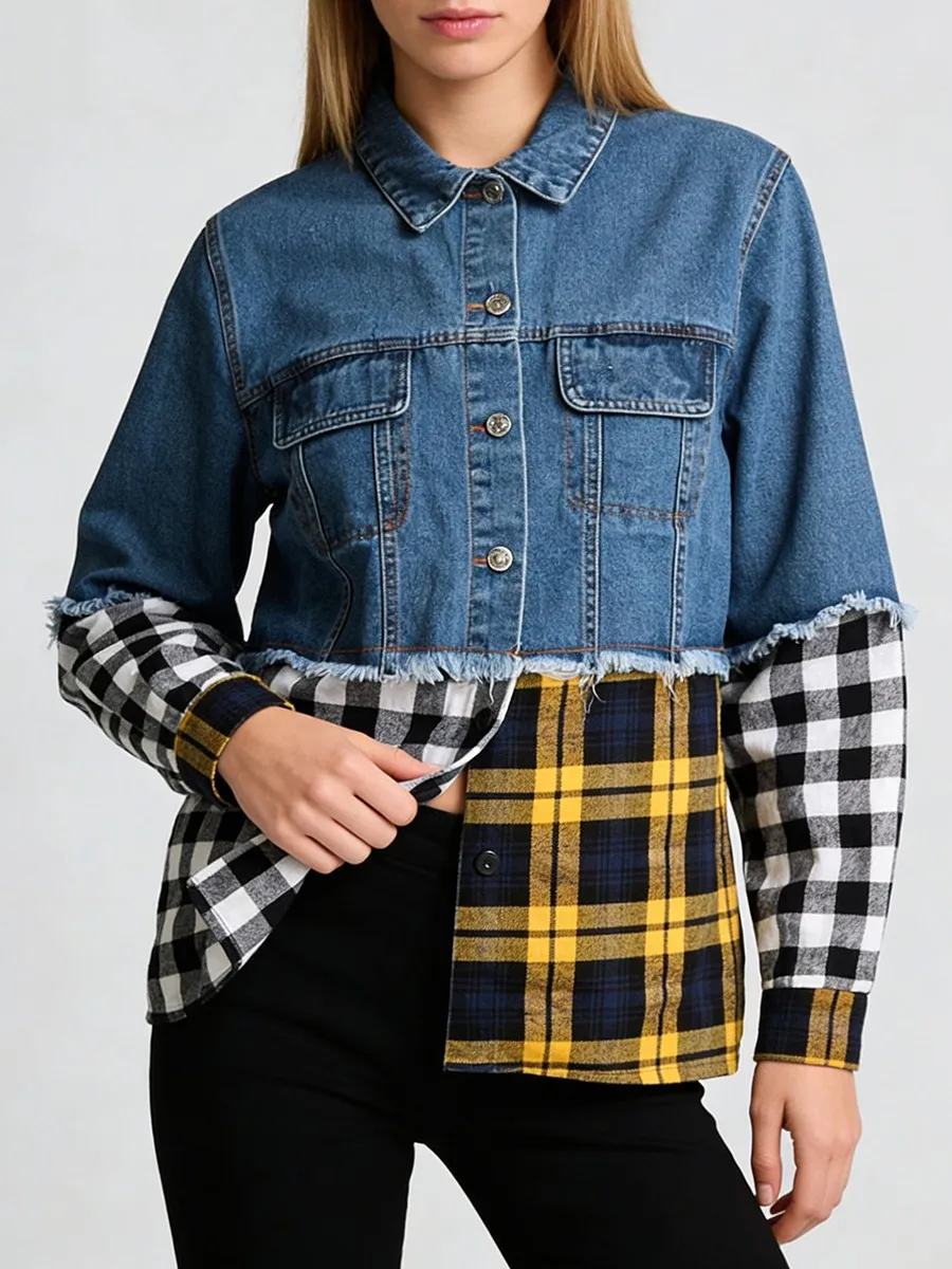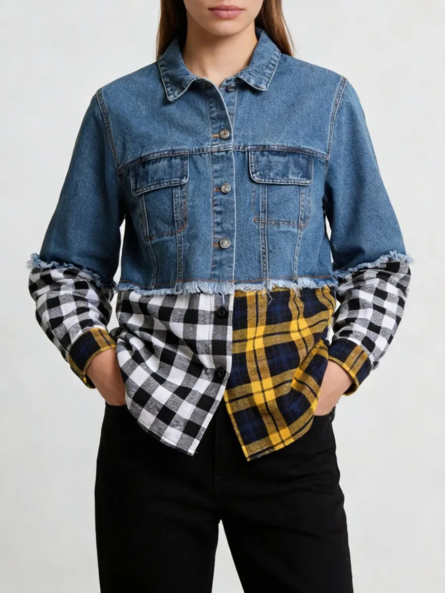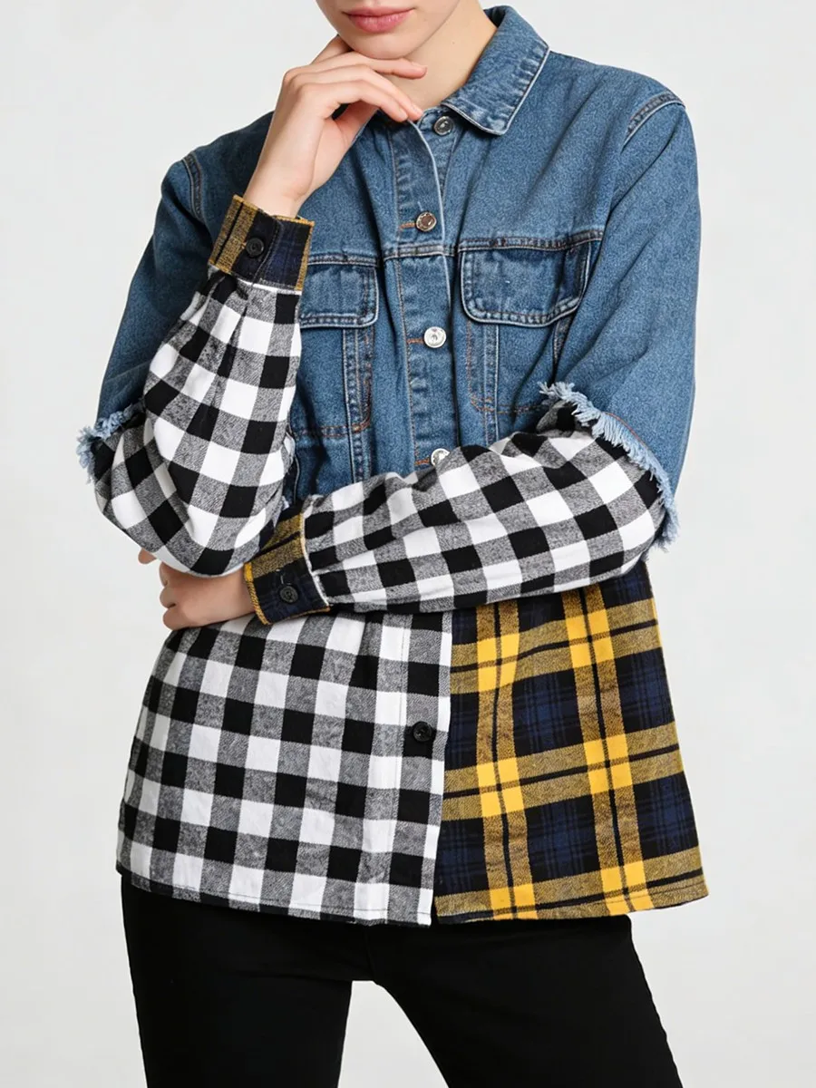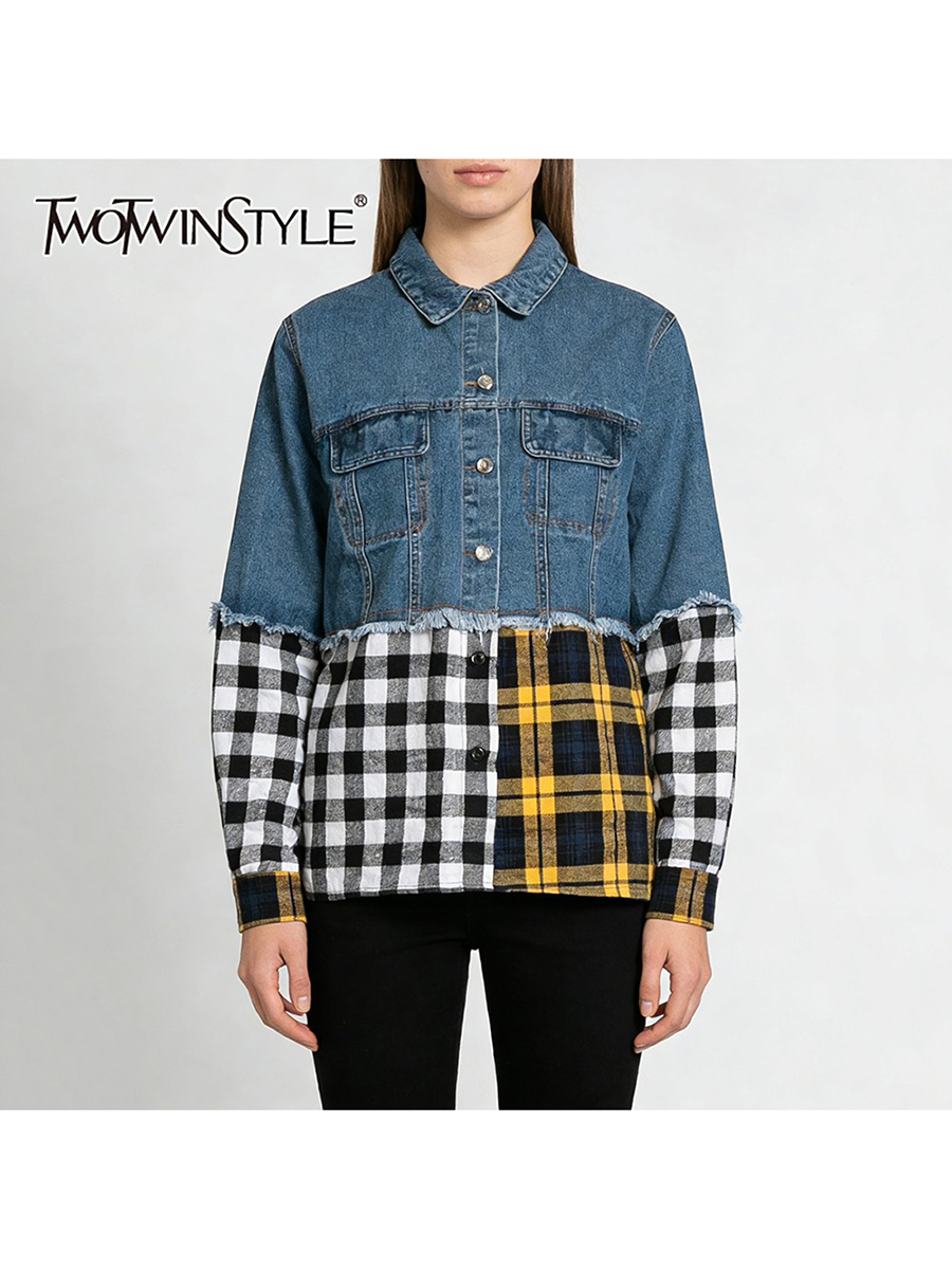 TWOTWINSTYLE Hit Color Spliced Plaid Design Sense Jacket for Women Lapel Long Sleeves Patchwork Frayed Cowboy Jackets Female New