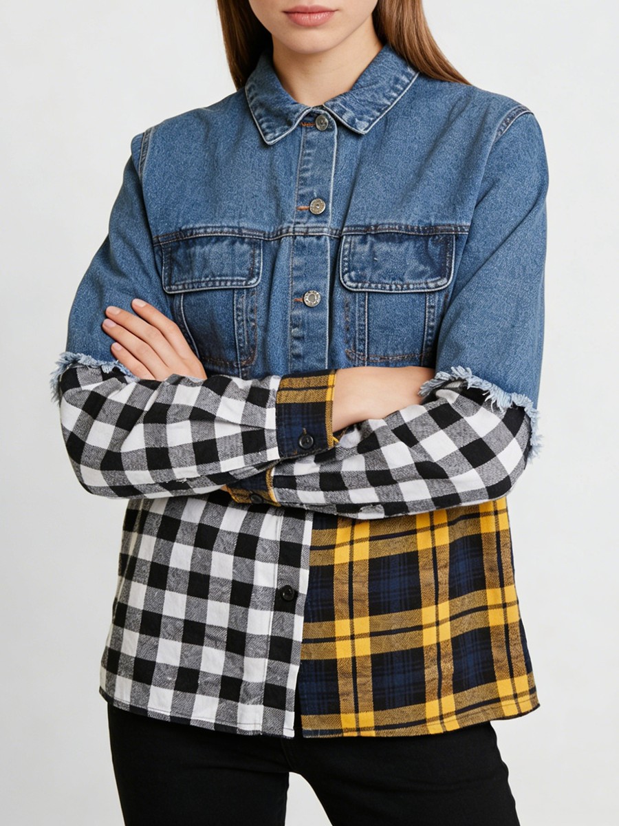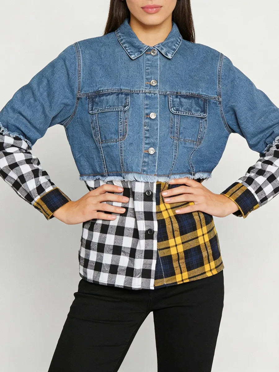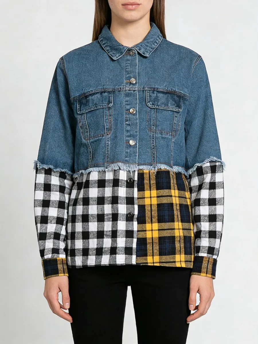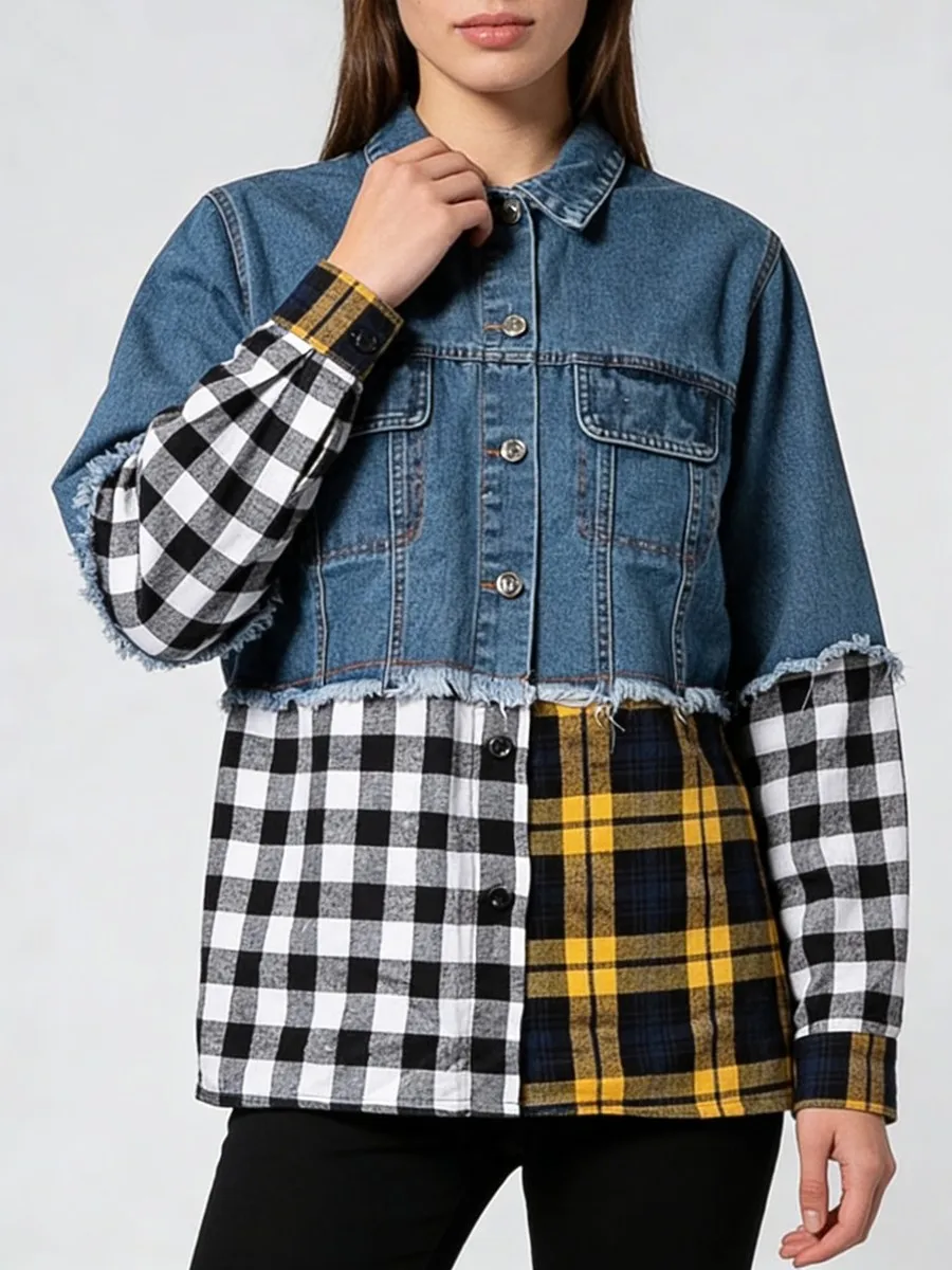 TWOTWINSTYLE Hit Color Spliced Plaid Design Sense Jacket for Women Lapel Long Sleeves Patchwork Frayed Cowboy Jackets Female New