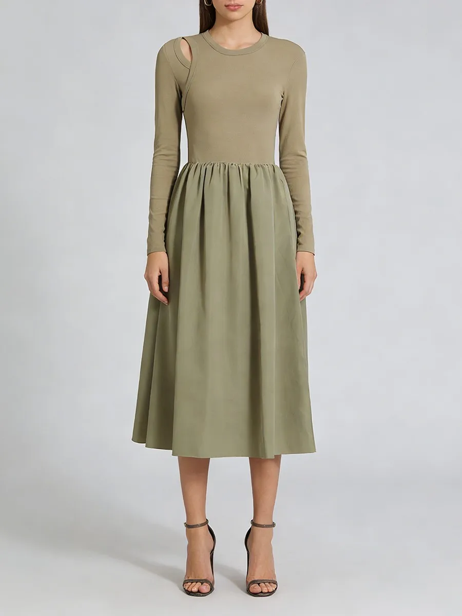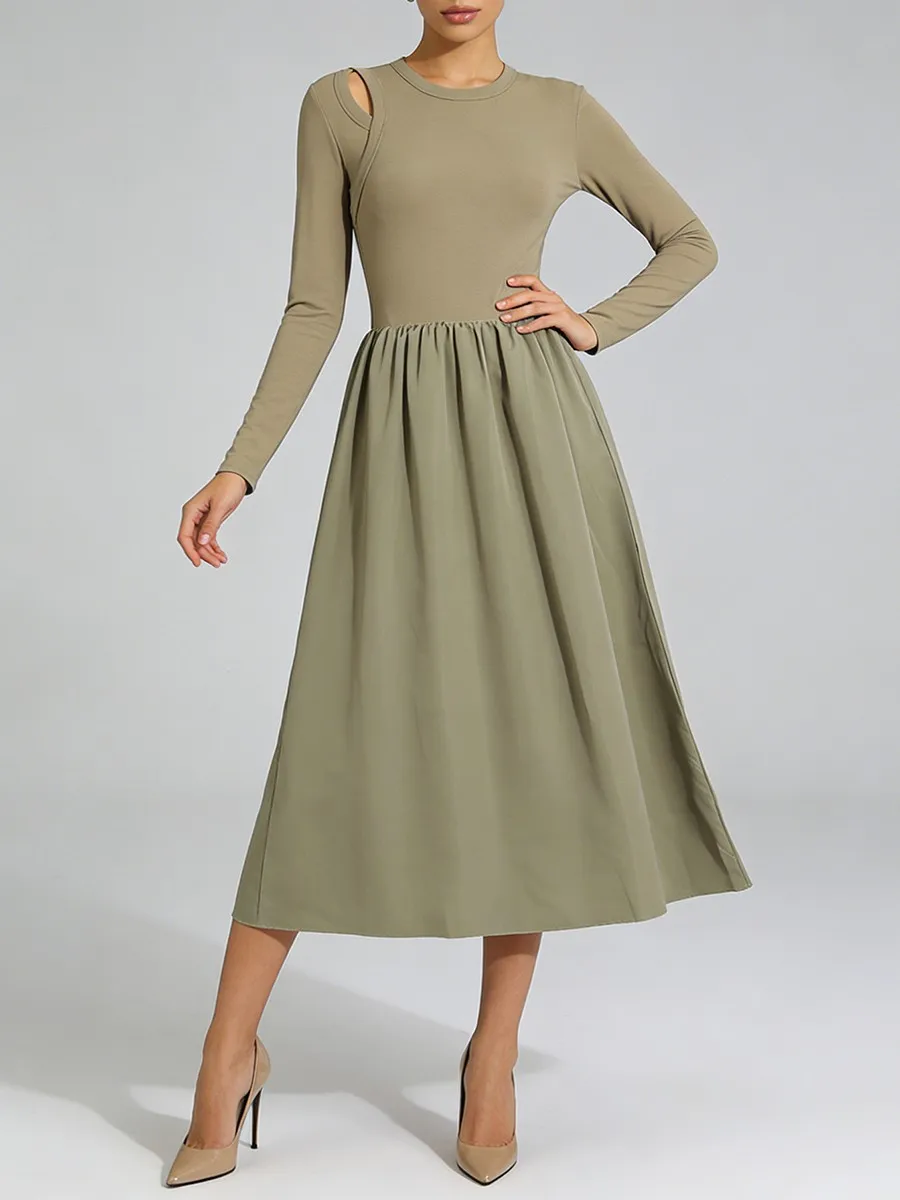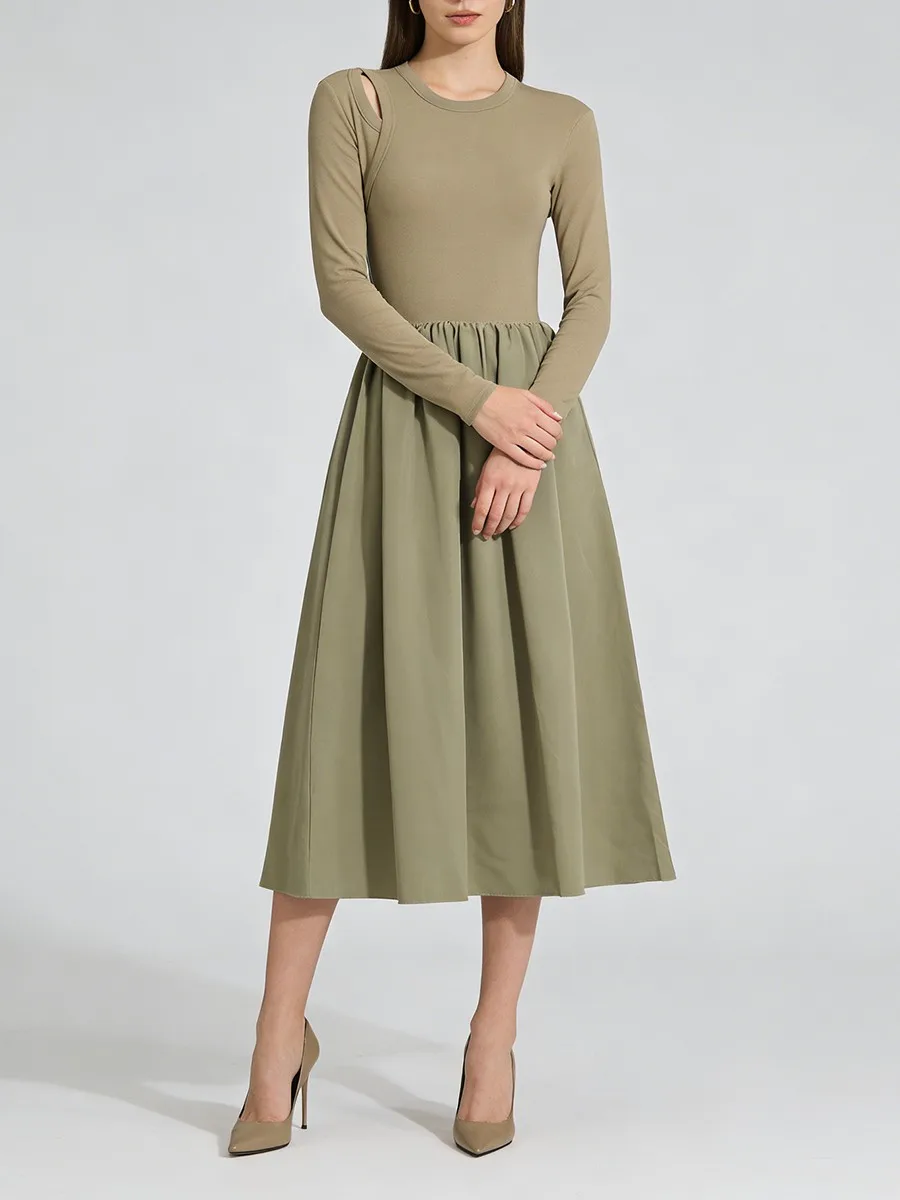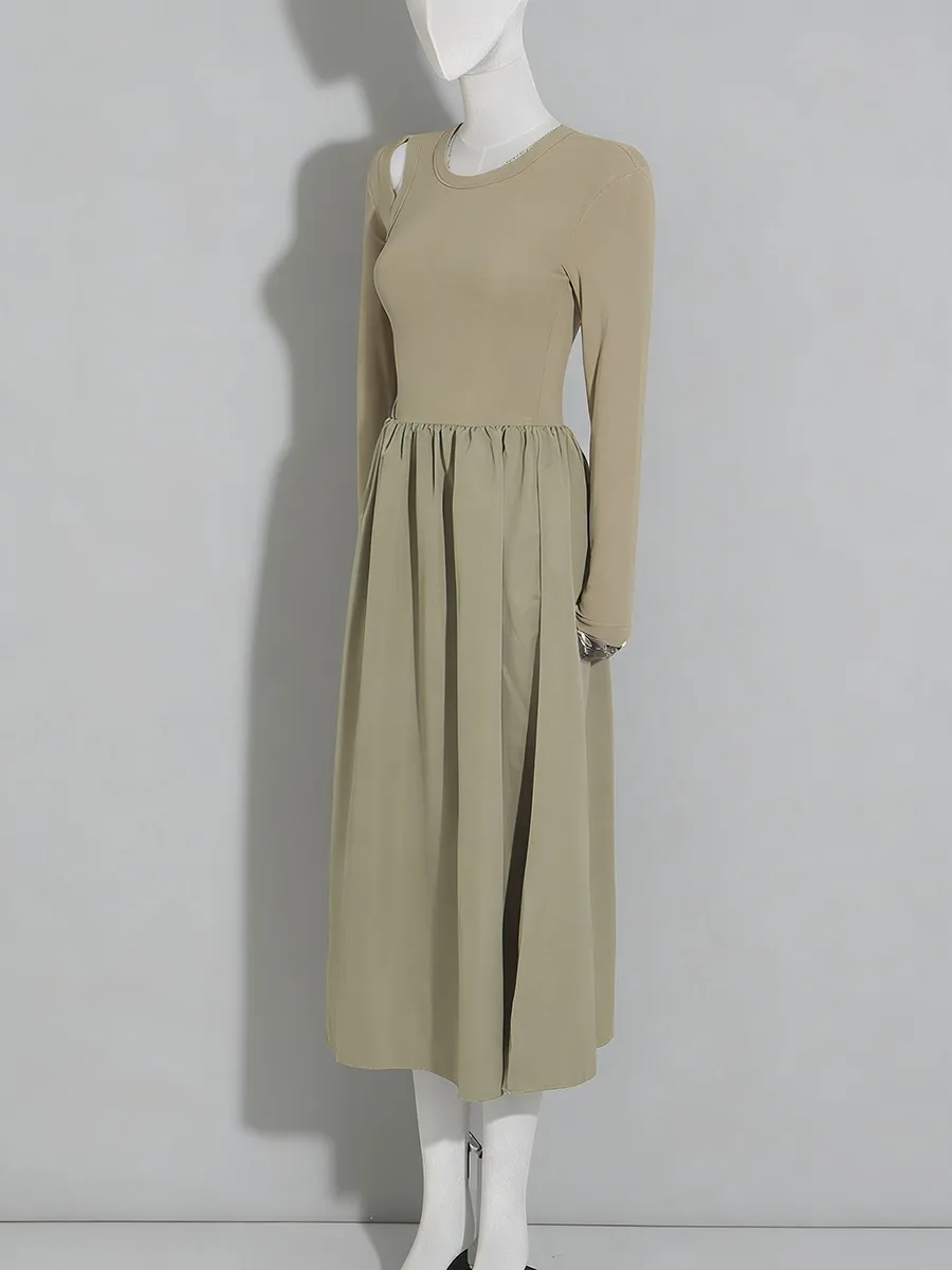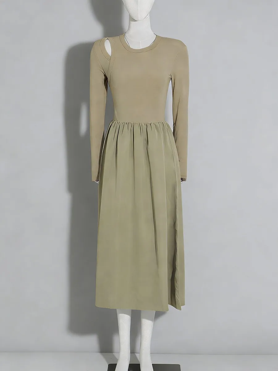TWOTWINSTYLE Hit Color Spliced Shirring Basics Dresses for Women O Neck Long Sleeves Tunic Hollow Out Design Sense Dress Female