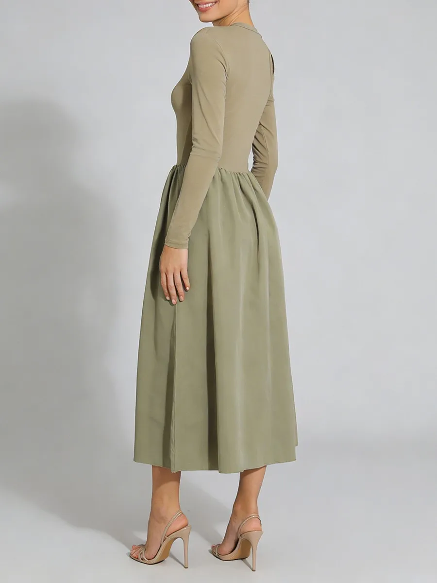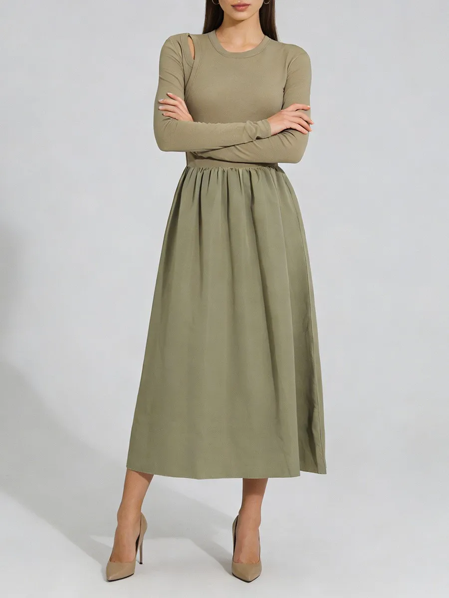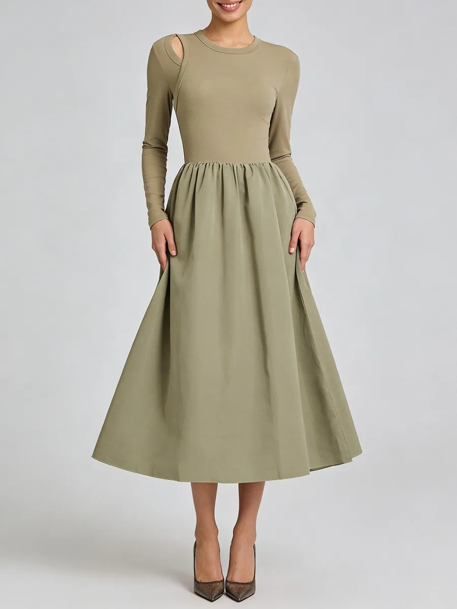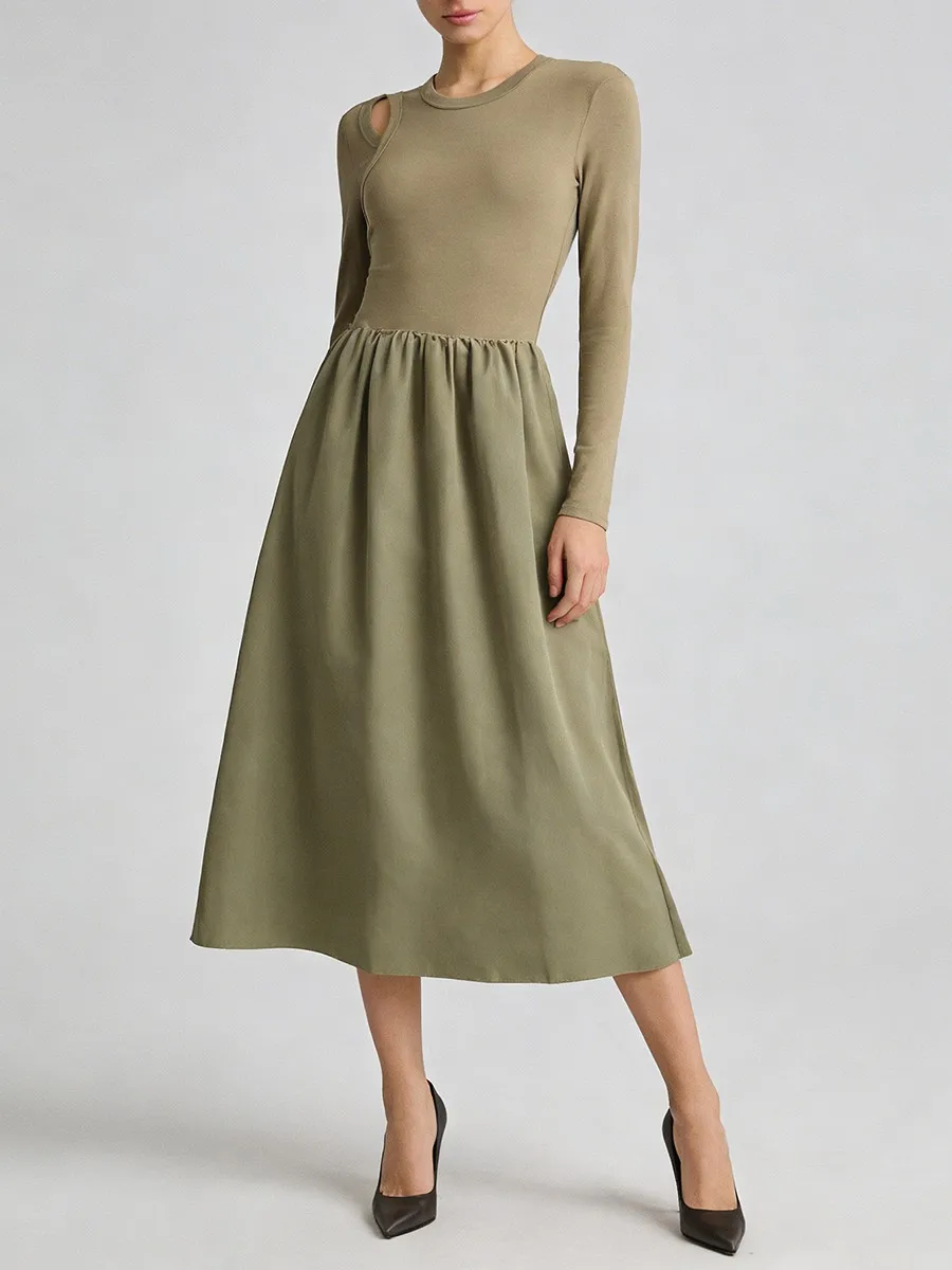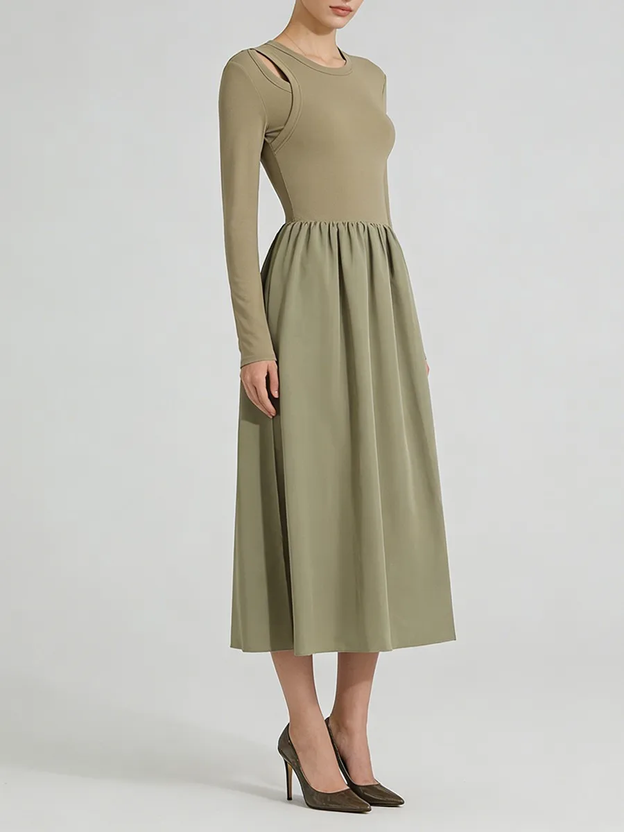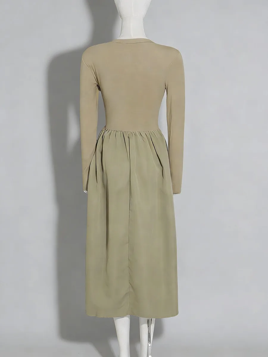 TWOTWINSTYLE Hit Color Spliced Shirring Basics Dresses for Women O Neck Long Sleeves Tunic Hollow Out Design Sense Dress Female