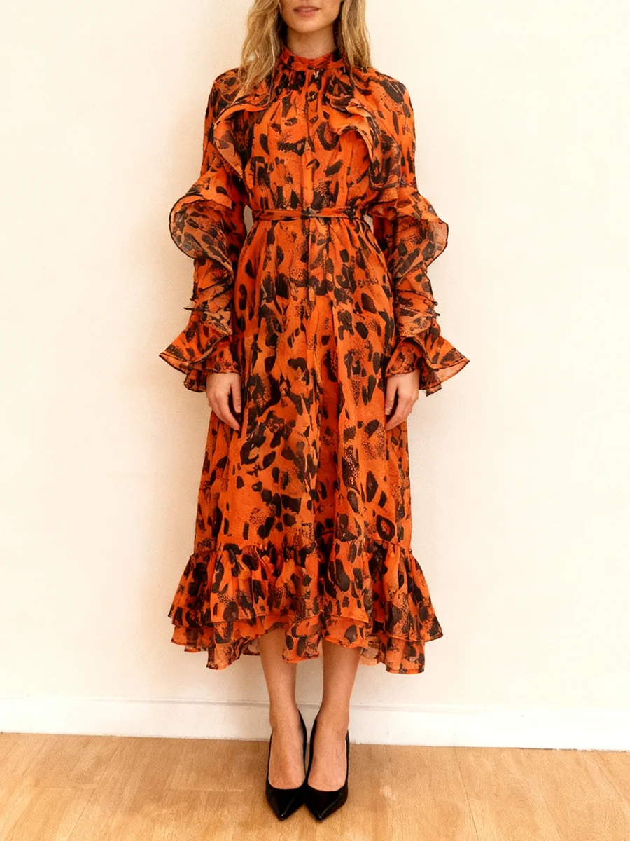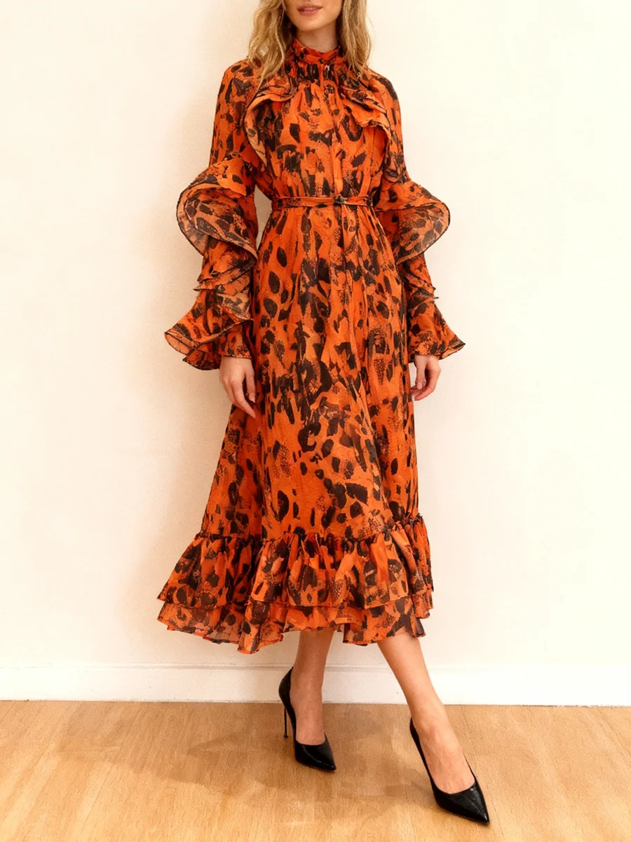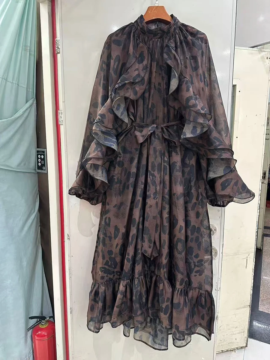 TWOTWINSTYLE Leopard Spliced Ruffles Folds Elegant Dresses for Women Round Neck Long Sleeves Patchwork Lace Up Dress Female New
