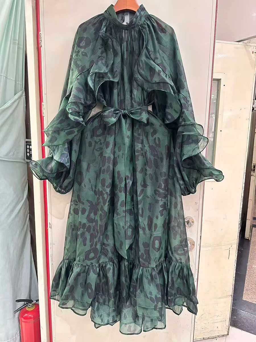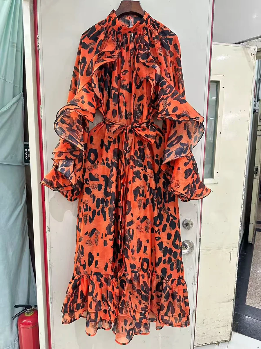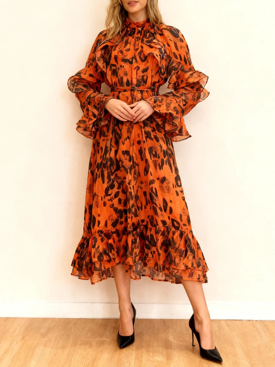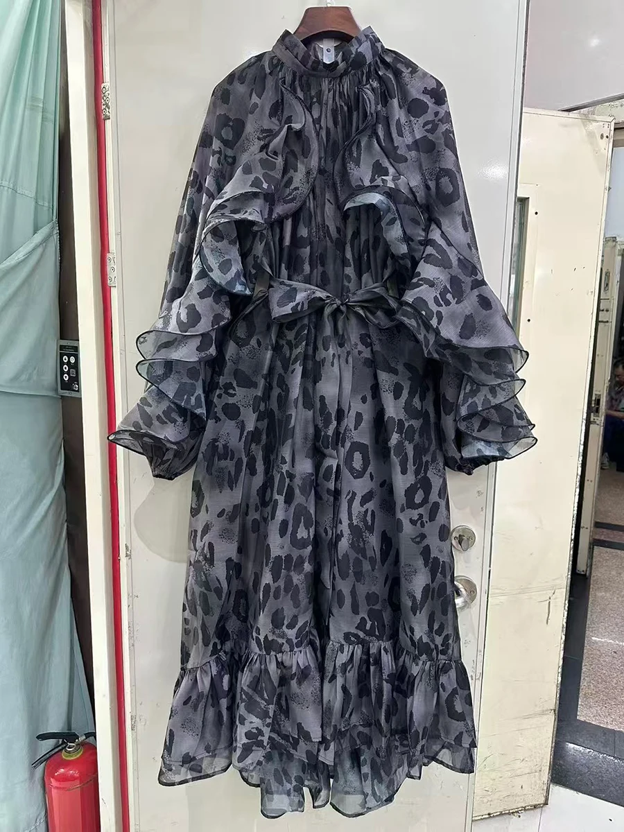 TWOTWINSTYLE Leopard Spliced Ruffles Folds Elegant Dresses for Women Round Neck Long Sleeves Patchwork Lace Up Dress Female New