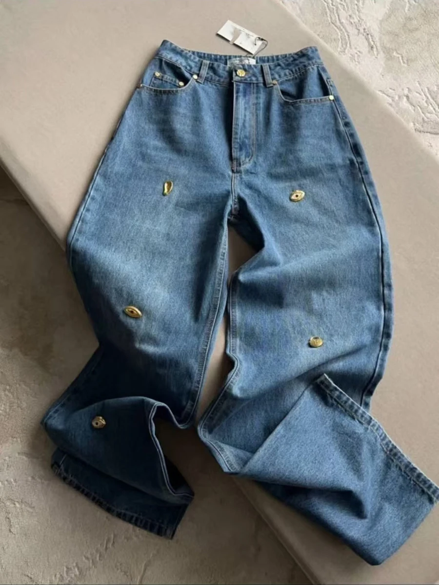 TWOTWINSTYLE Loose Spliced Metal Decoration Versatile Jeans for Women High Waist Casual Wide Leg Jean Female Fashion Clothes New