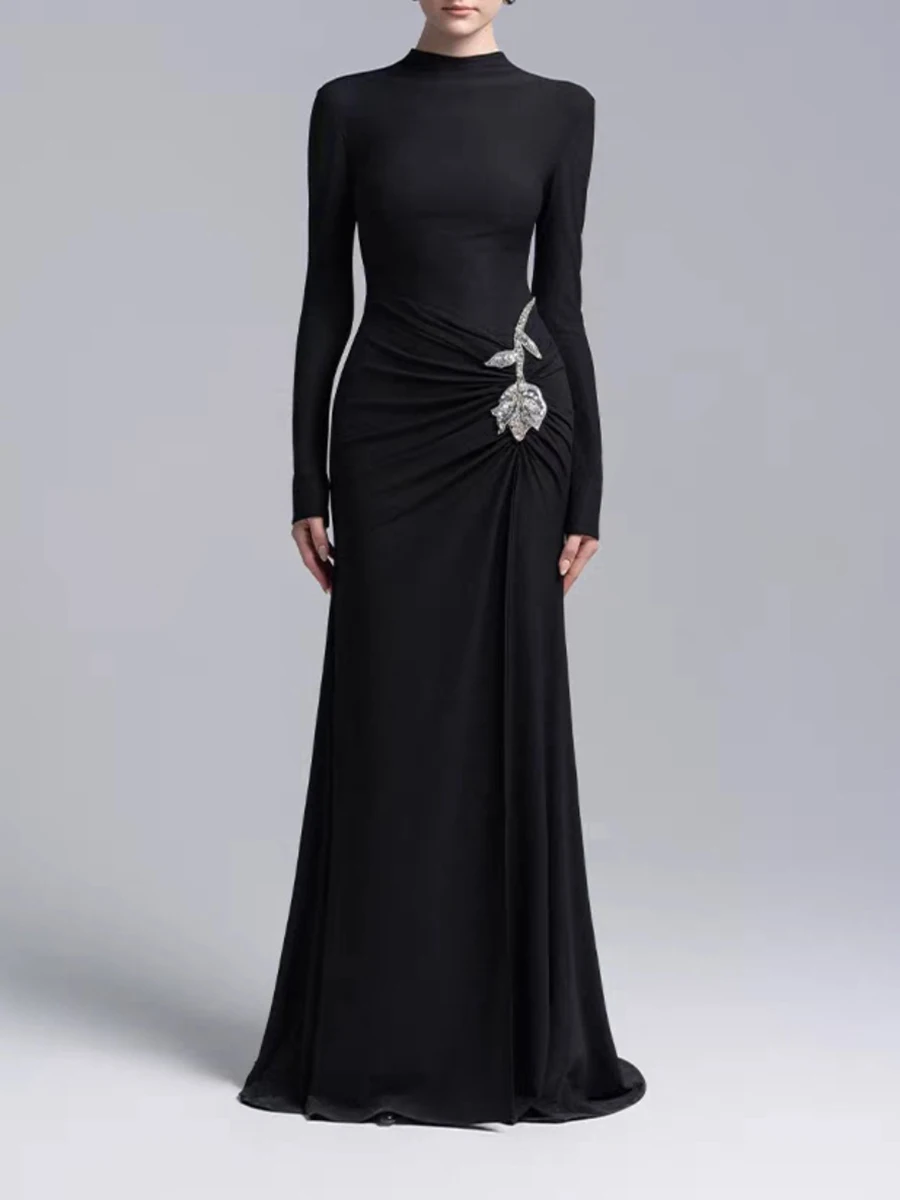 TWOTWINSTYLE Mimimalist Solid Evening Dresses for Women Stand Neck Long Sleeve High Waist Spliced Sequins Rose Dress Female New