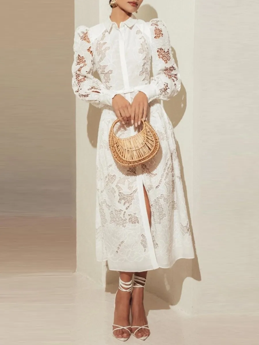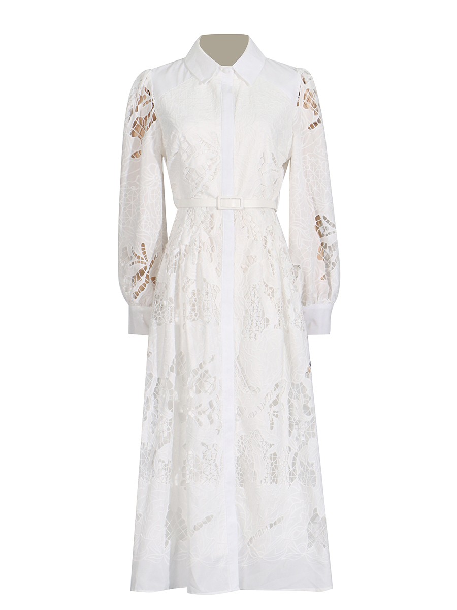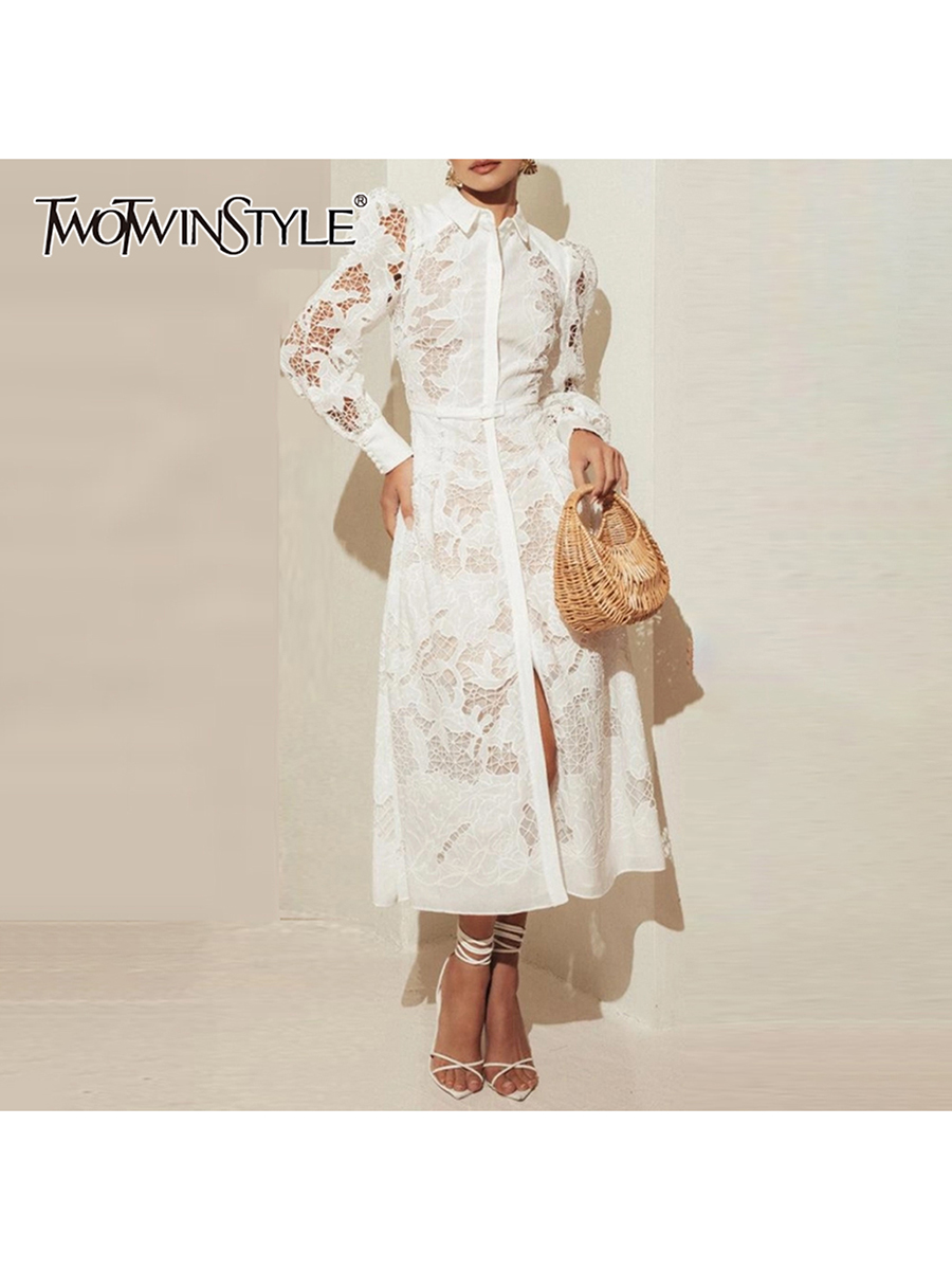 TWOTWINSTYLE Minimalist Hollow Out Spliced Lace Long Dresses for Women Lapel Long Sleeves High Waist Temperament Dress Female