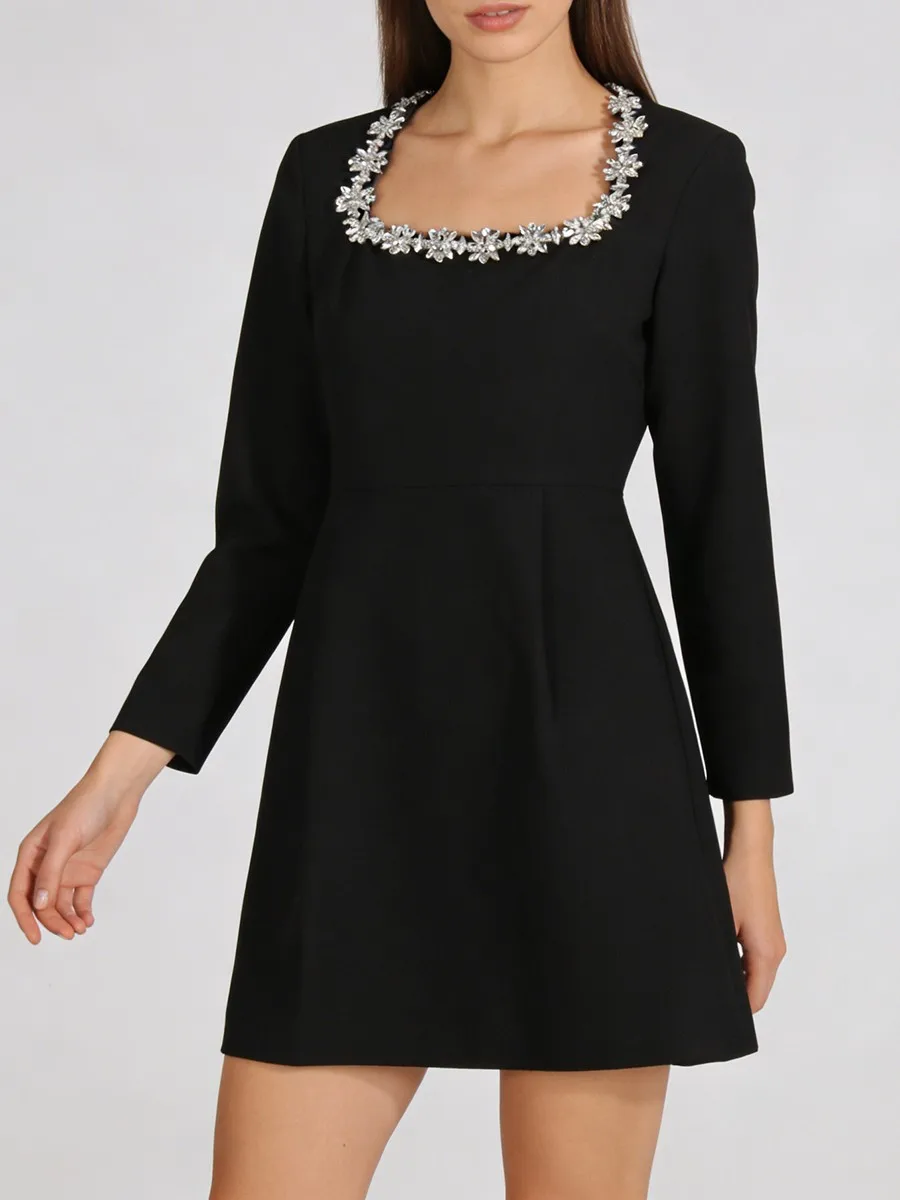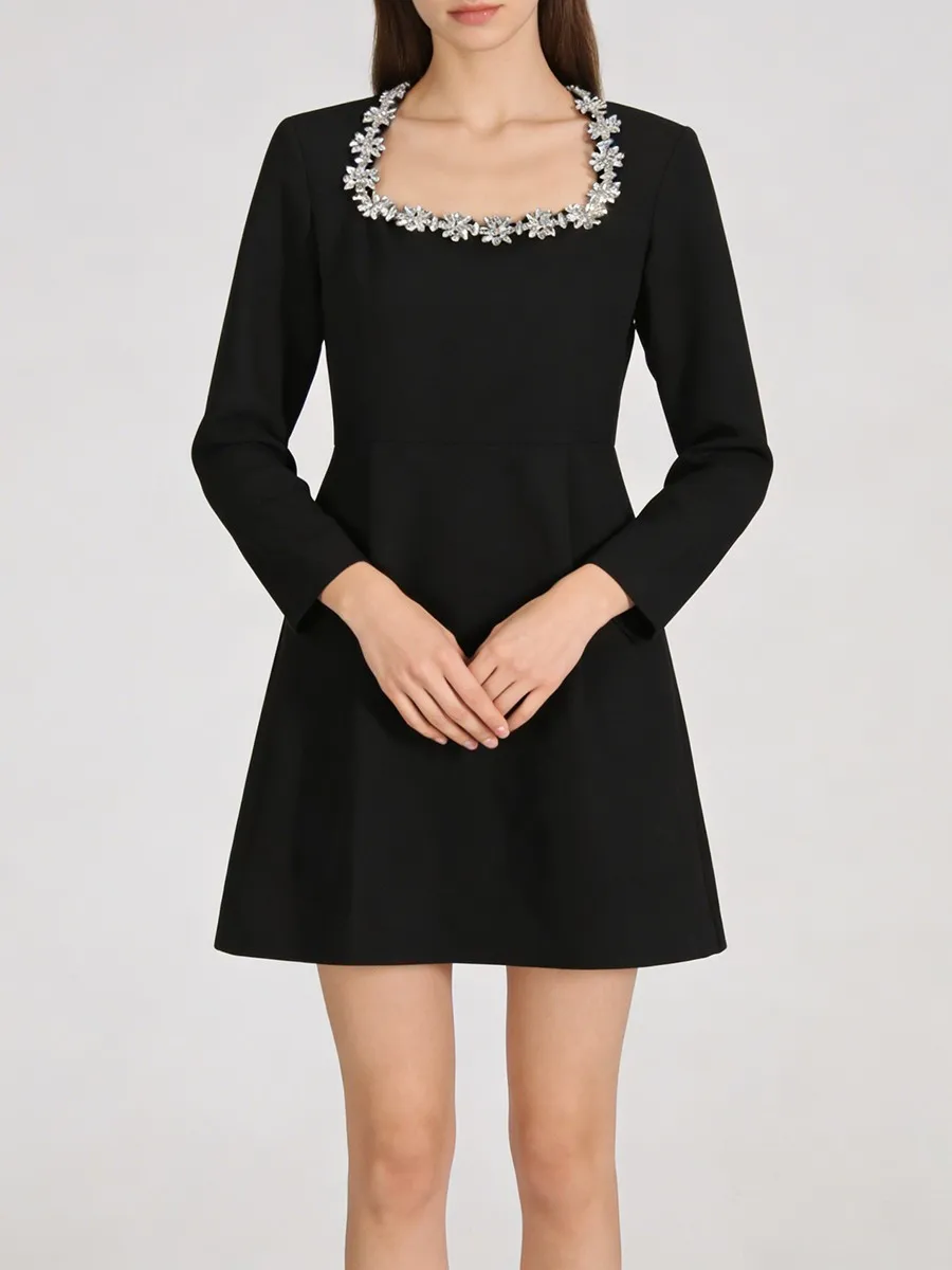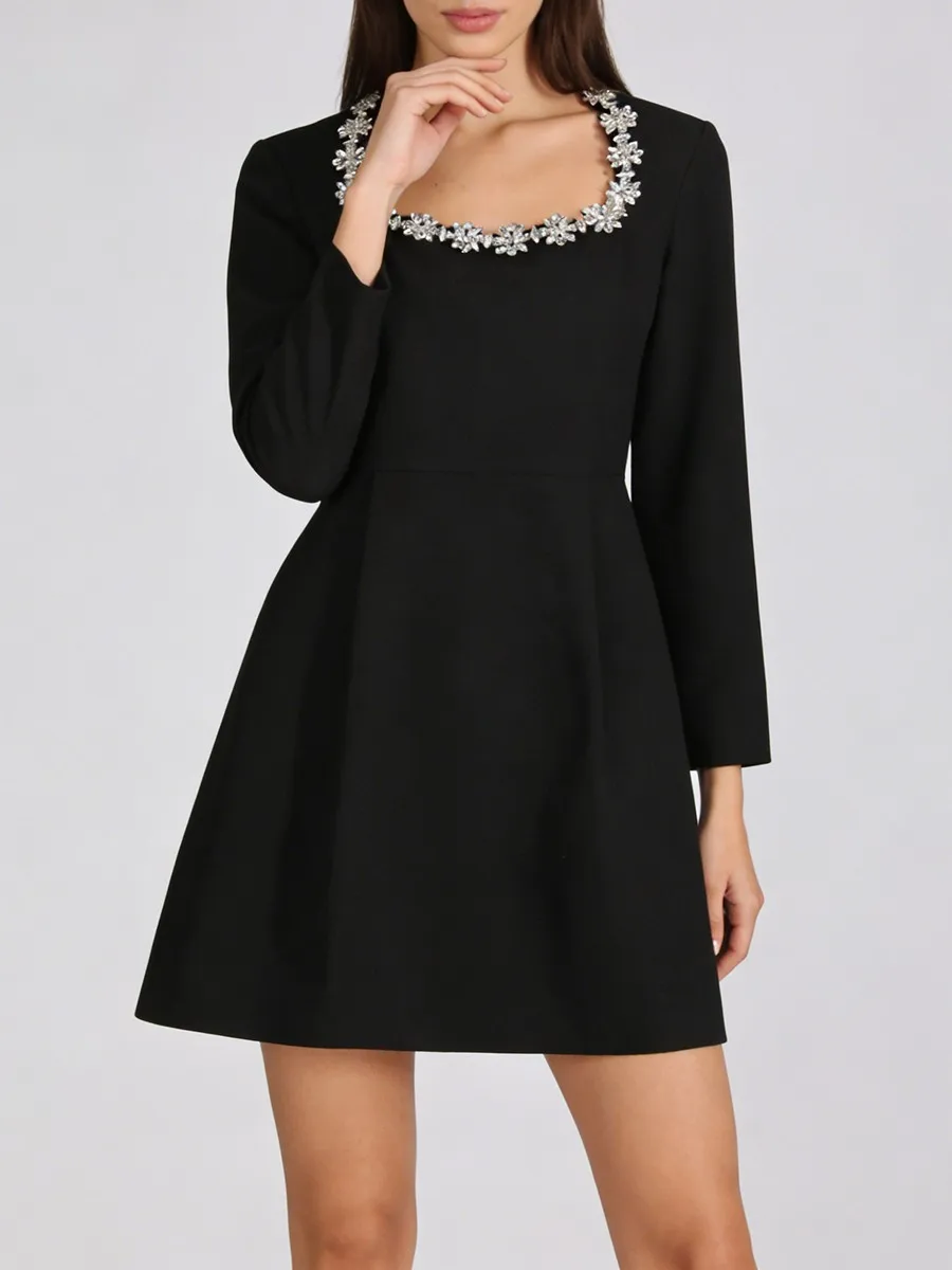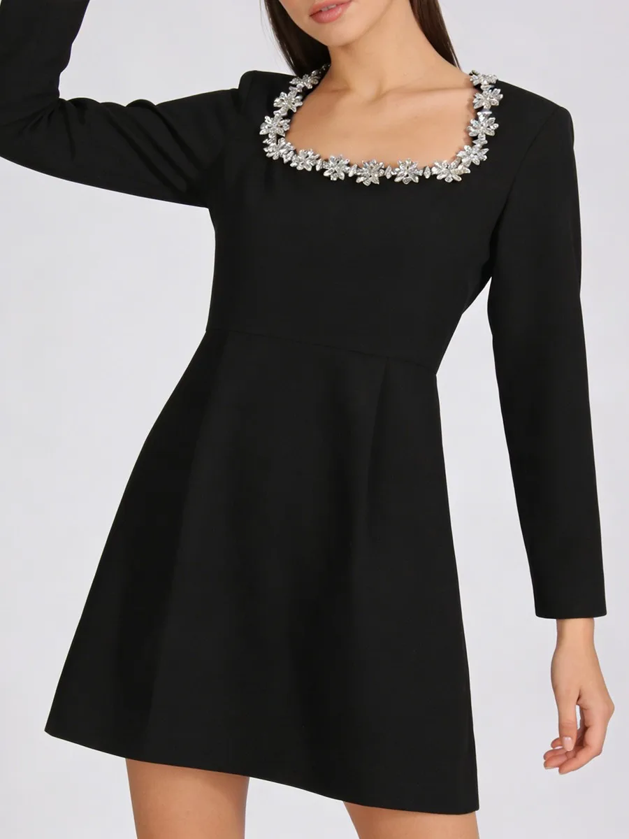 TWOTWINSTYLE Minimalist Spliced Diamonds Slimming Dress for Women Square Neck Long Sleeves High Waist Elegant Dresses Female New