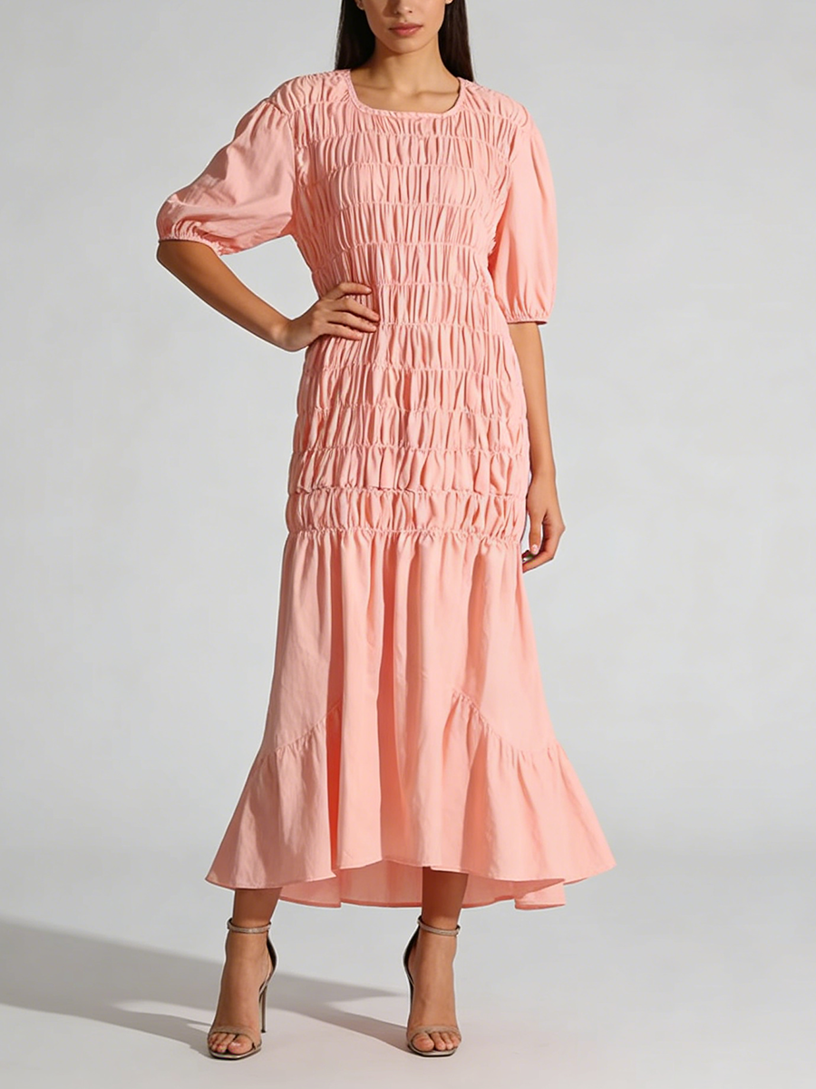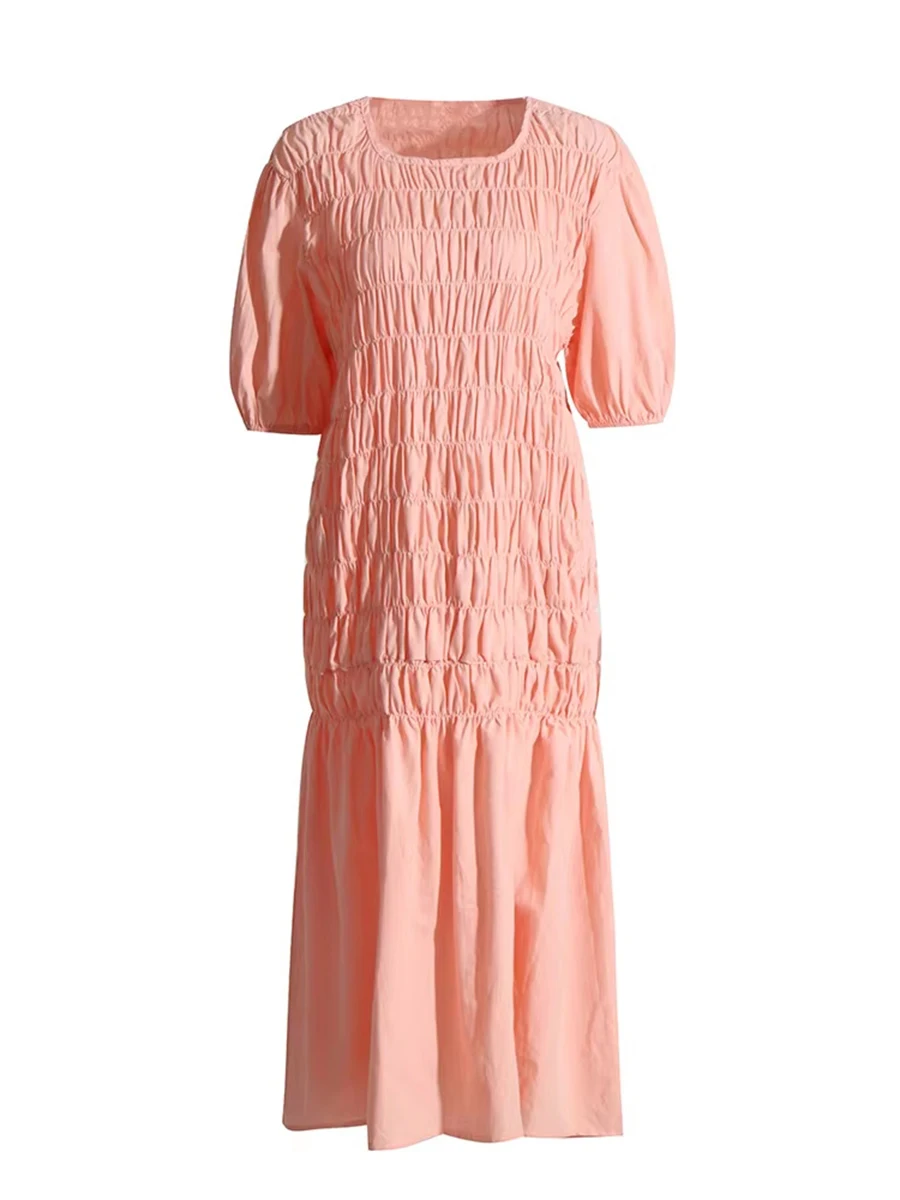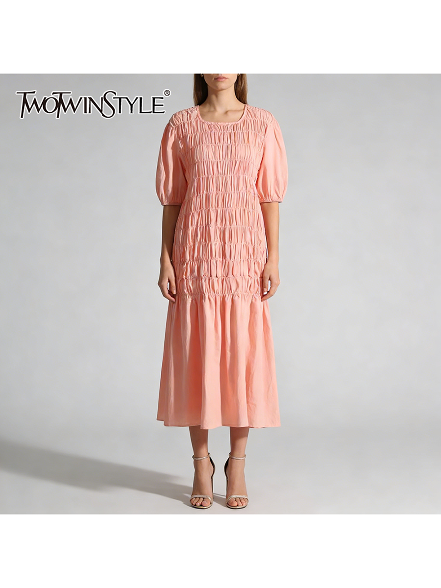 TWOTWINSTYLE Pink Loose Spliced Shirring Fashion Dreses for Women Square Neck Half Sleeves Casual Long Dress Female Clothing New