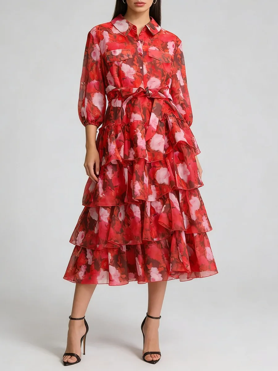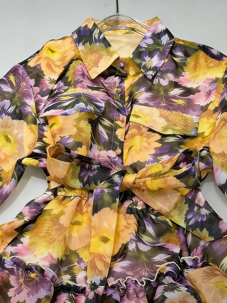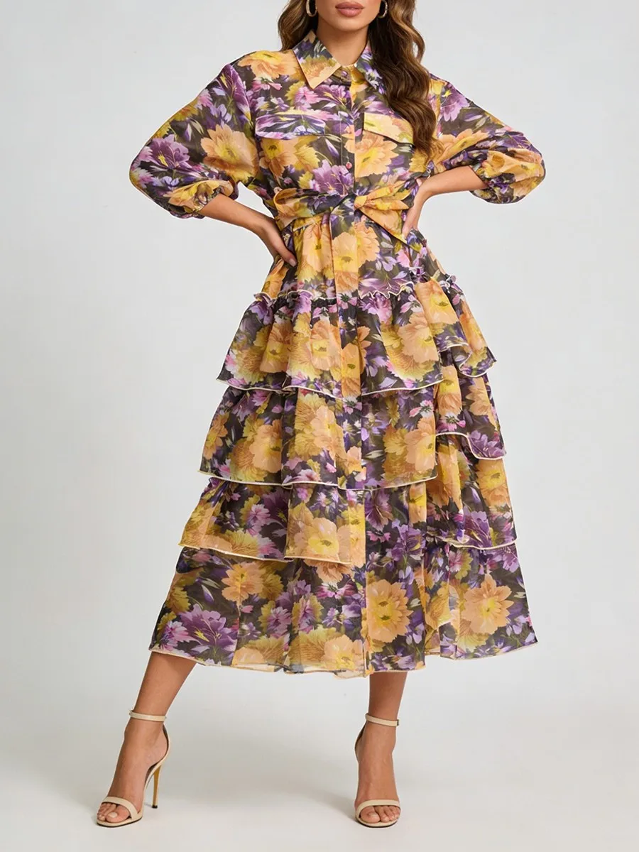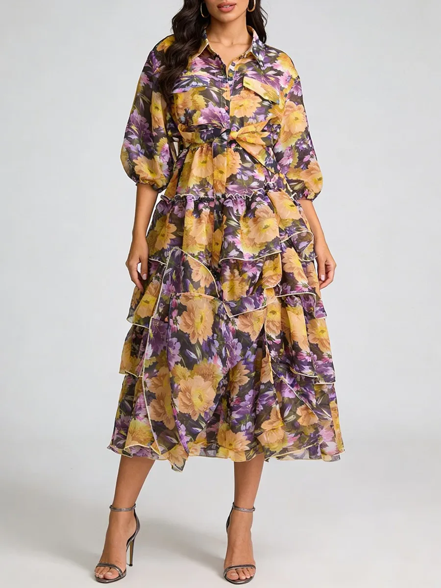 TWOTWINSTYLE Printing Loose Apliced Lace Up Casual Dresses for Women Lapel Half Sleeves Patchwork Ruffles Dress Female Clothing