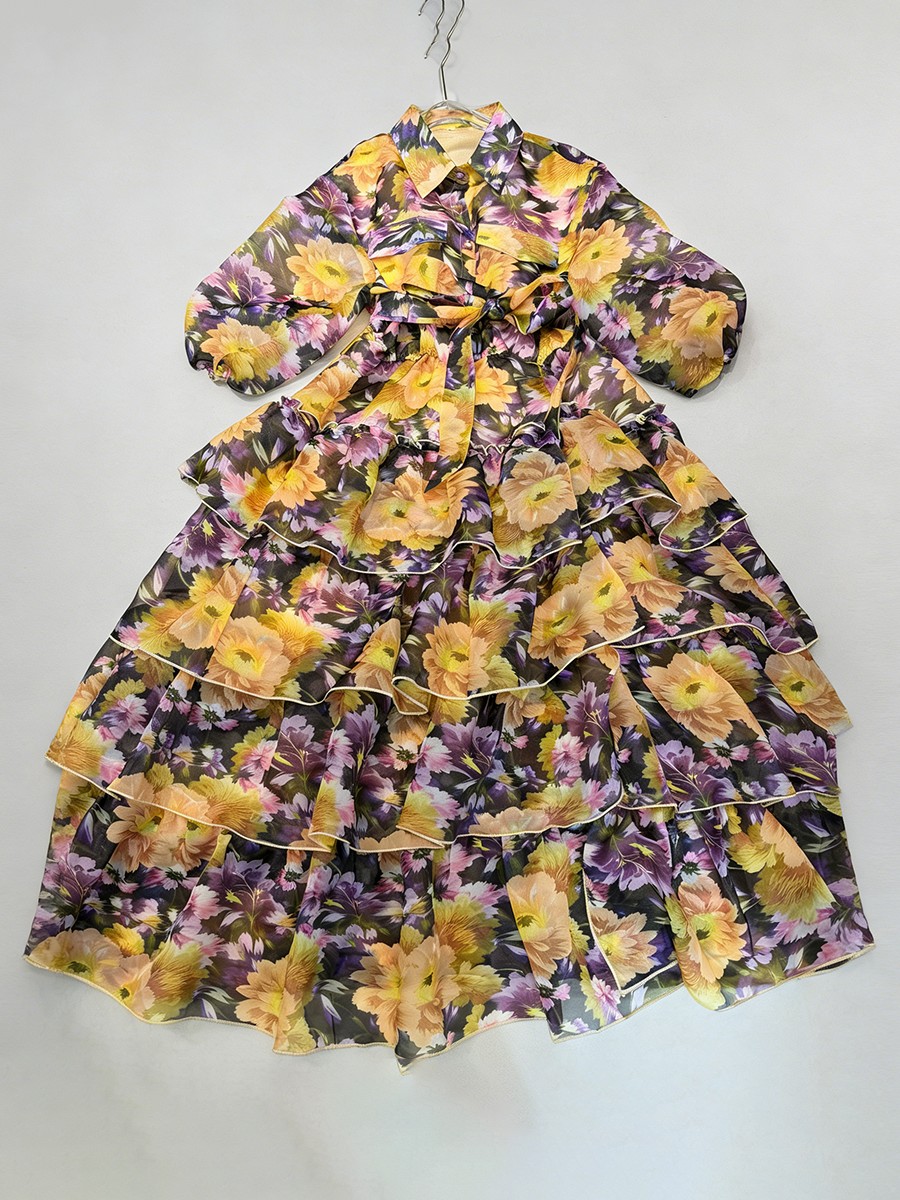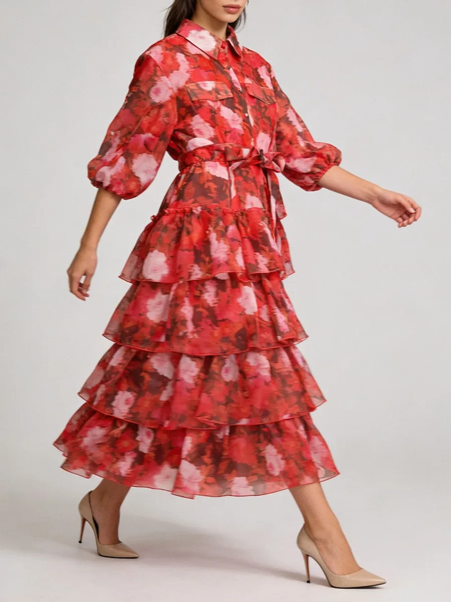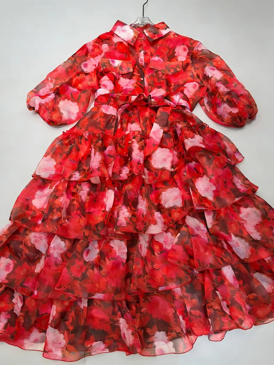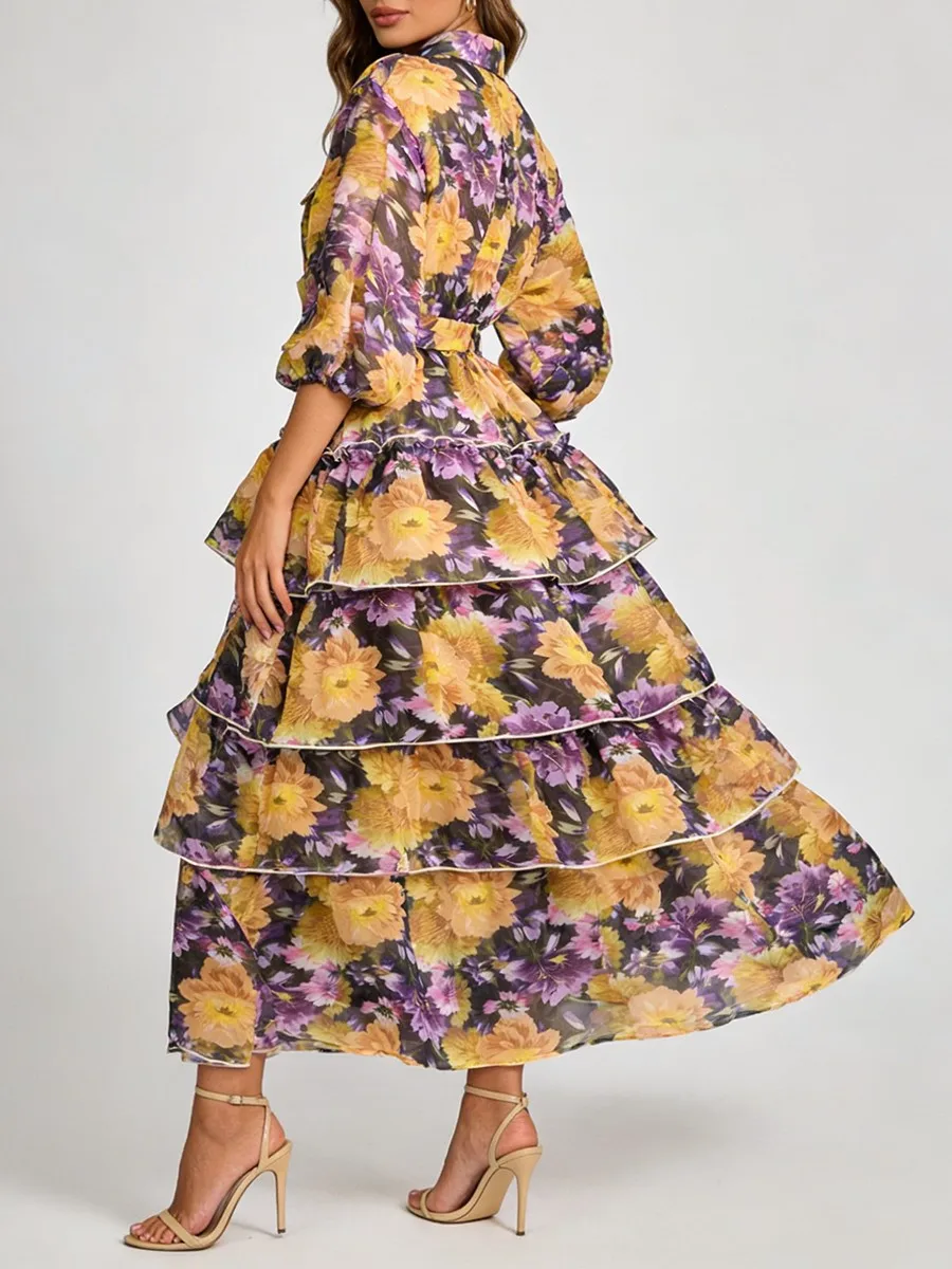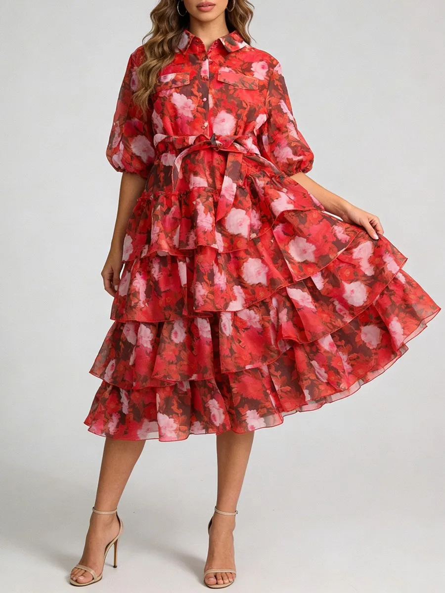 TWOTWINSTYLE Printing Loose Apliced Lace Up Casual Dresses for Women Lapel Half Sleeves Patchwork Ruffles Dress Female Clothing