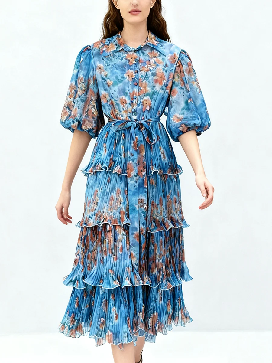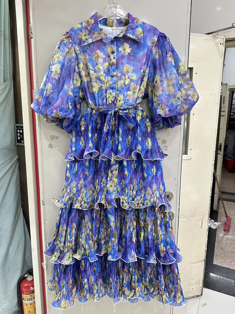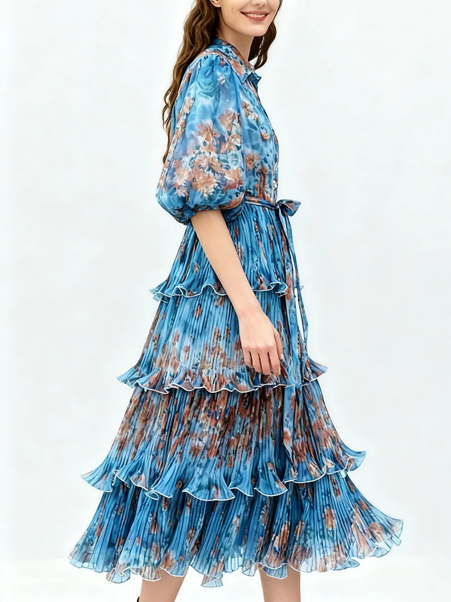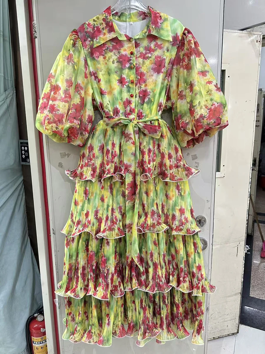 TWOTWINSTYLE Printing Loose Spliced Ruffles Folds Casual Dresses for Women Lapel Half Sleeves Patchwork Lace Up Dress Female New