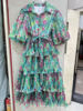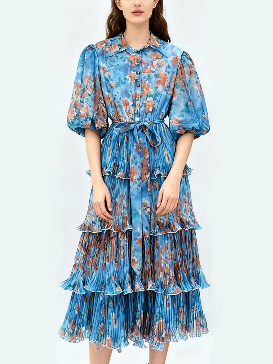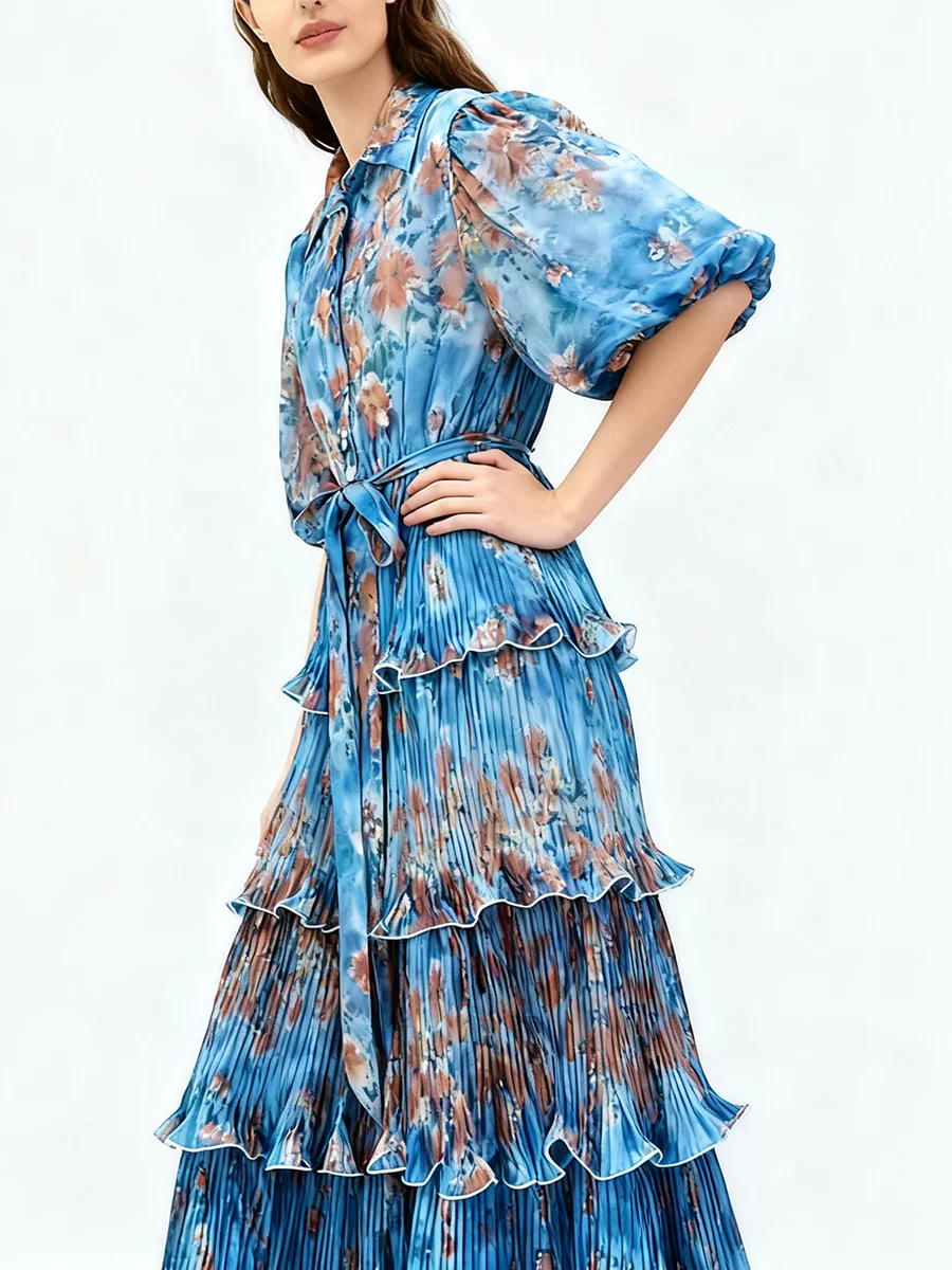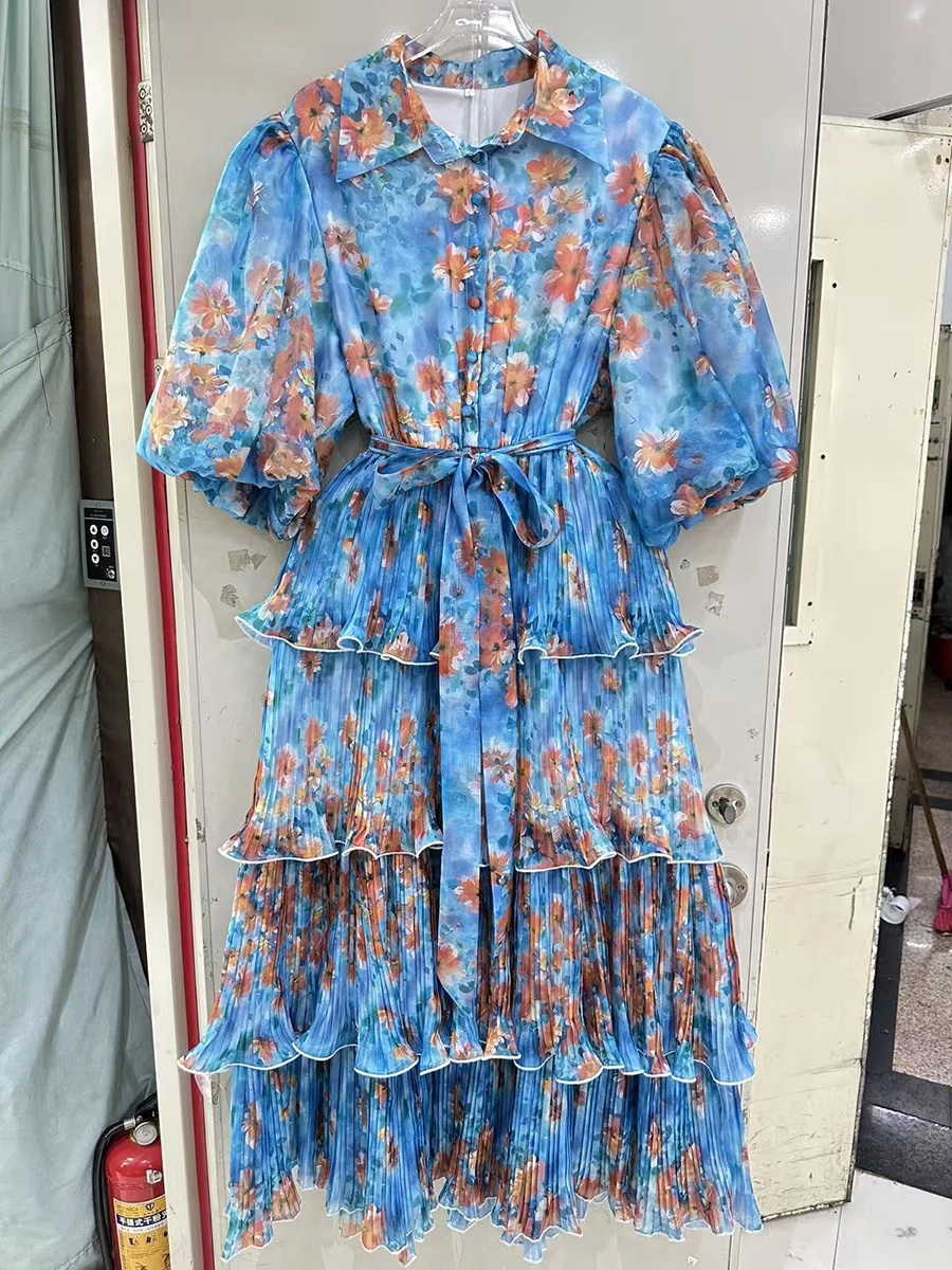 TWOTWINSTYLE Printing Loose Spliced Ruffles Folds Casual Dresses for Women Lapel Half Sleeves Patchwork Lace Up Dress Female New