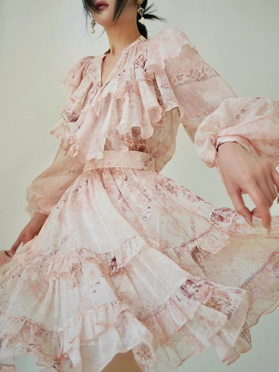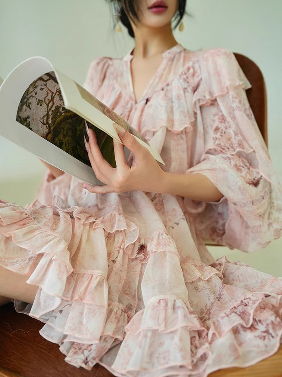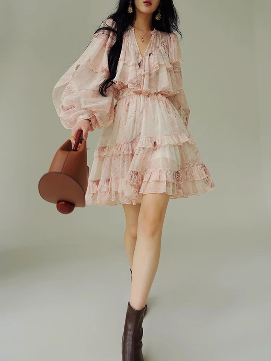 TWOTWINSTYLE Printing Loose Spliced Ruffles Folds Dresses for Women V Neck Long Sleeves High Waist Elegant Dress Female Clothing