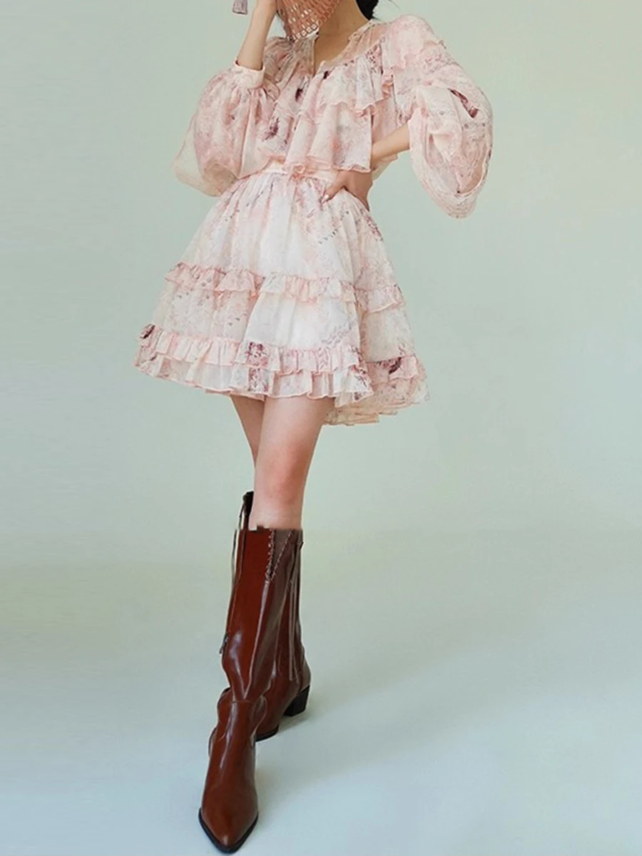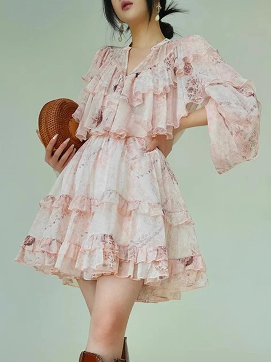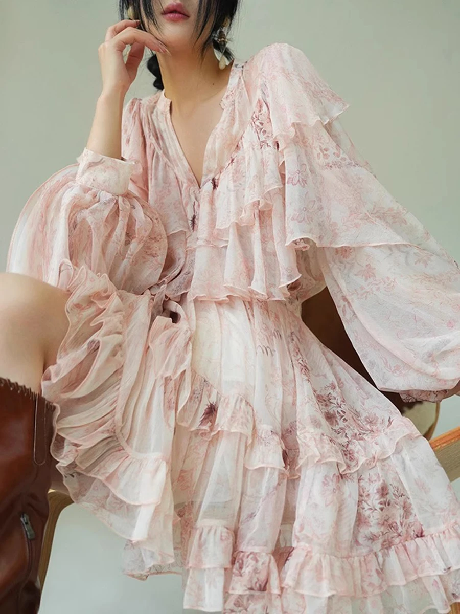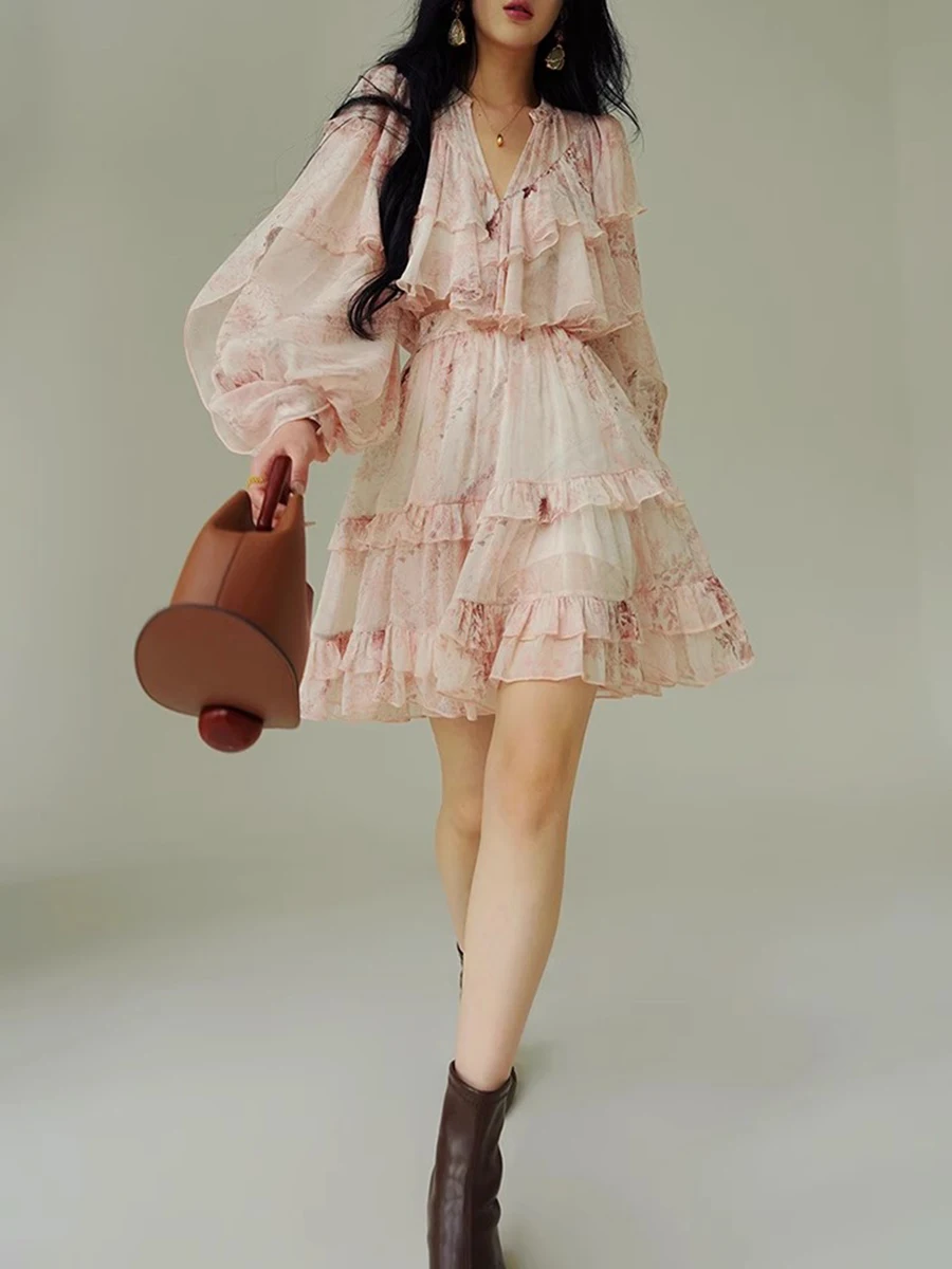 TWOTWINSTYLE Printing Loose Spliced Ruffles Folds Dresses for Women V Neck Long Sleeves High Waist Elegant Dress Female Clothing