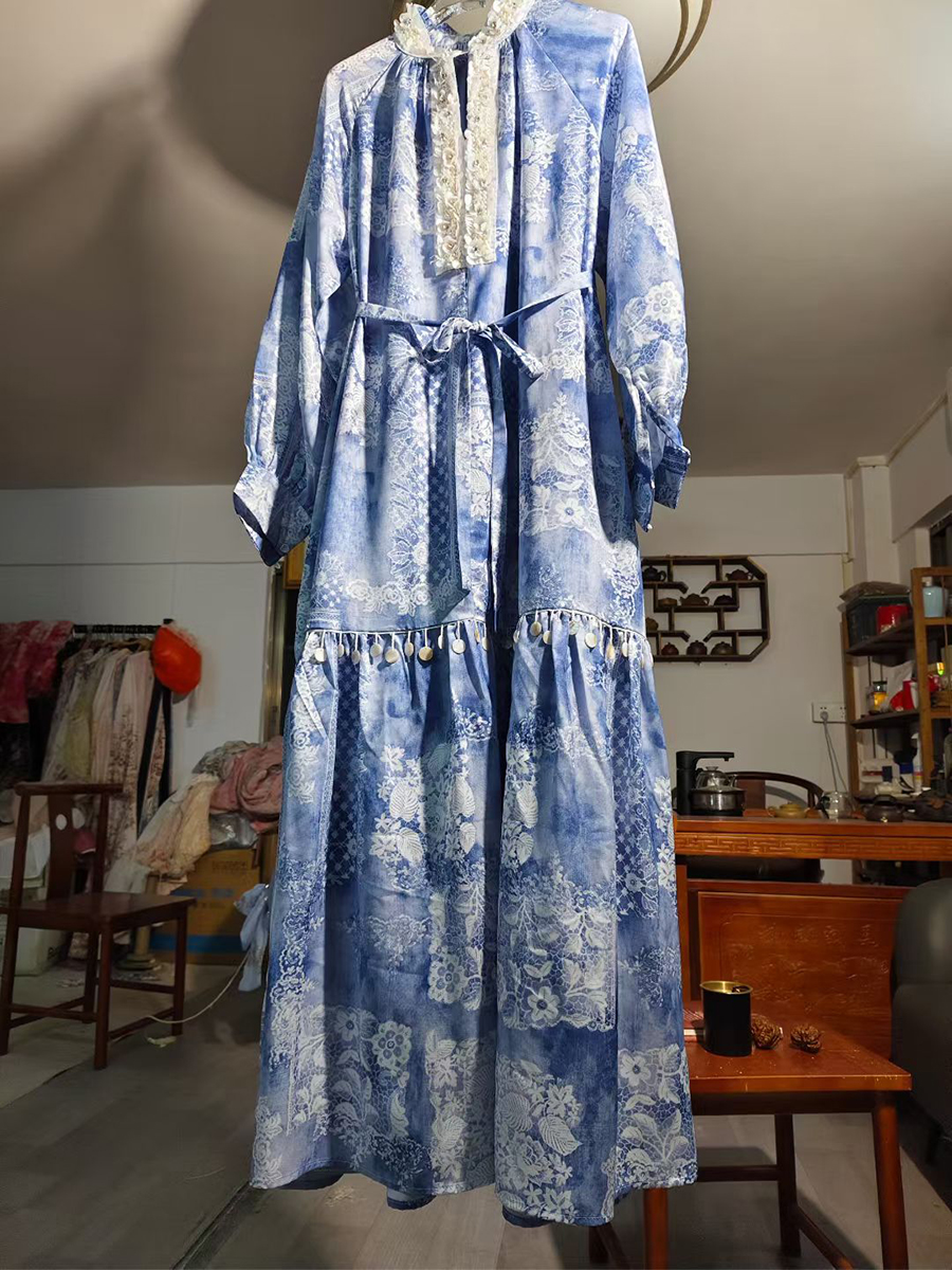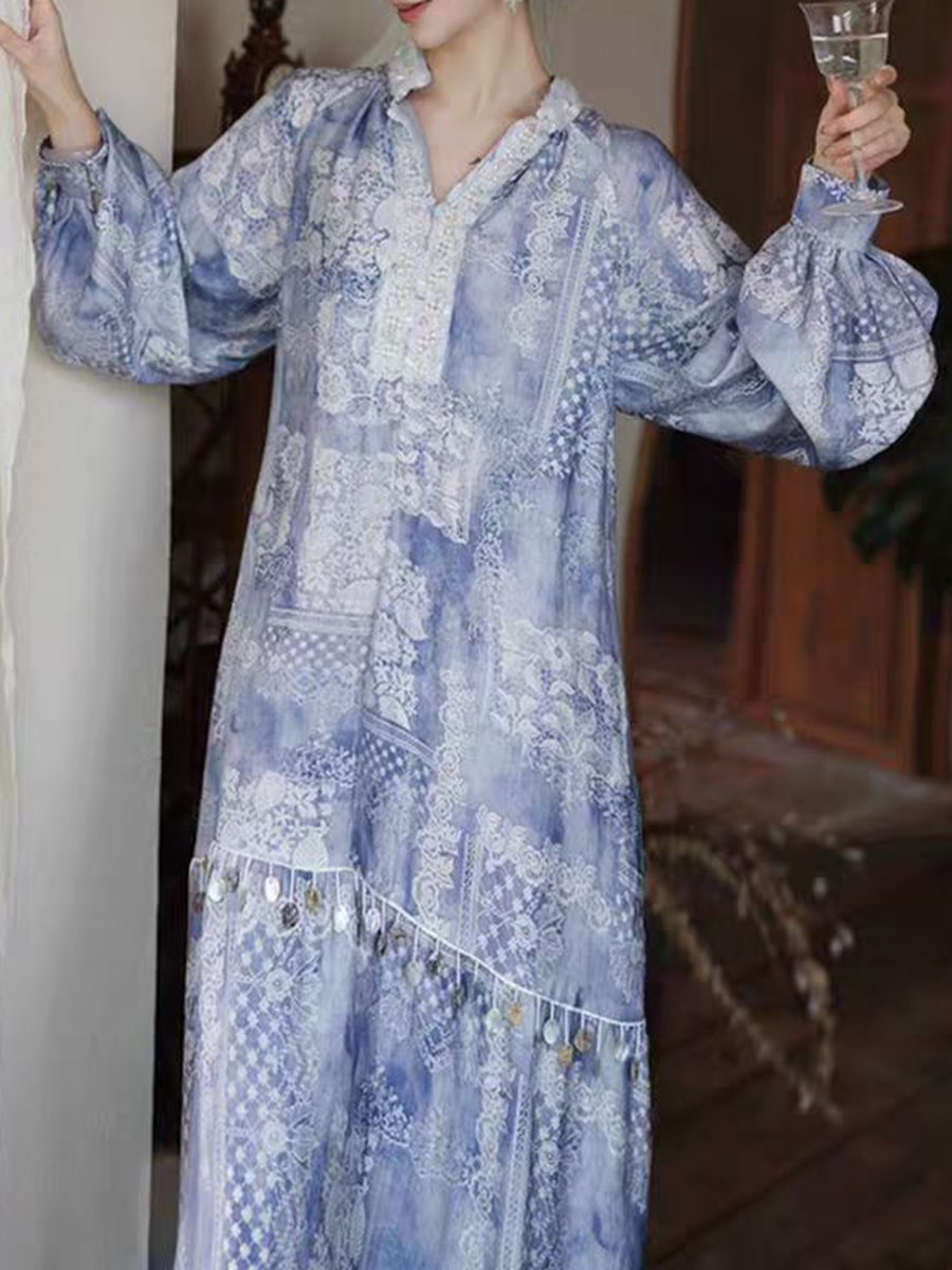 TWOTWINSTYLE Printing Loose Spliced Sequins Elegant Dresses for Women V Neck Long Sleeves Patchwork Hot Fix Dress Female Fashion