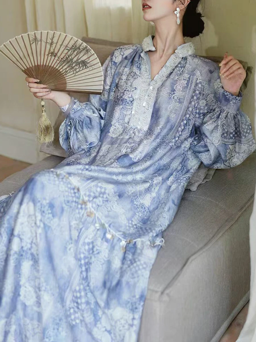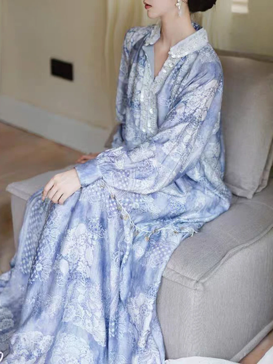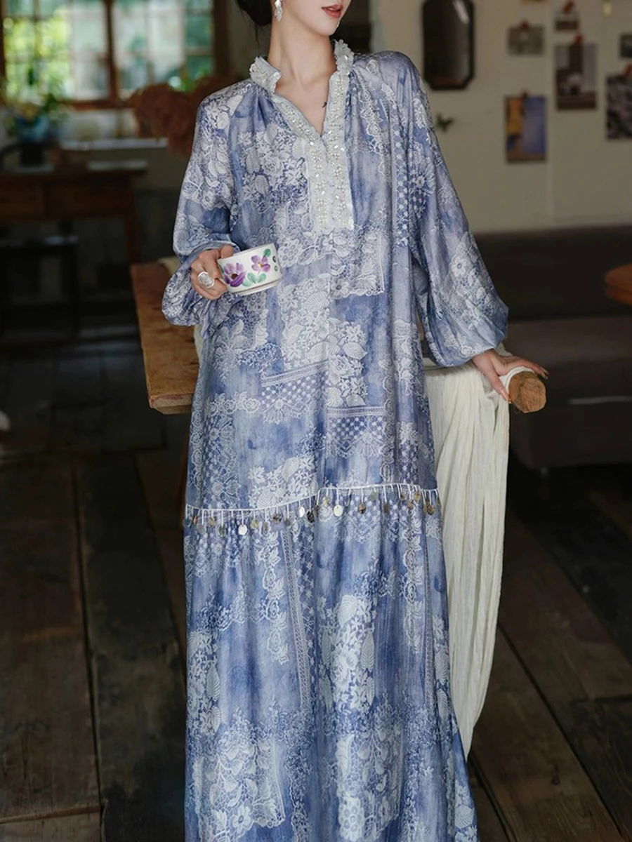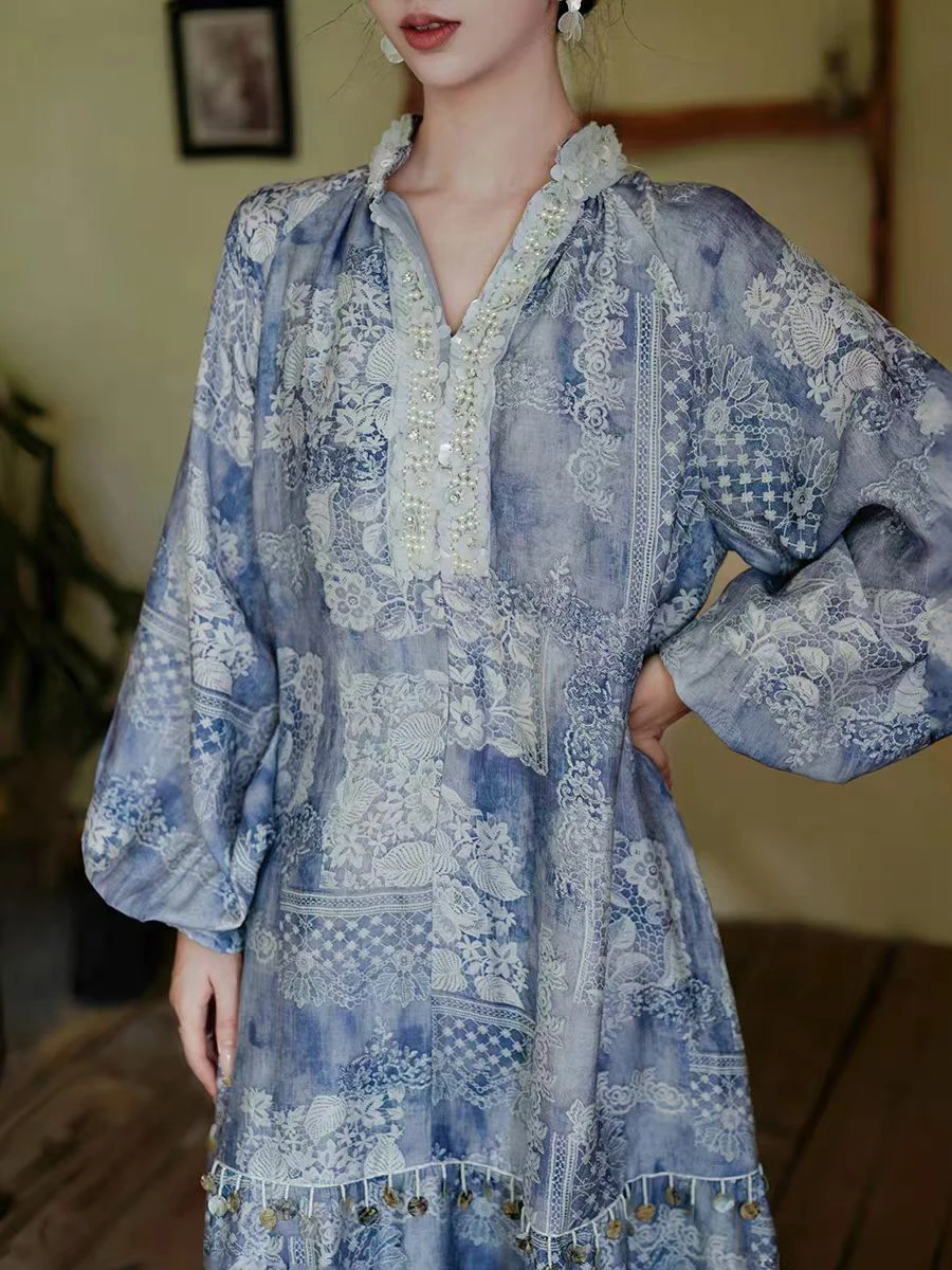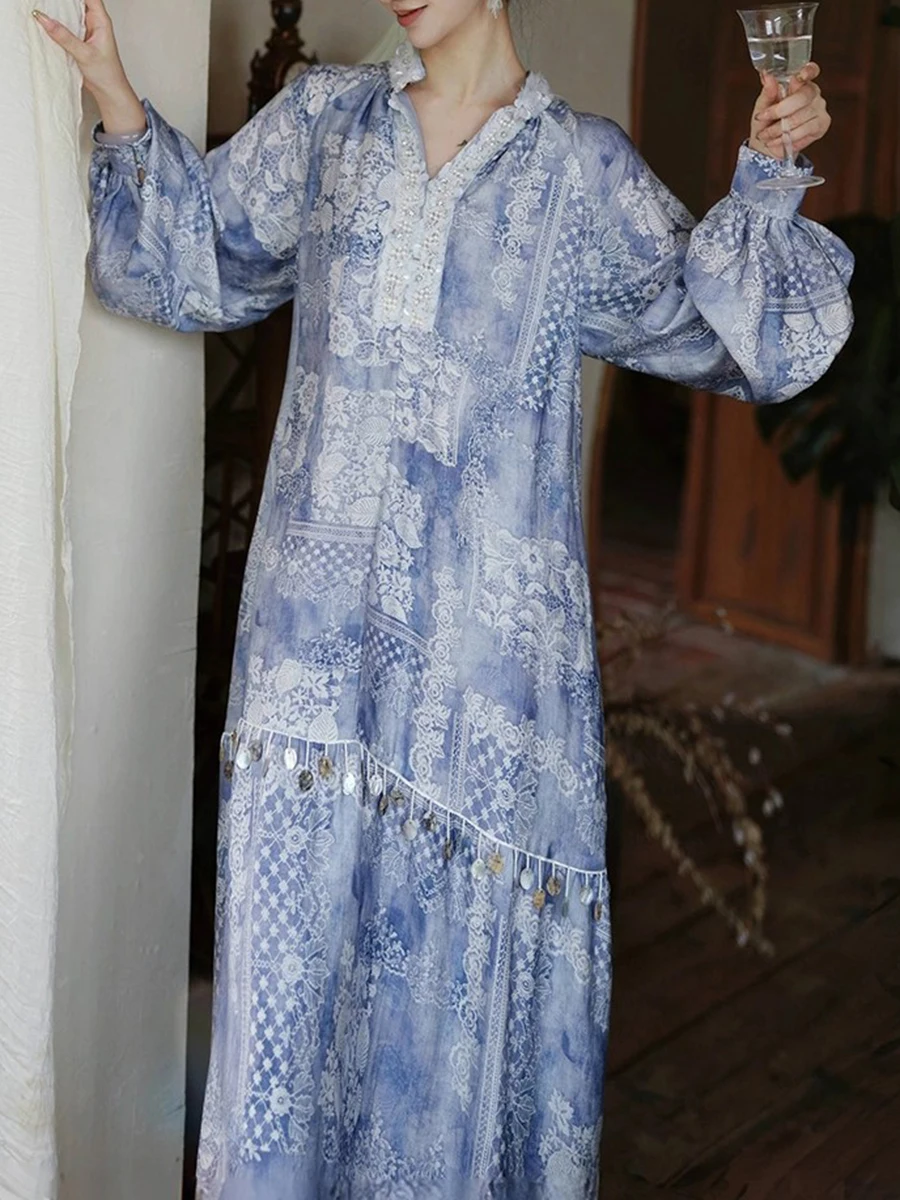 TWOTWINSTYLE Printing Loose Spliced Sequins Elegant Dresses for Women V Neck Long Sleeves Patchwork Hot Fix Dress Female Fashion