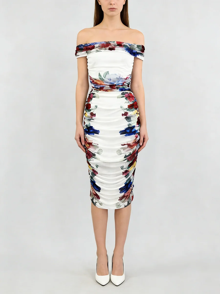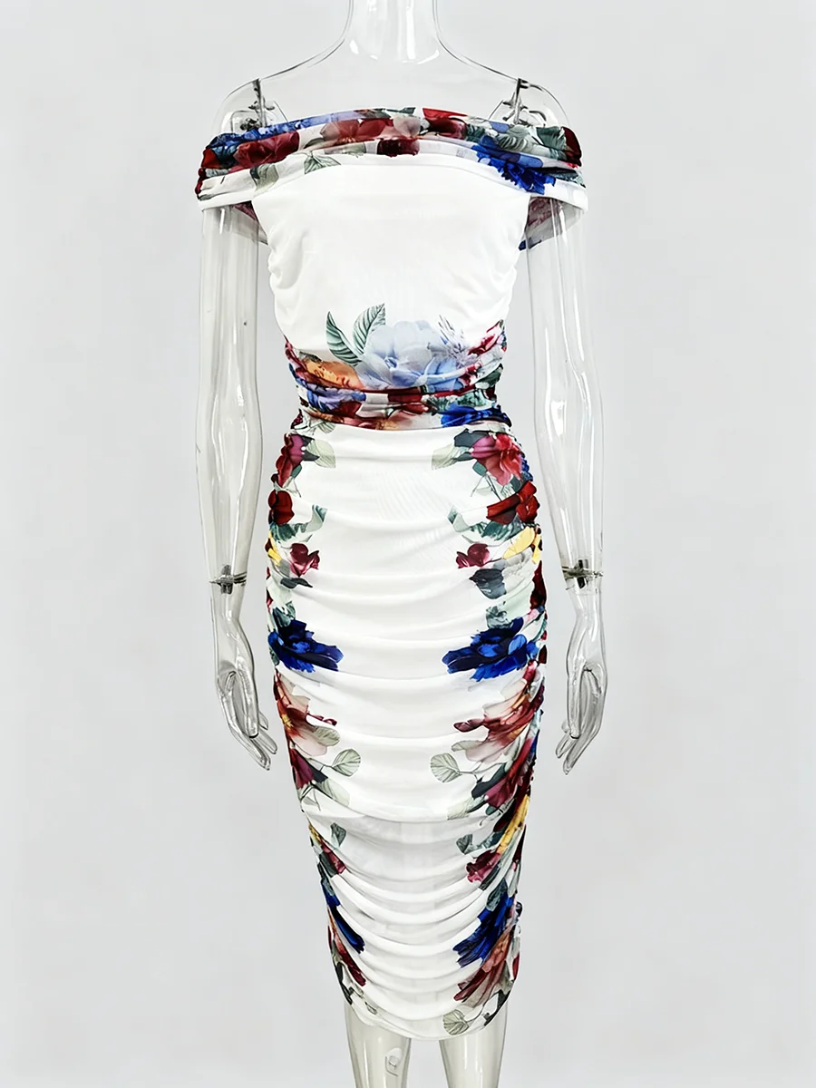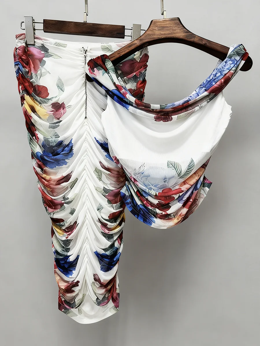TWOTWINSTYLE Printing Sheer Spliced Mesh Slimming Dresses for Women Slash Neck Off Shoulder Patchwork Folds Fashion Dress Female