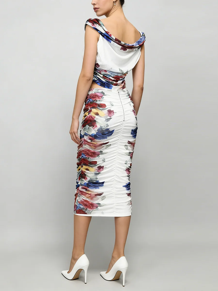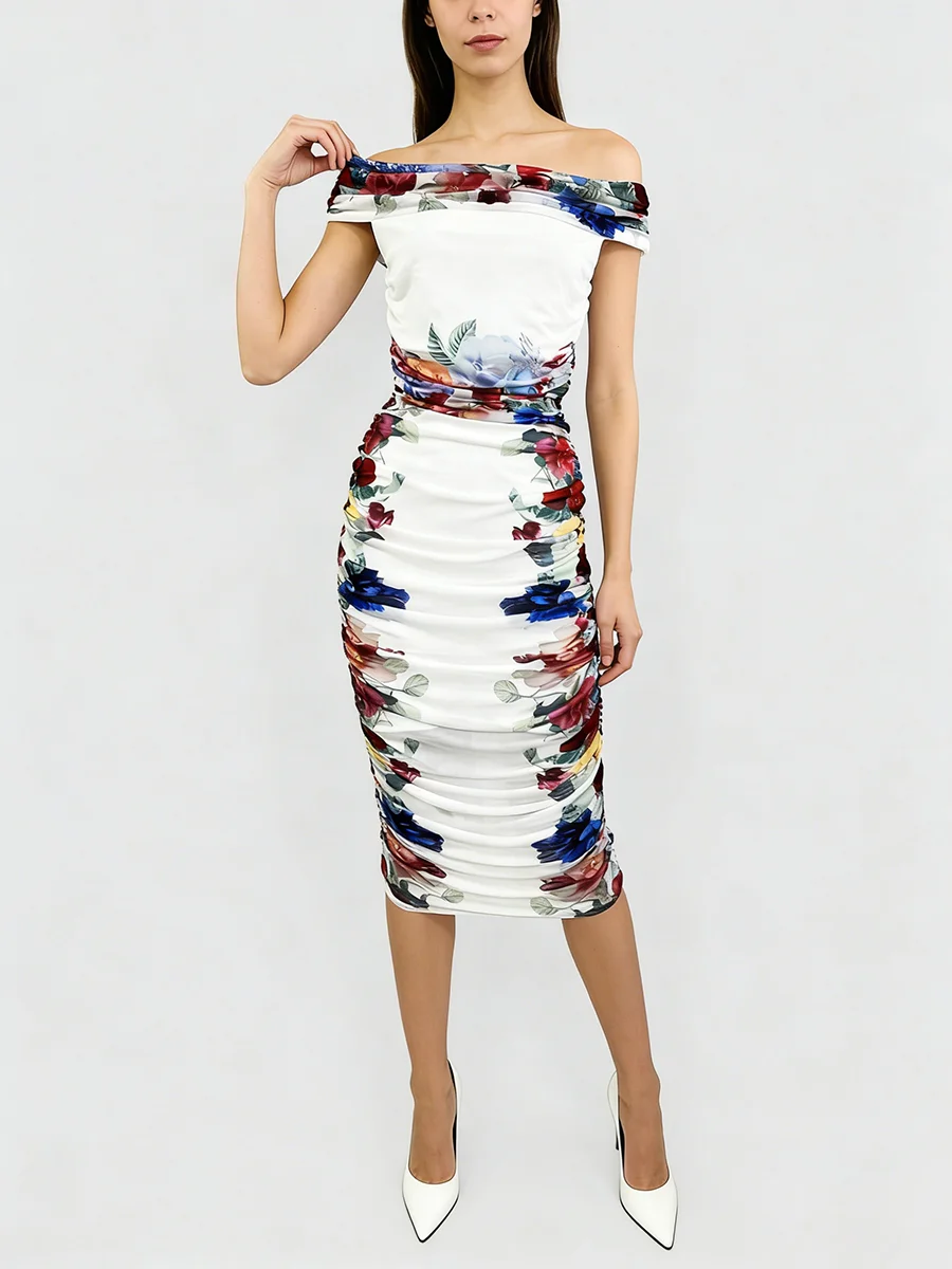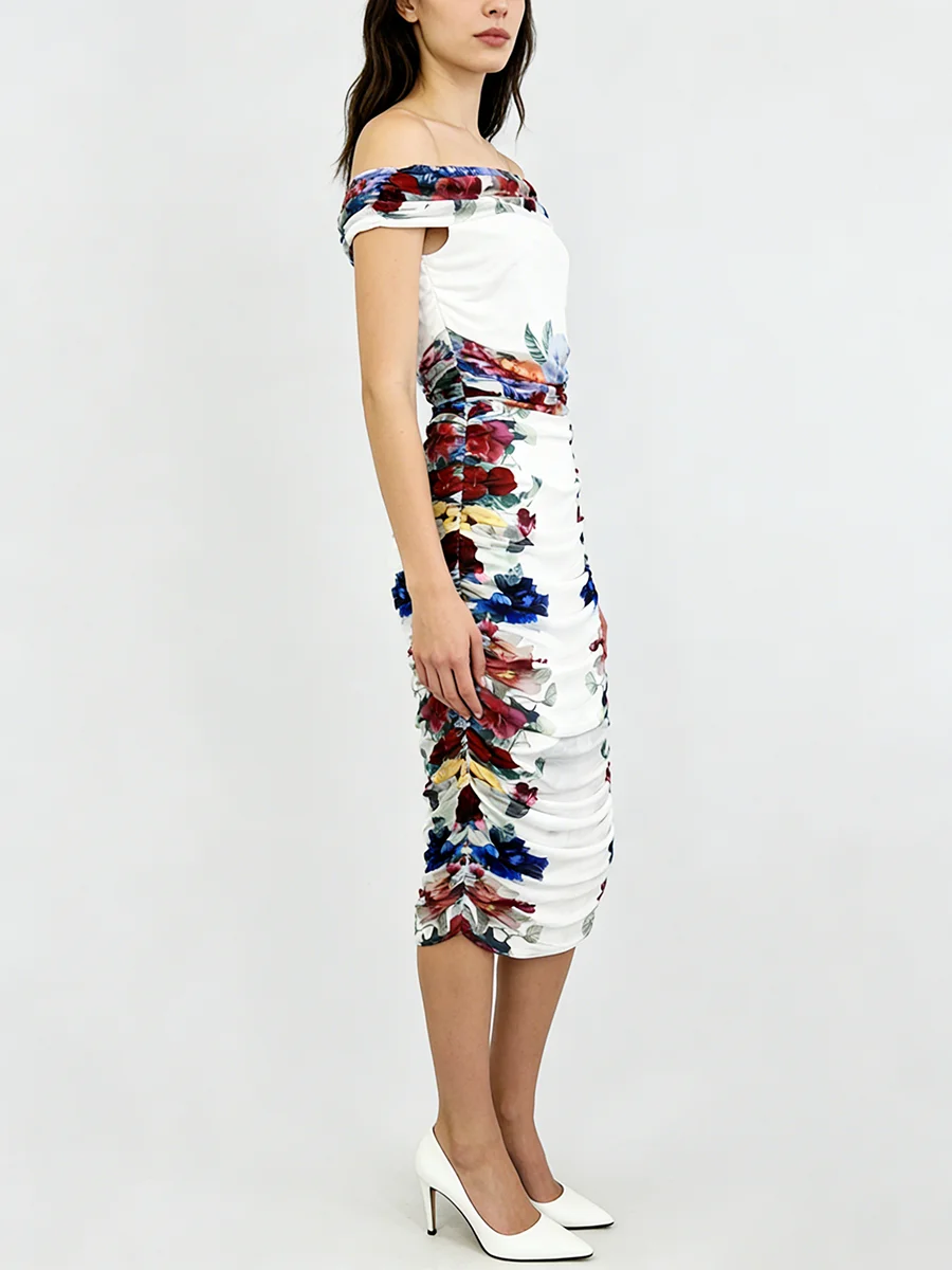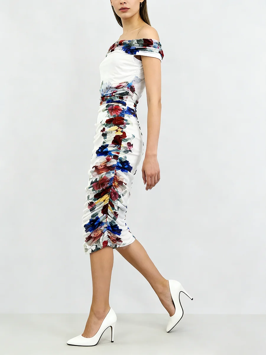 TWOTWINSTYLE Printing Sheer Spliced Mesh Slimming Dresses for Women Slash Neck Off Shoulder Patchwork Folds Fashion Dress Female