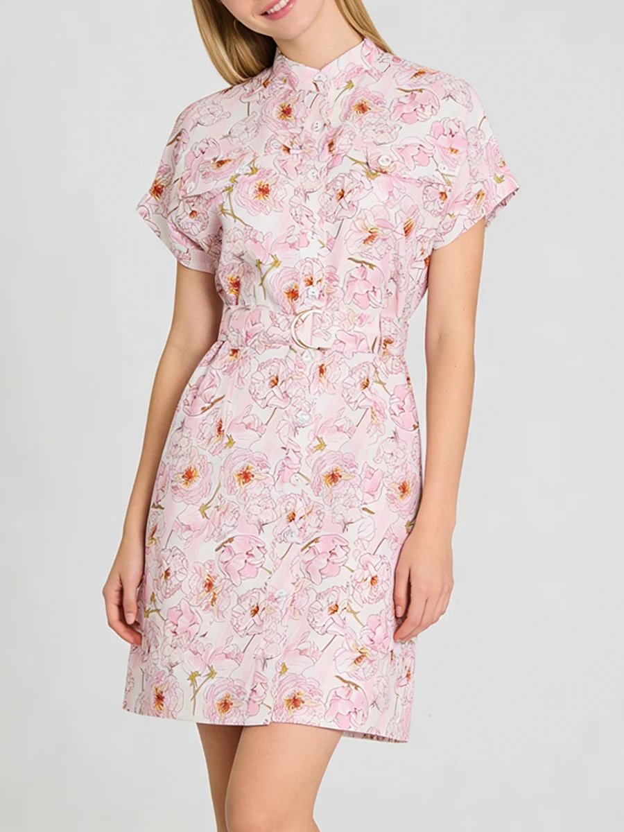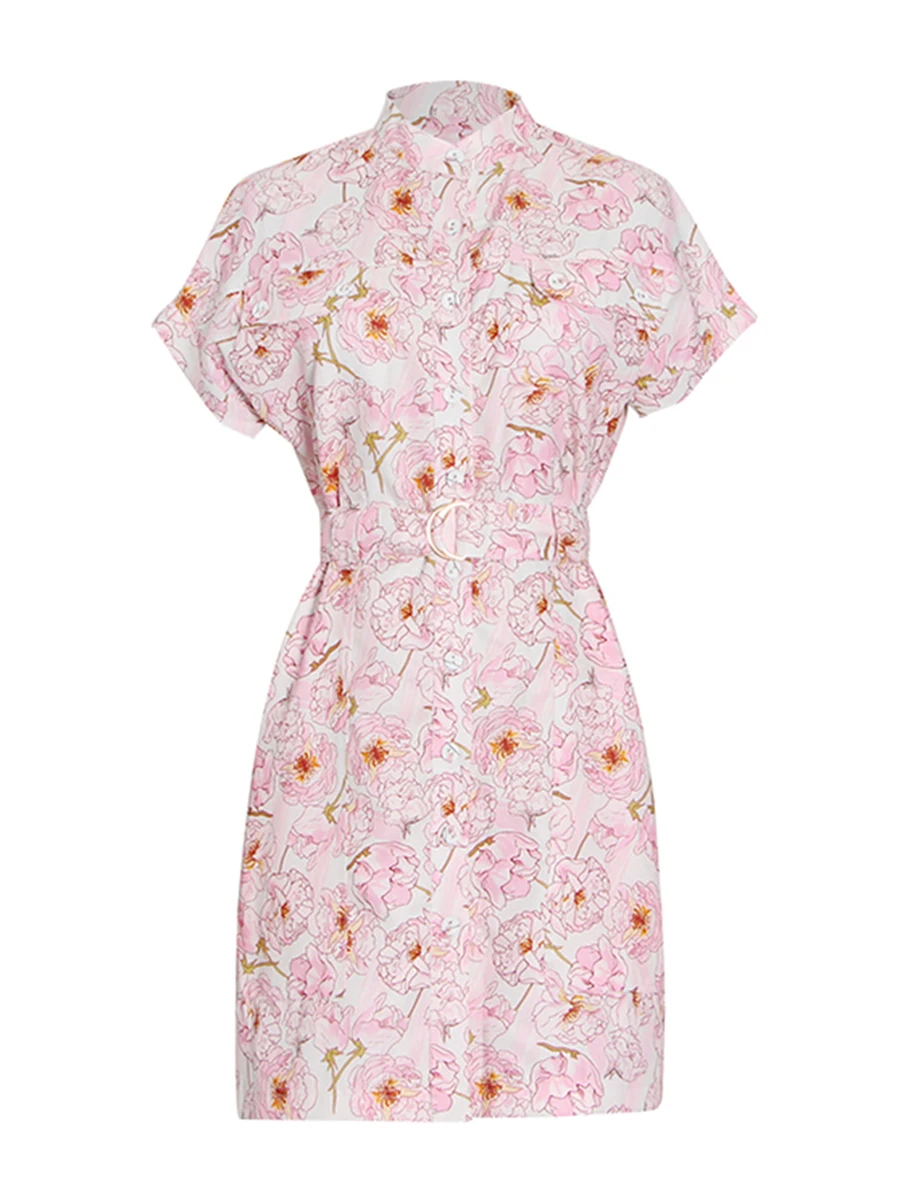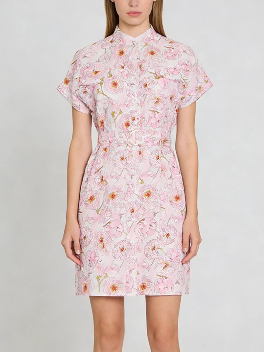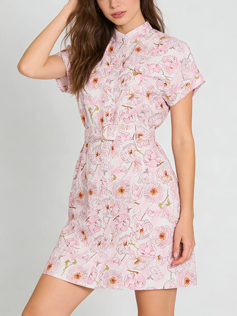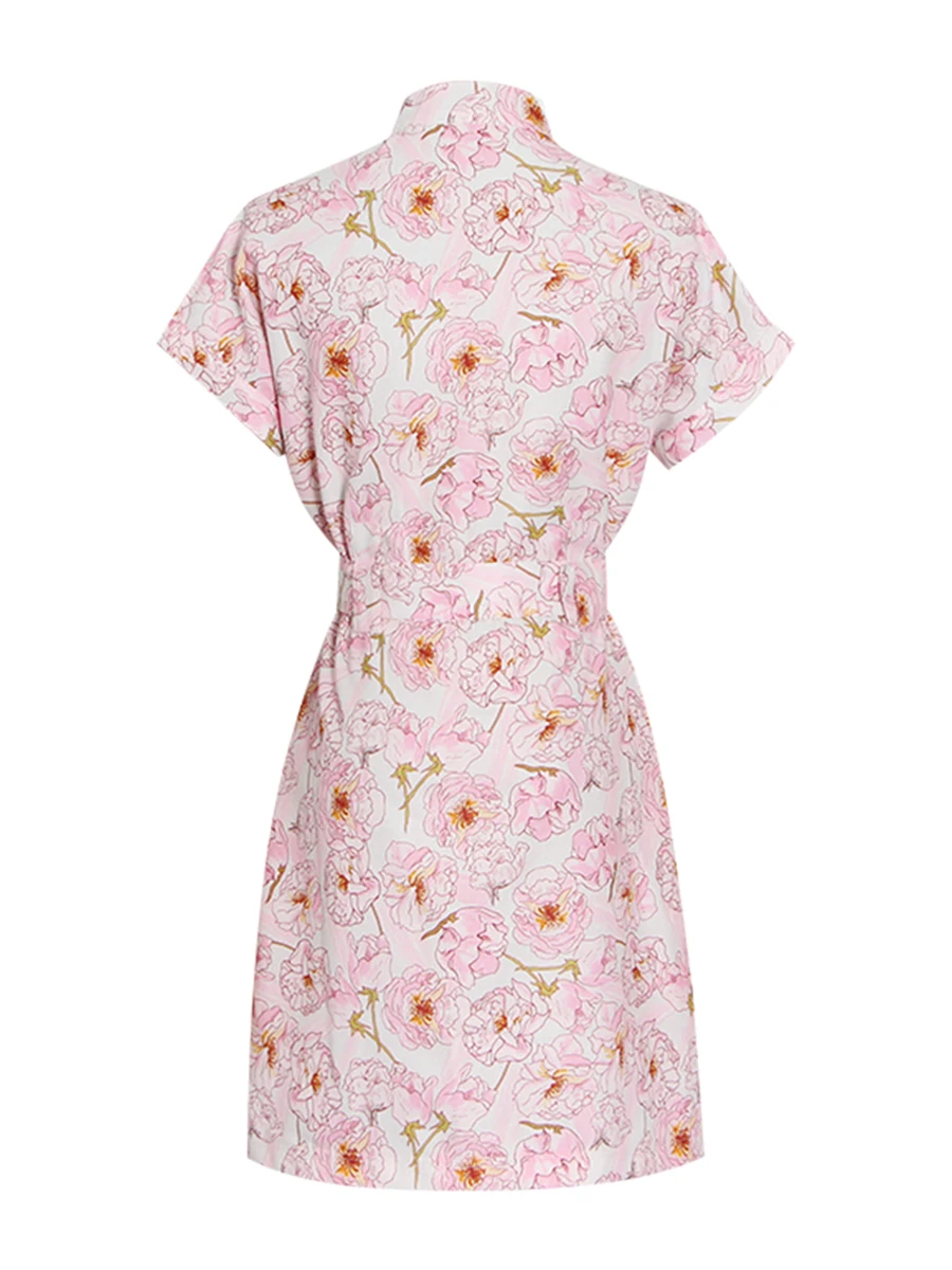 TWOTWINSTYLE Printing Slimming Spliced Belt Elegant Dress for Women Stand Neck Short Sleeves High Waist Fashion Dresses Female