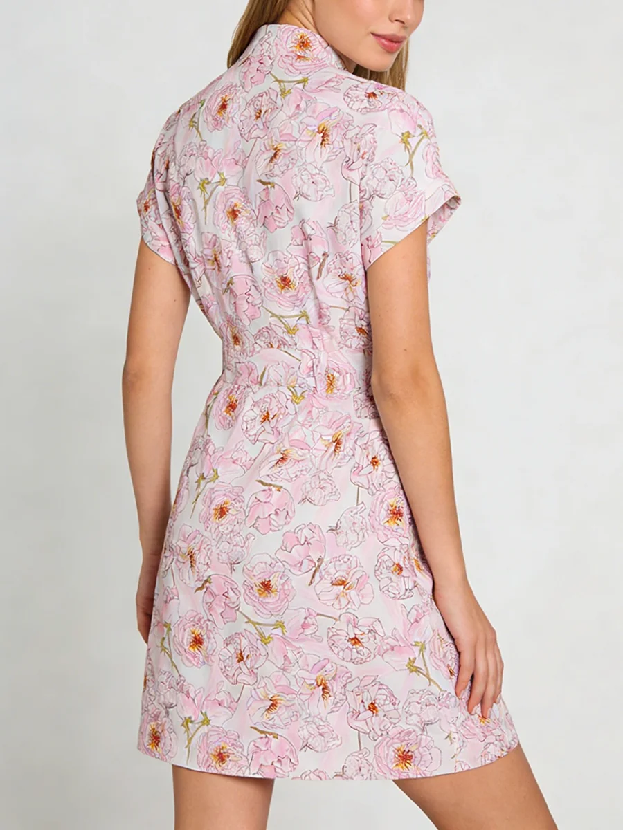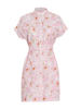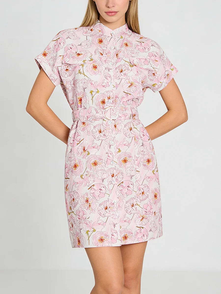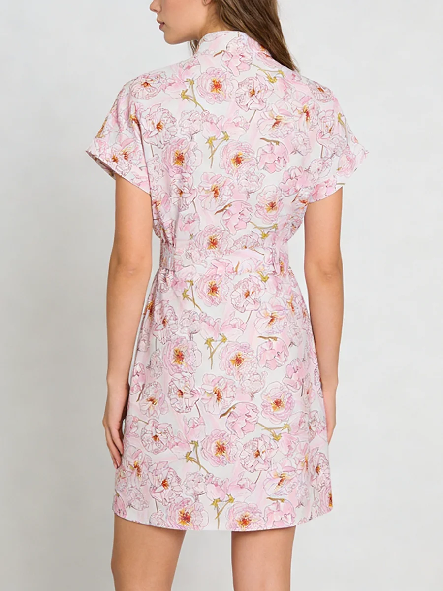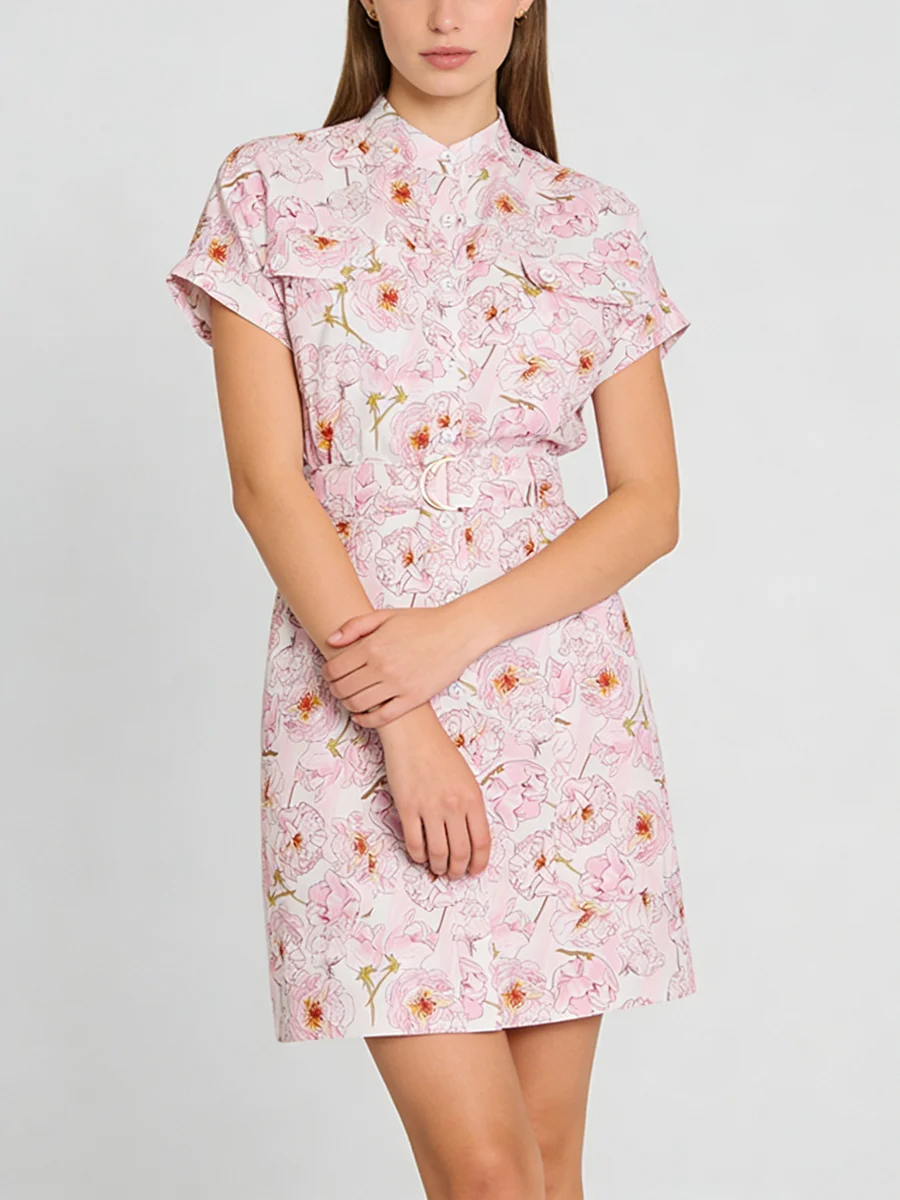 TWOTWINSTYLE Printing Slimming Spliced Belt Elegant Dress for Women Stand Neck Short Sleeves High Waist Fashion Dresses Female