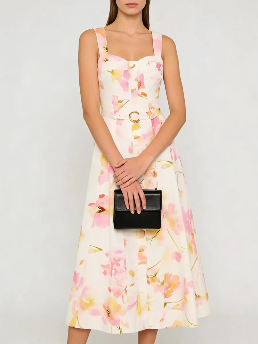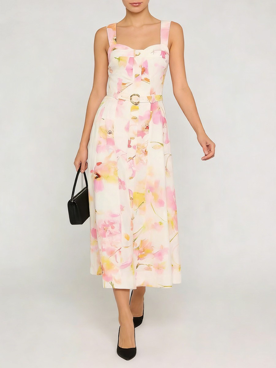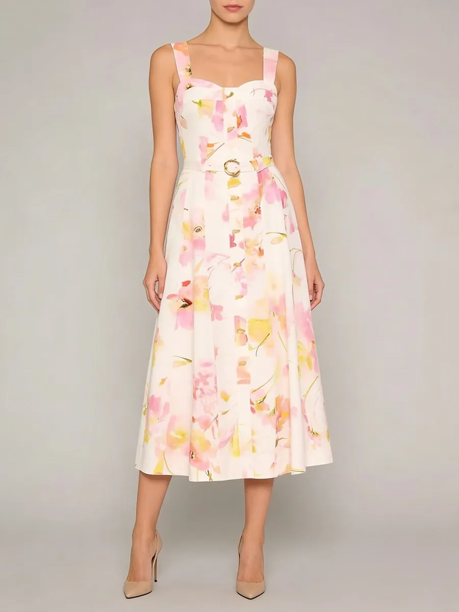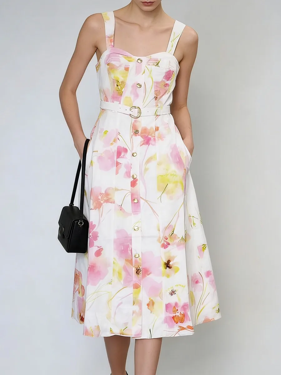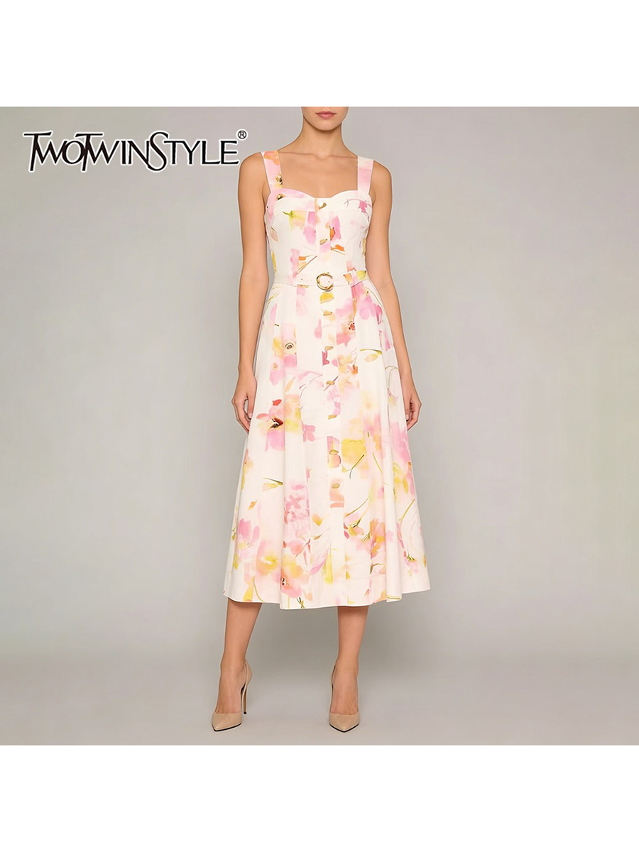 TWOTWINSTYLE Printing Spliced Metal Buttons Fashion Dresses for Women Square Neck Sleeveless Tunic Patchwork Belt Dress Female