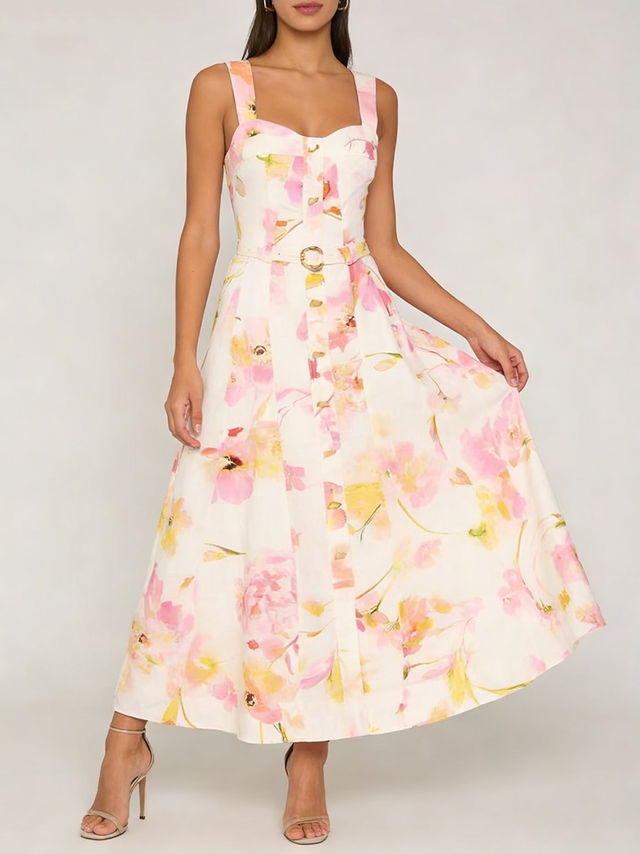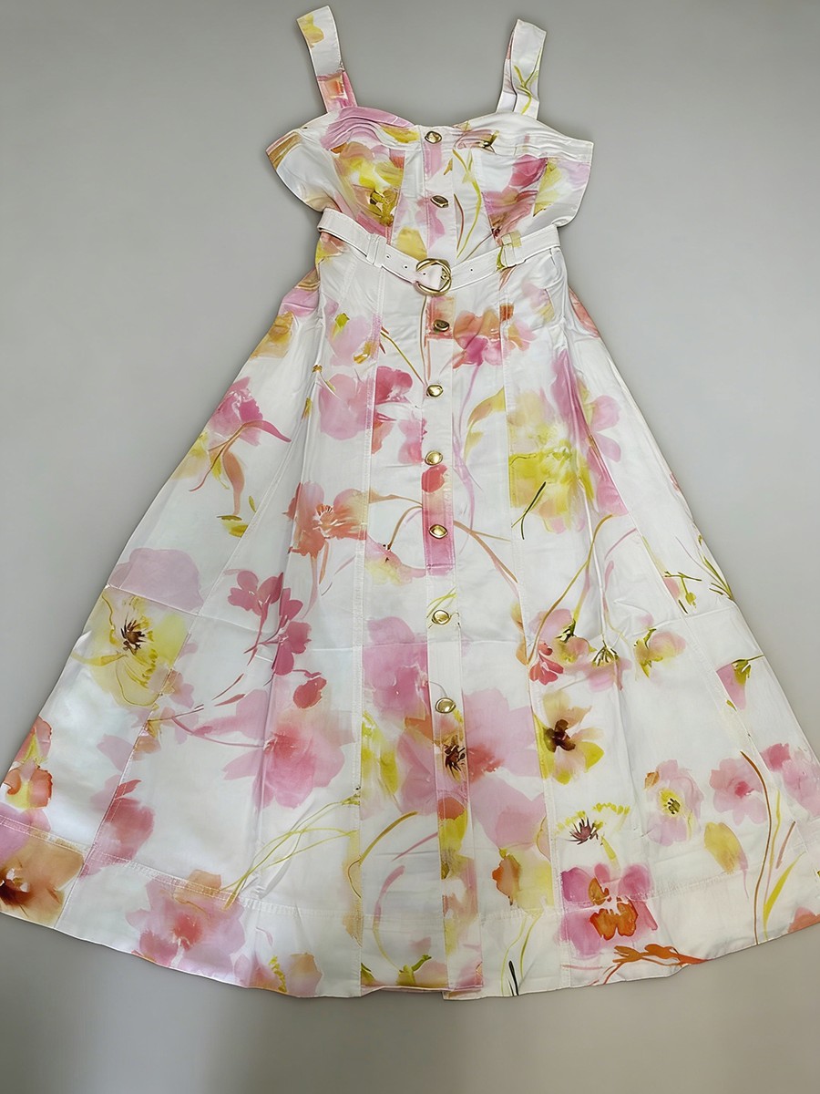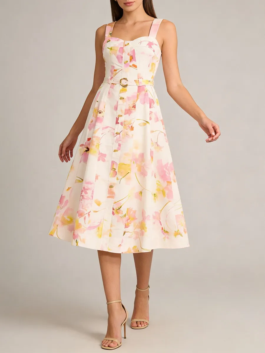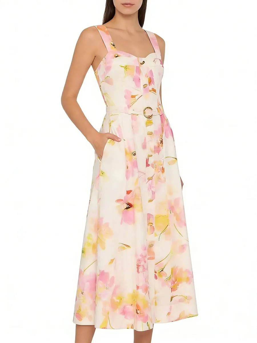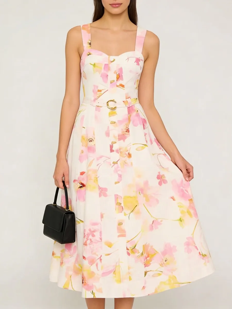 TWOTWINSTYLE Printing Spliced Metal Buttons Fashion Dresses for Women Square Neck Sleeveless Tunic Patchwork Belt Dress Female