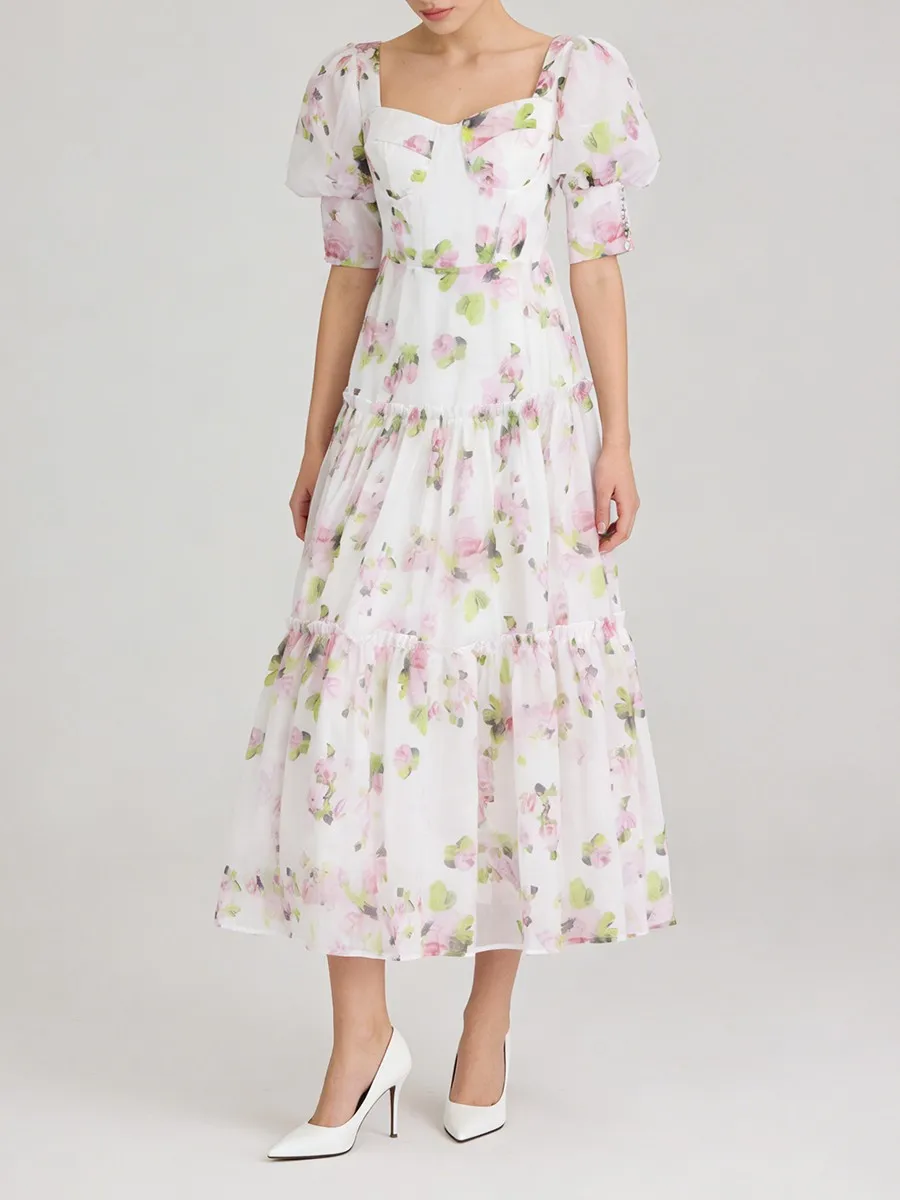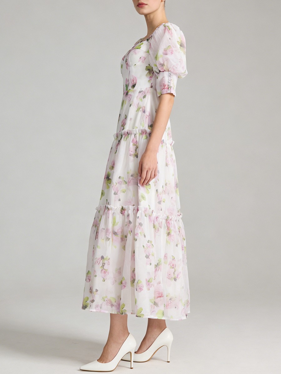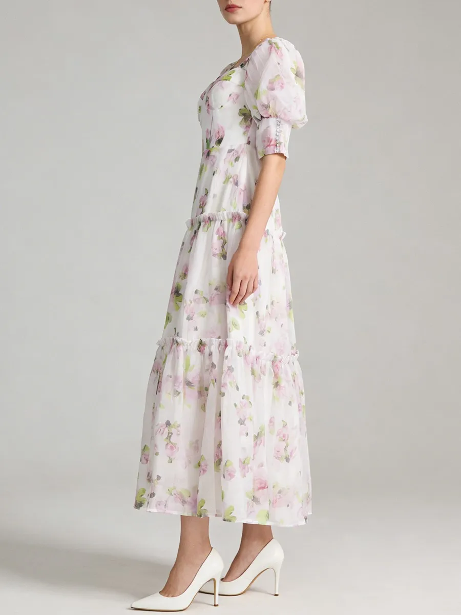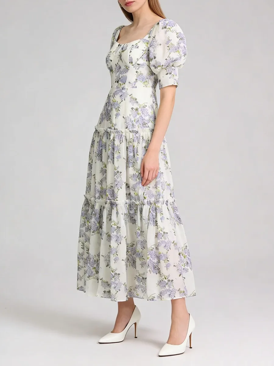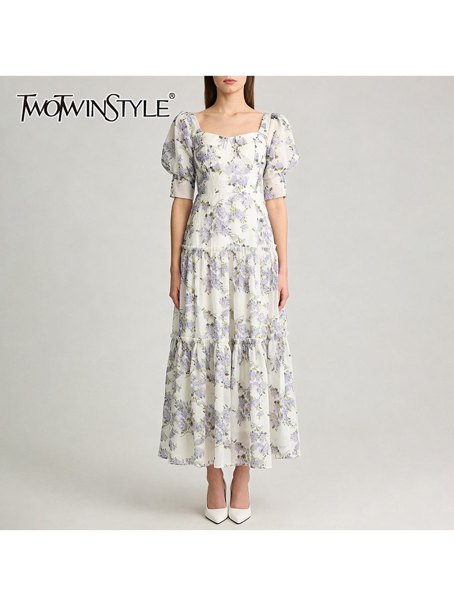 TWOTWINSTYLE Printing Spliced Ruched Slimming Long Dress for Women Slash Neck Half Sleeves High Waist Elegant Dresses Female New