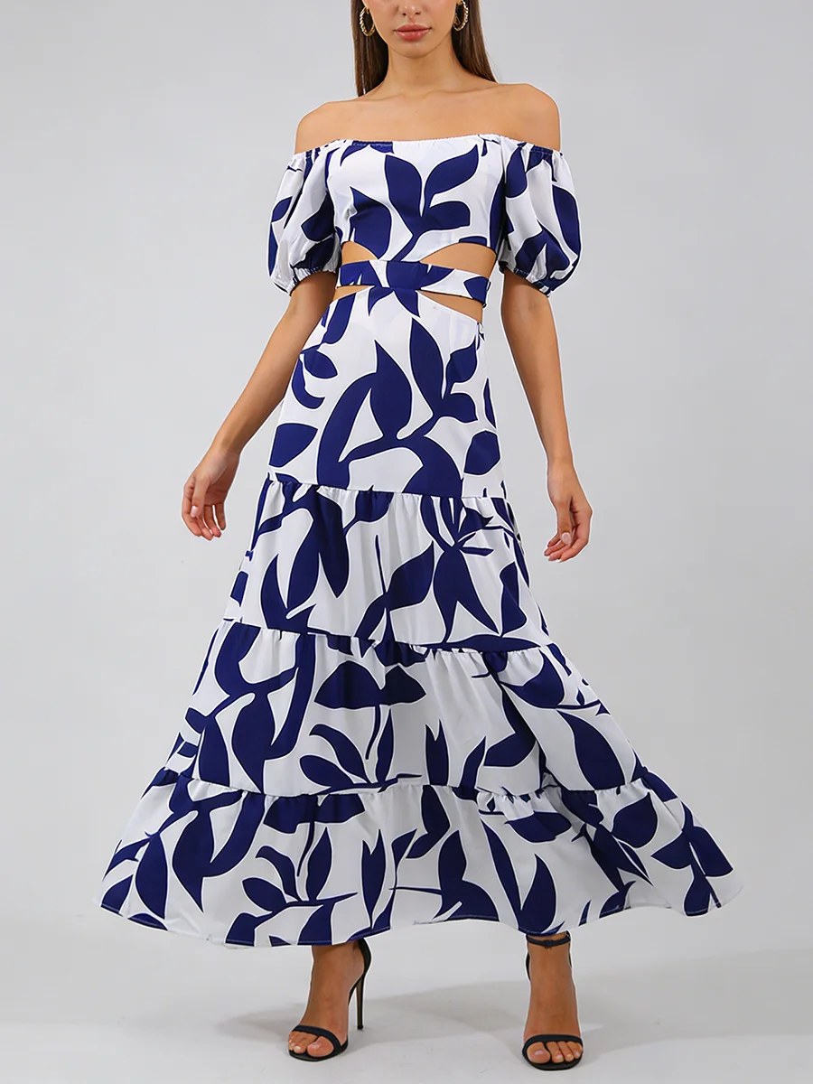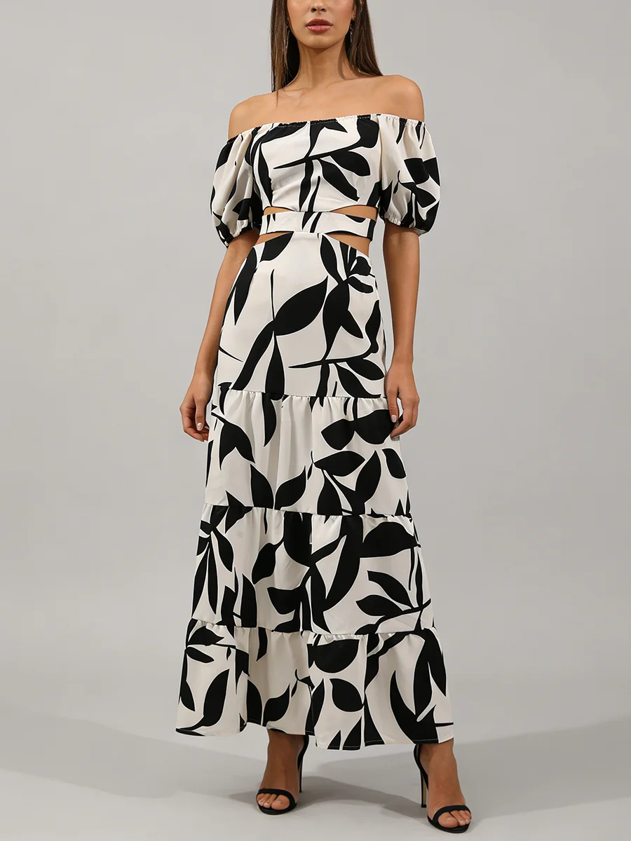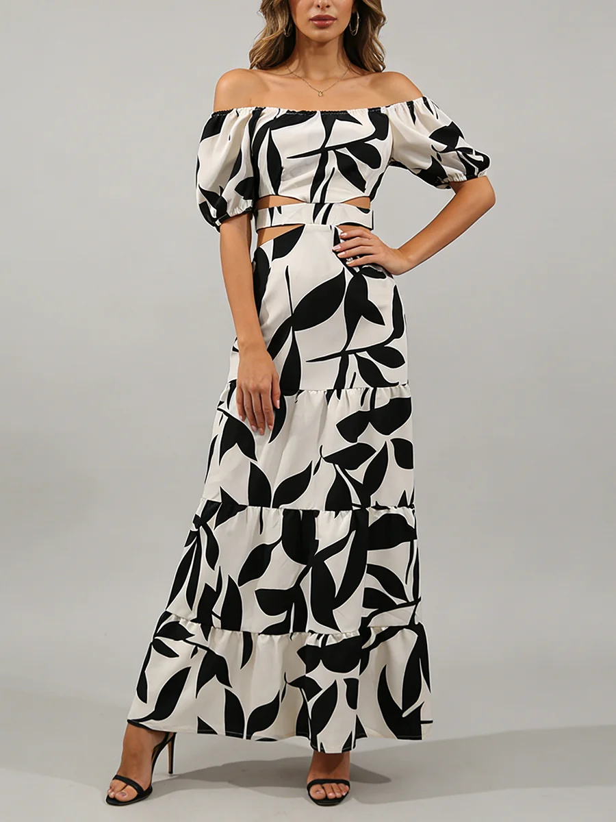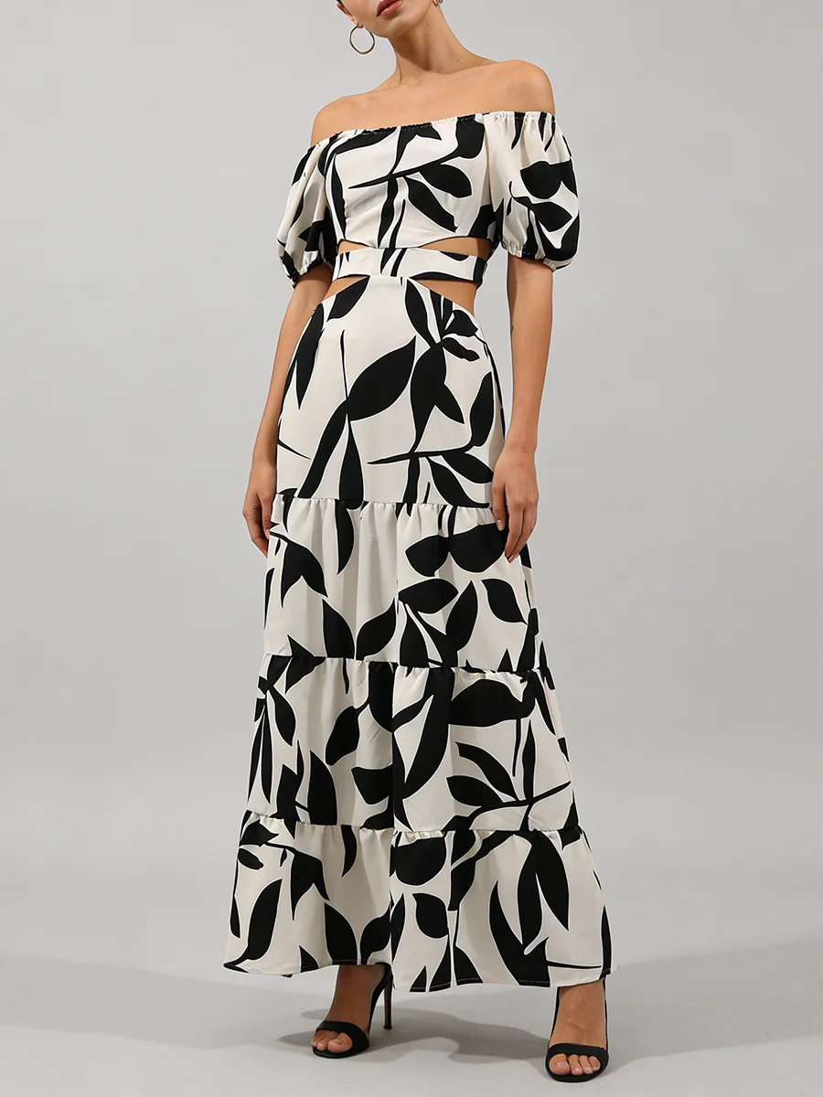 TWOTWINSTYLE Printing Spliced Shirring Fashion Long Dresses for Women Slash Neck Short Sleeve High Waist Hollow Out Dress Female