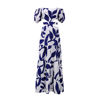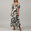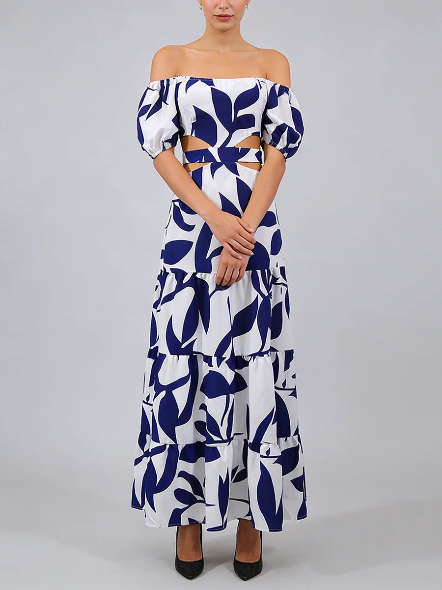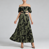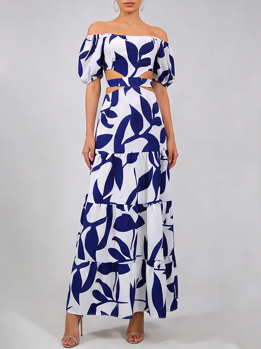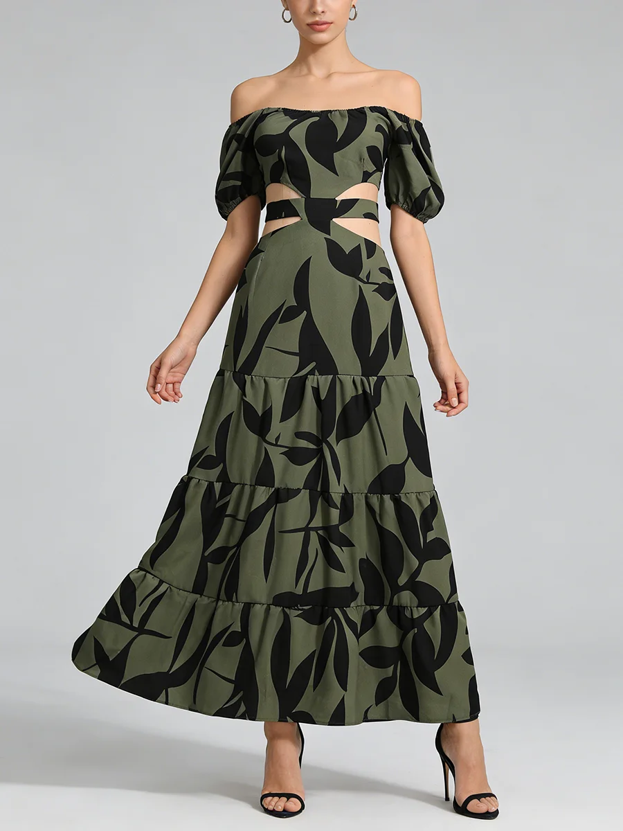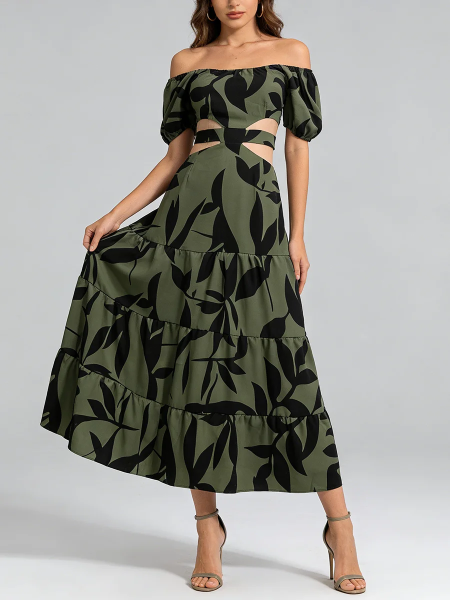 TWOTWINSTYLE Printing Spliced Shirring Fashion Long Dresses for Women Slash Neck Short Sleeve High Waist Hollow Out Dress Female